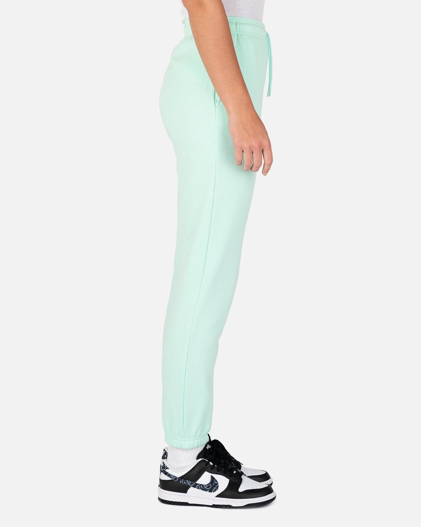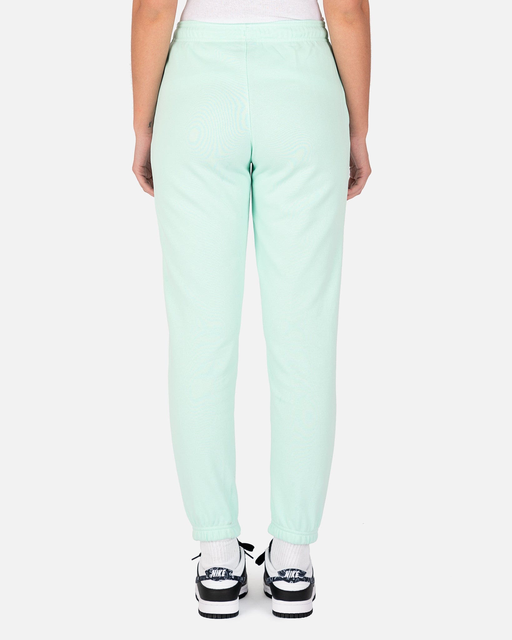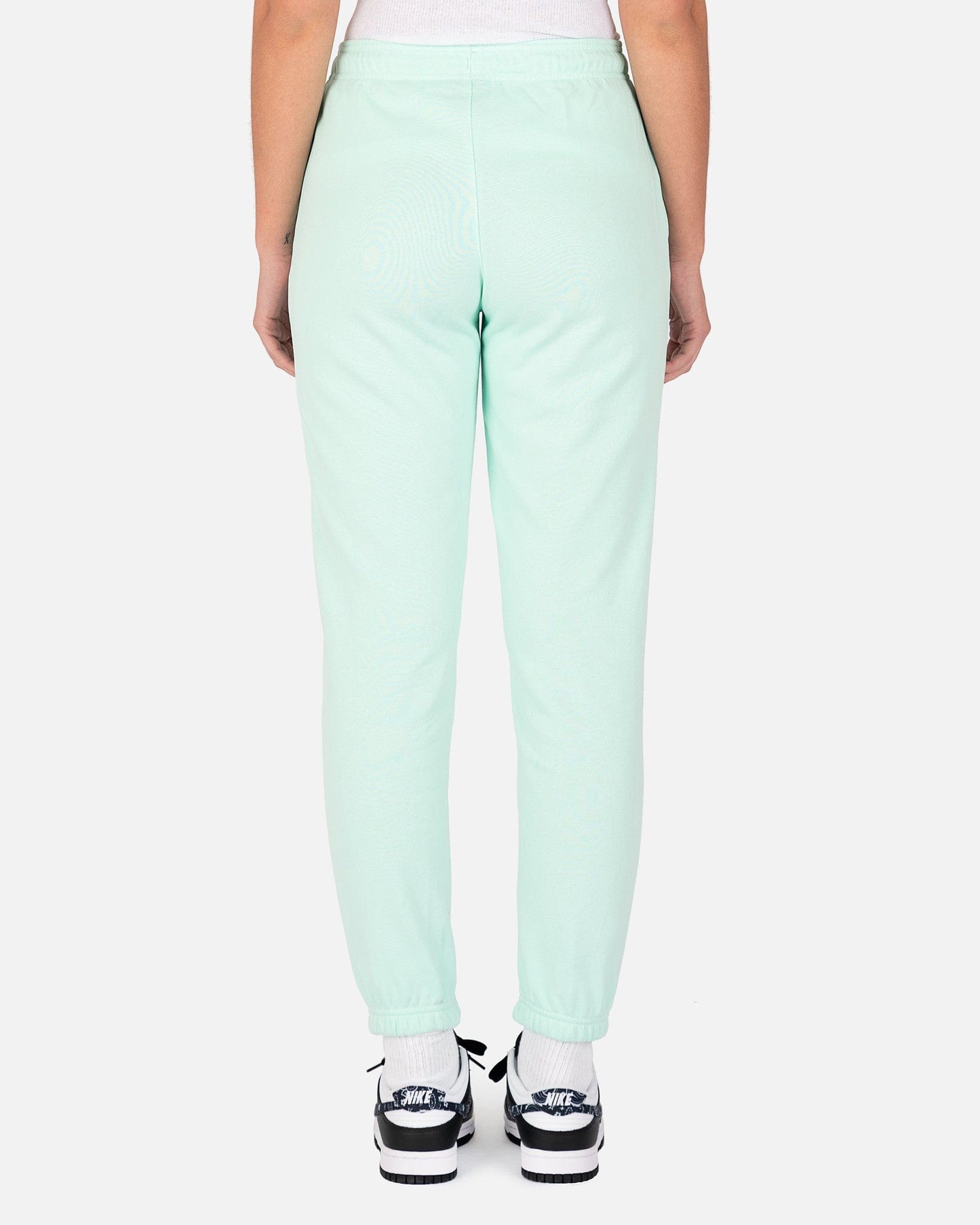 Jordan women's fleece sweatpants in mint green. These pants have an elasticized waist and a regular fit, with the Jumpman logo patch on the front left thigh.
