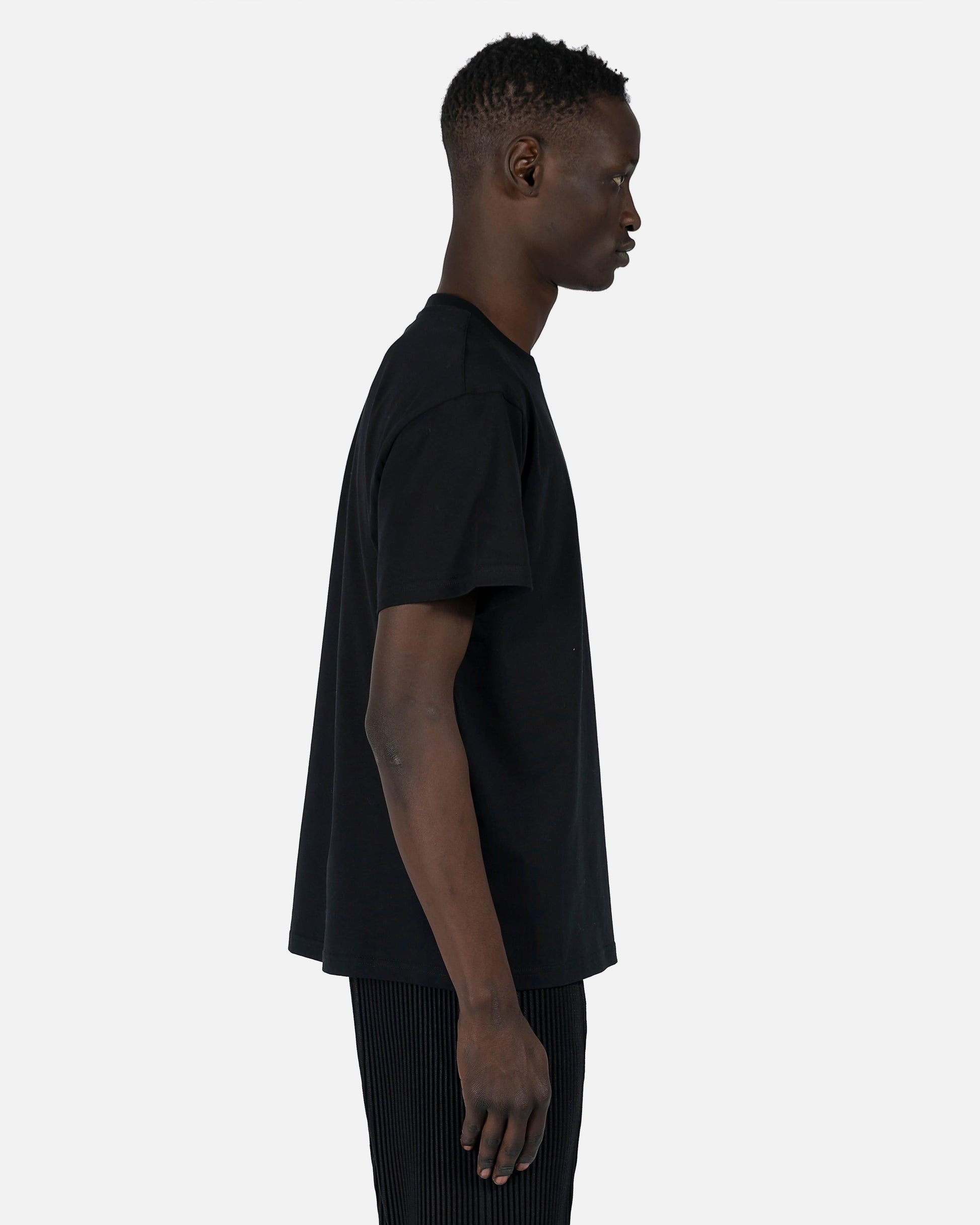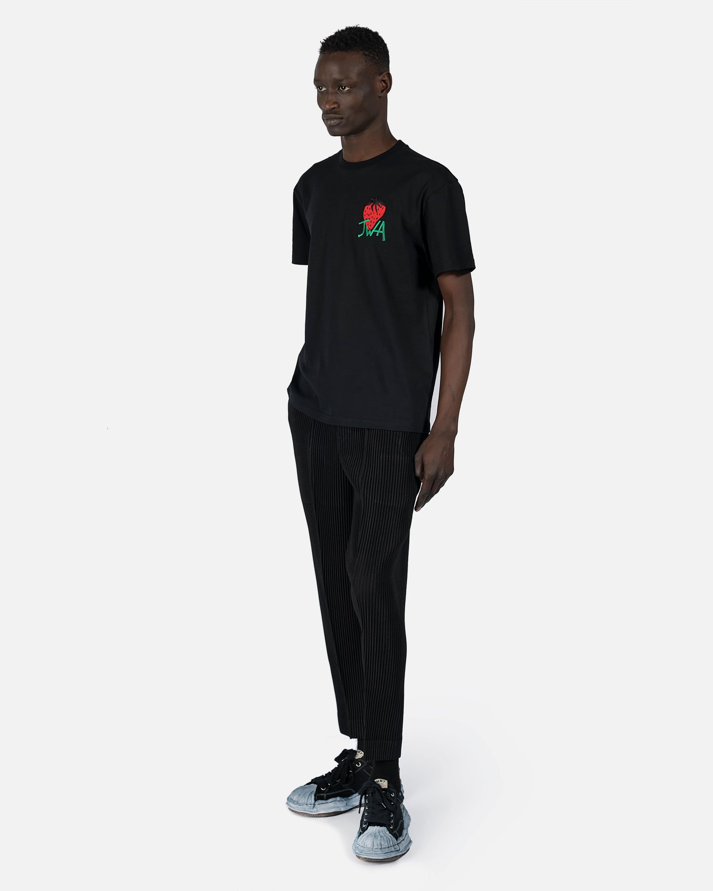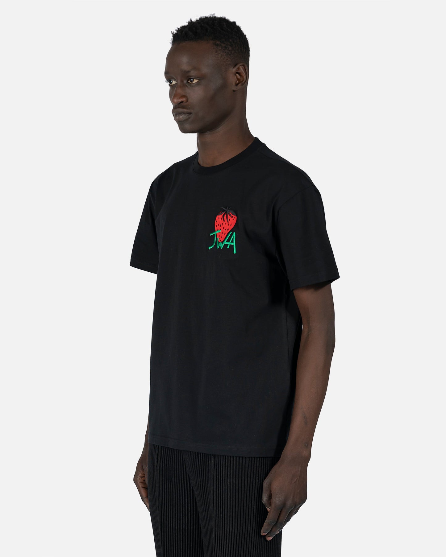JW Anderson men's embroidered graphic t-shirt in black. This shirt features logo embroidery of a strawberry in red above JWA embroidered in green directly below. Made with 100% cotton, this shirt is a great basic to elevate any wardrobe.