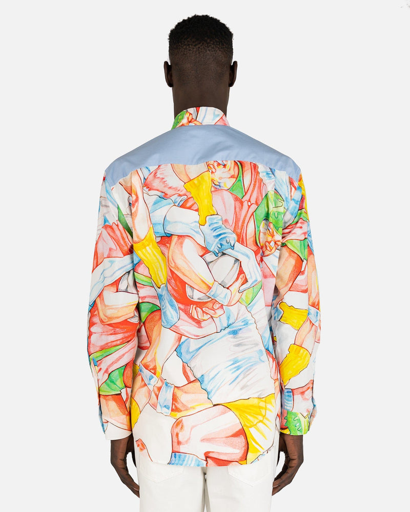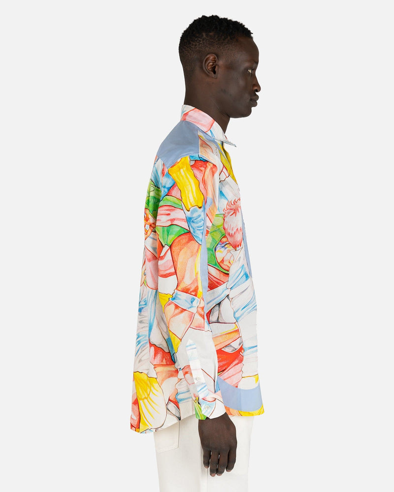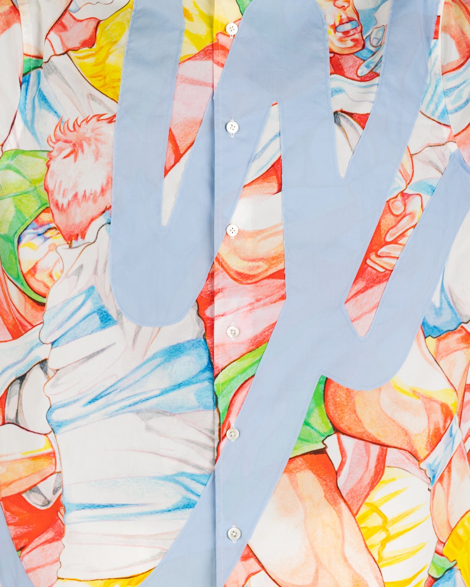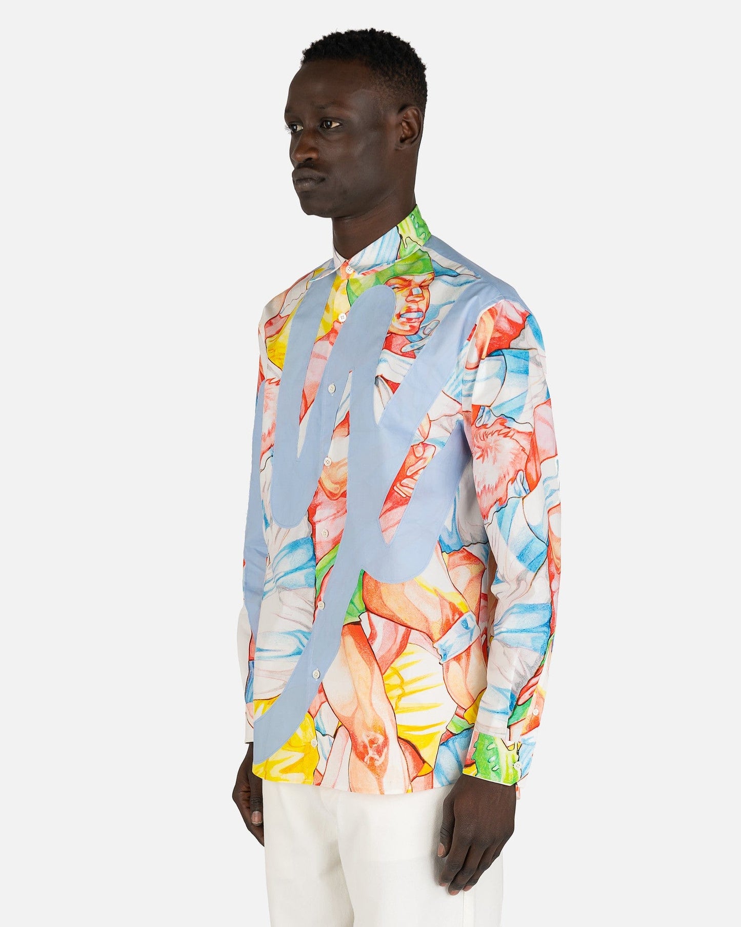 JW Anderson men's shirt with oversized anchor applique. This relaxed fit, classic button up shirt is modernized with an allover print of a rugby player by artist Pol Anglada. Atop this, a large, sheer applique of the JW logo is placed. The top uses front button closure with mop buttons.