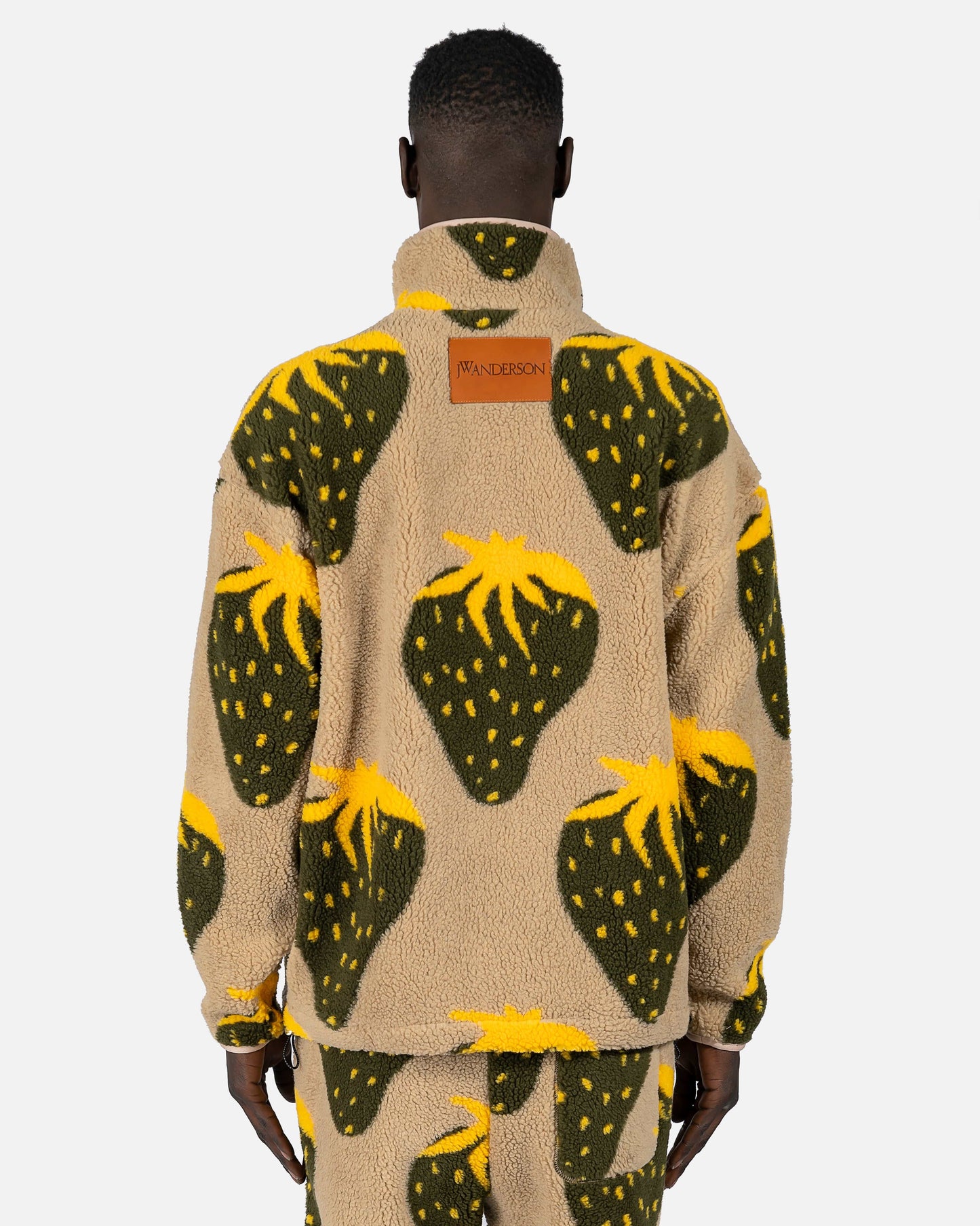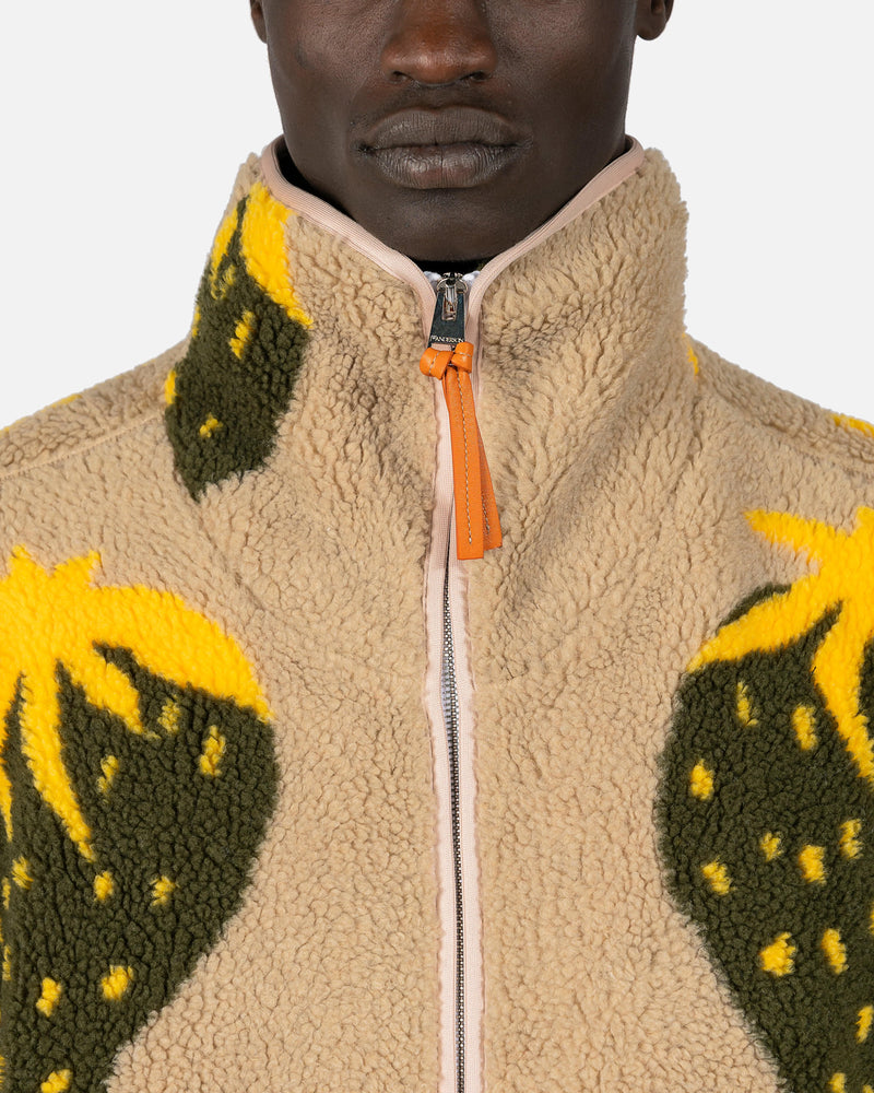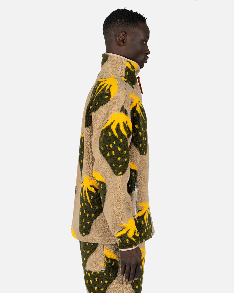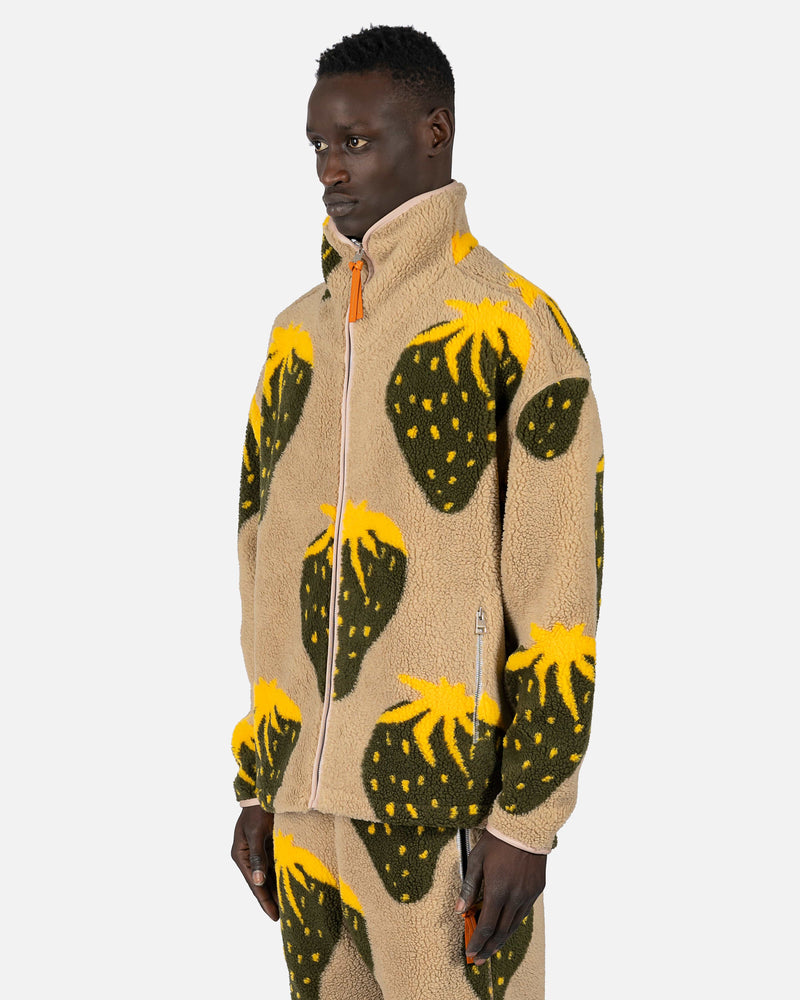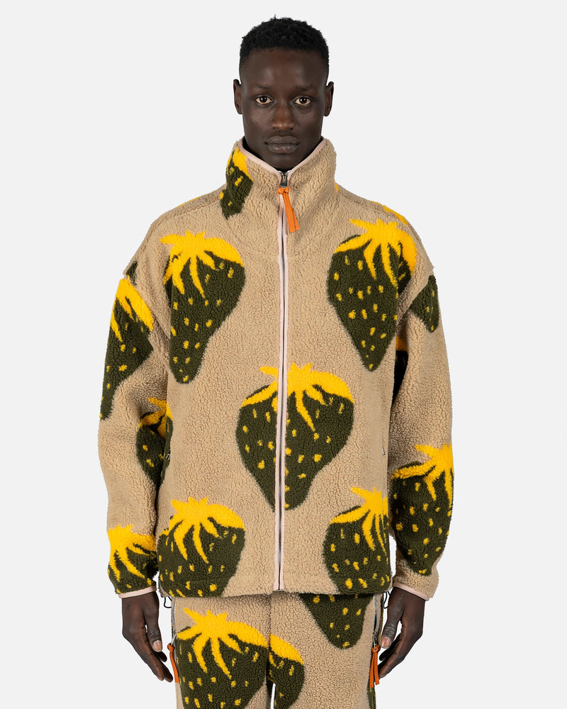 JW Anderson men's strawberry print front zip jacket in a sand color. This playful jacket is a statement piece that balance boldness with comfort. Made with a soft fleece material, this jacket features an allover strawberry print in a deep green and yellow. With a front zip closure, side zip pockets and a high neck, this jacket is easy to throw on over anything and is bound to keep you cozy.