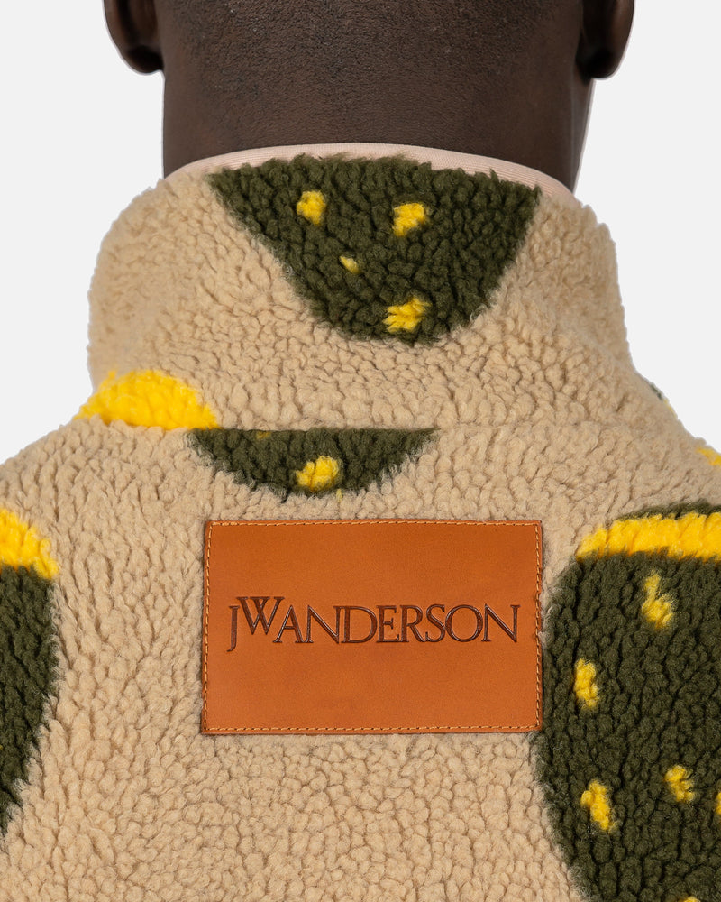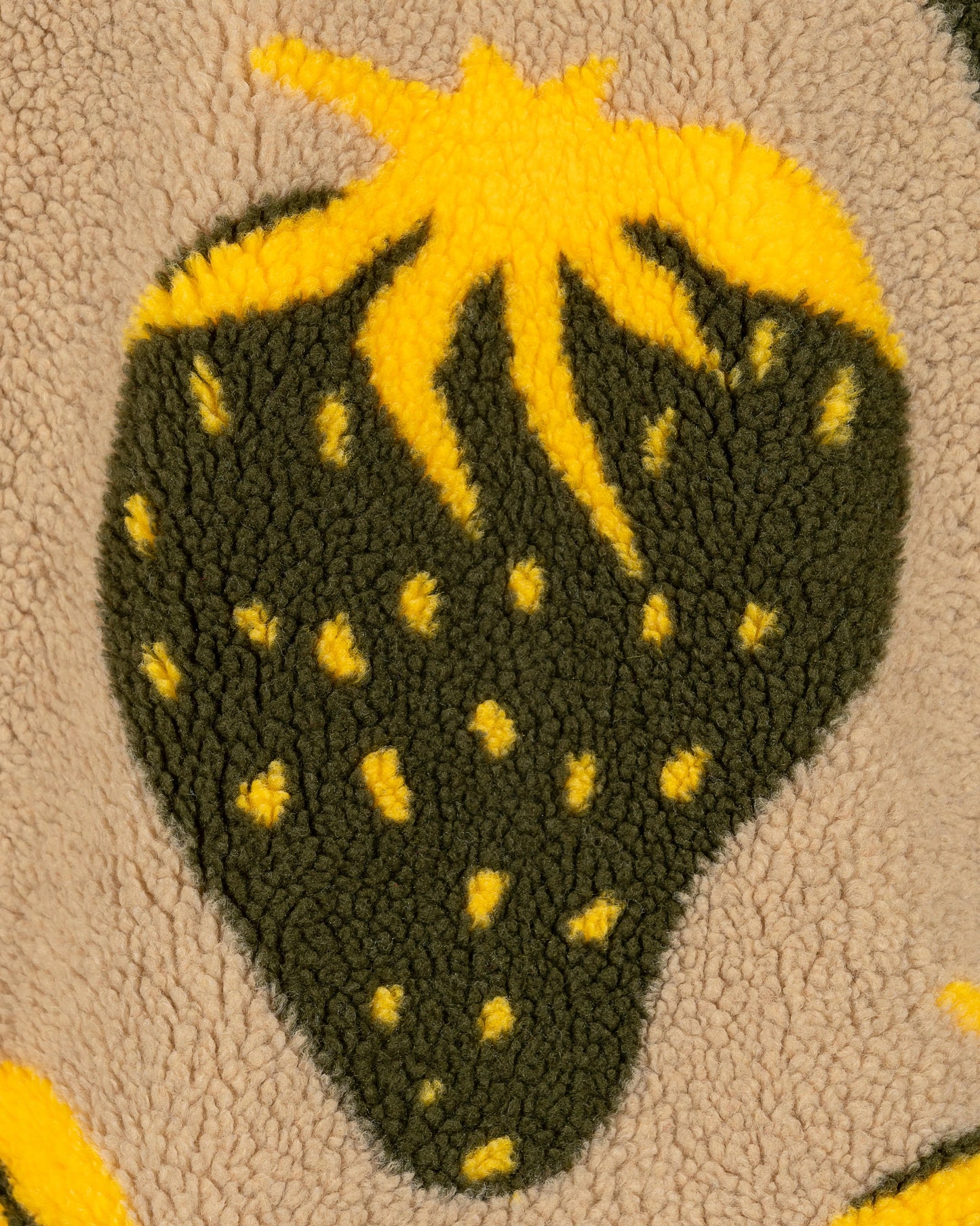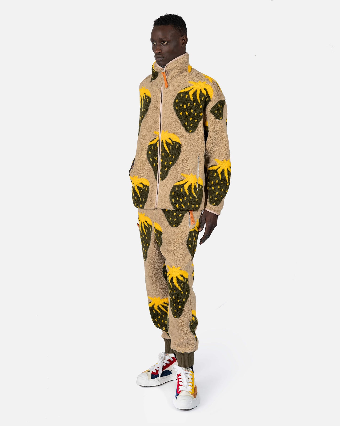 JW Anderson men's strawberry print front zip jacket in a sand color. This playful jacket is a statement piece that balance boldness with comfort. Made with a soft fleece material, this jacket features an allover strawberry print in a deep green and yellow. With a front zip closure, side zip pockets and a high neck, this jacket is easy to throw on over anything and is bound to keep you cozy.