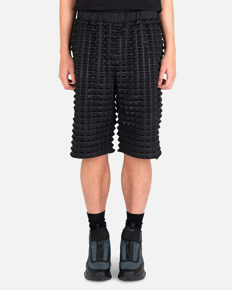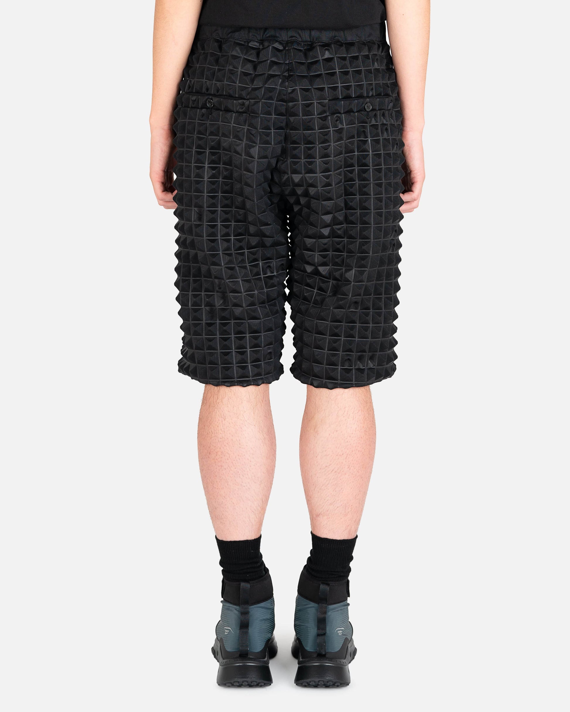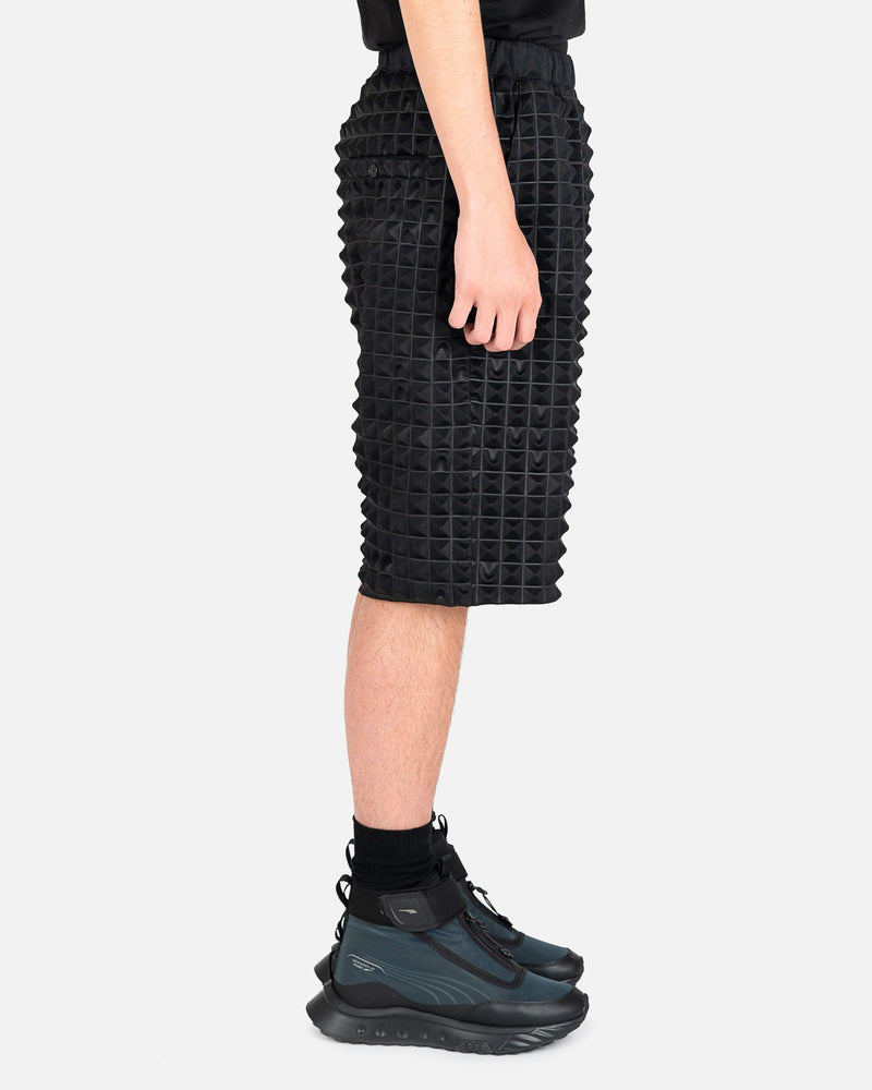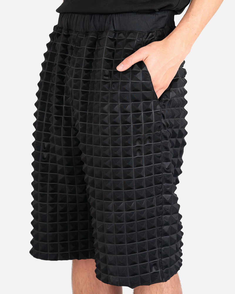 KANGHYUK men's pyramid textured shorts in black. These shorts fall slightly below the knee and have an elasticized waistband. There are two side slit pockets and two back welt pockets.