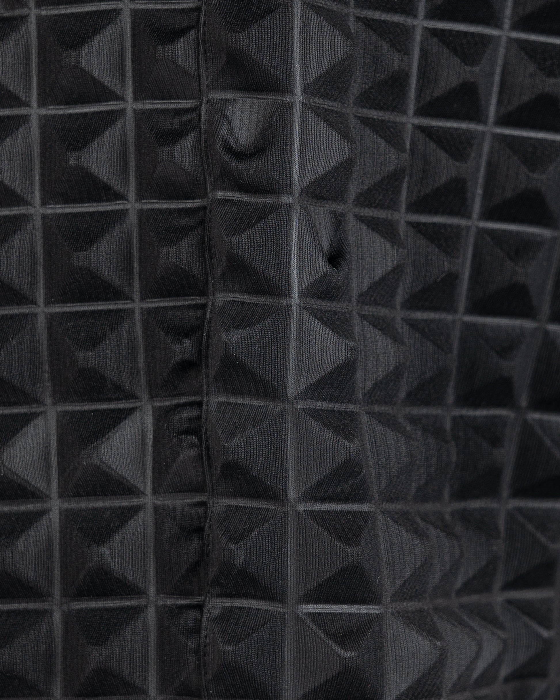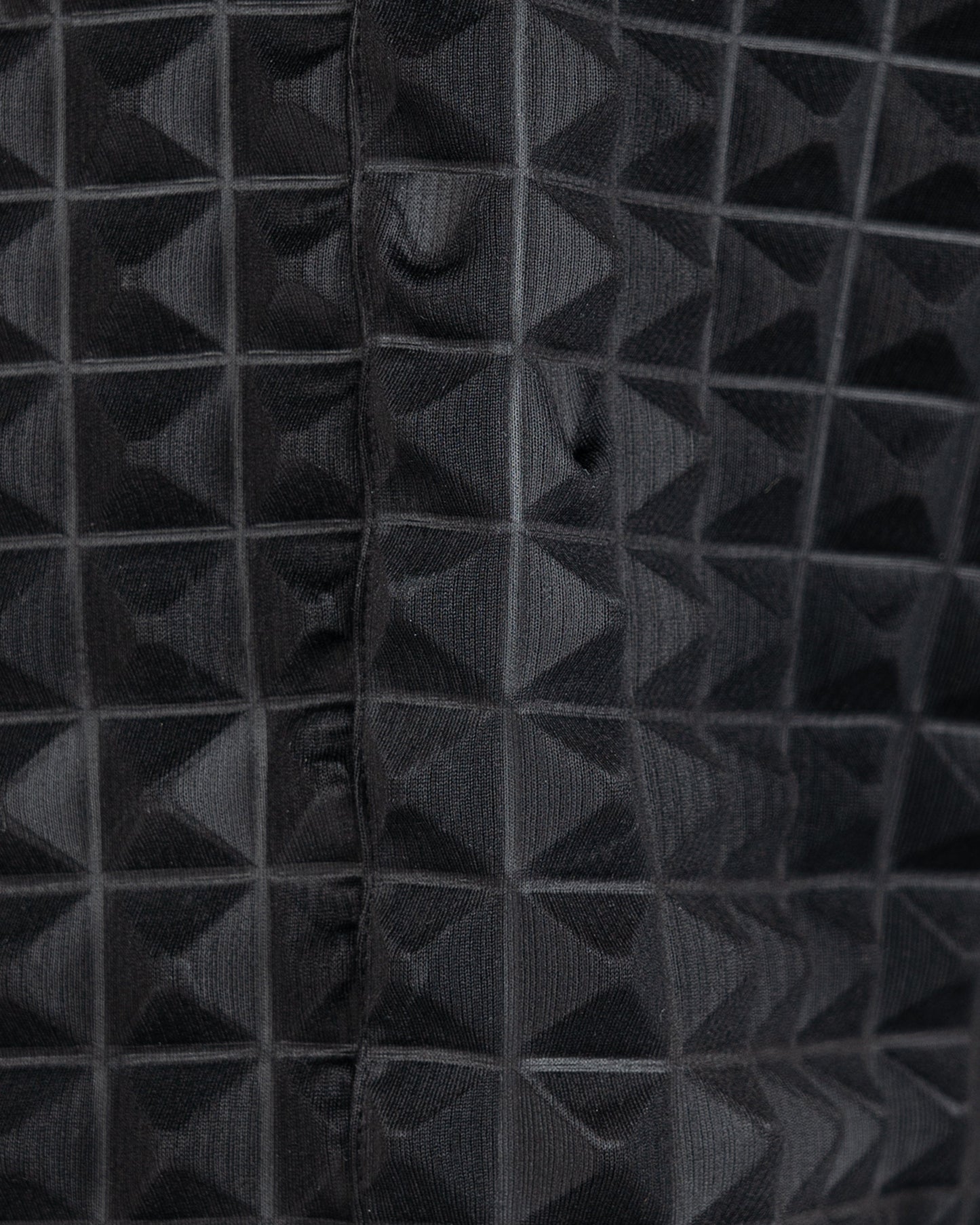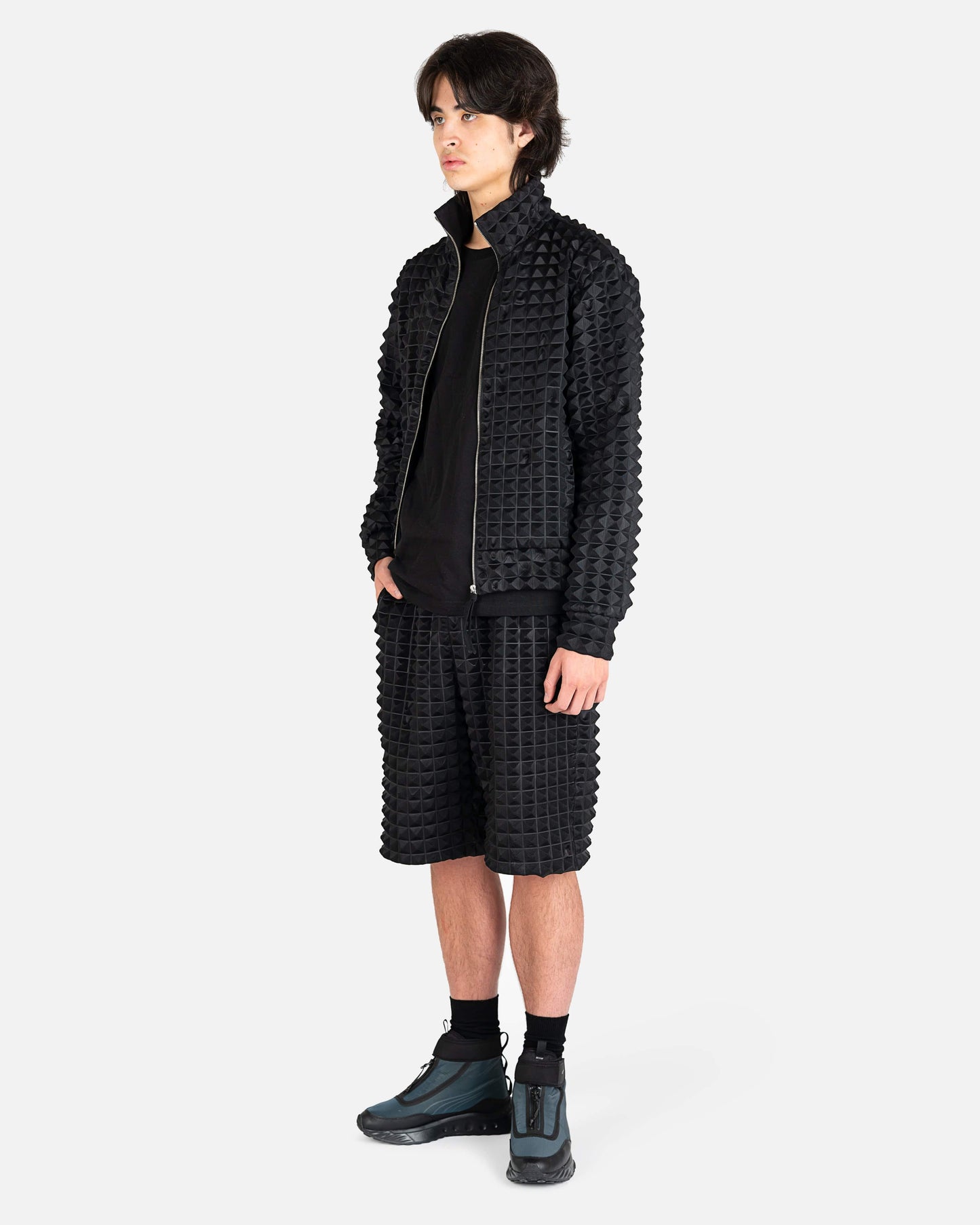 KANGHYUK men's pyramid textured shorts in black. These shorts fall slightly below the knee and have an elasticized waistband. There are two side slit pockets and two back welt pockets.