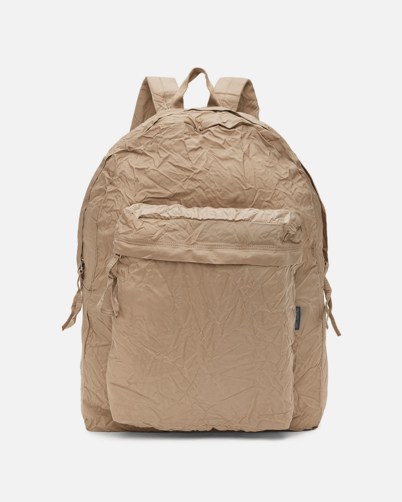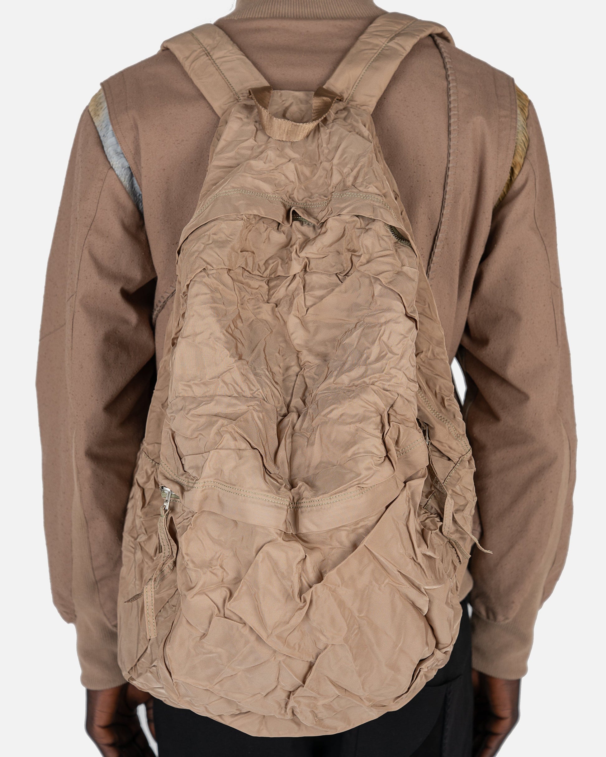 KANGHYUK crinkly airbag backpack in beige. This backpack is made from a recycled airbag. It has a zip pocket on the front and then one main zip compartment through the body.
