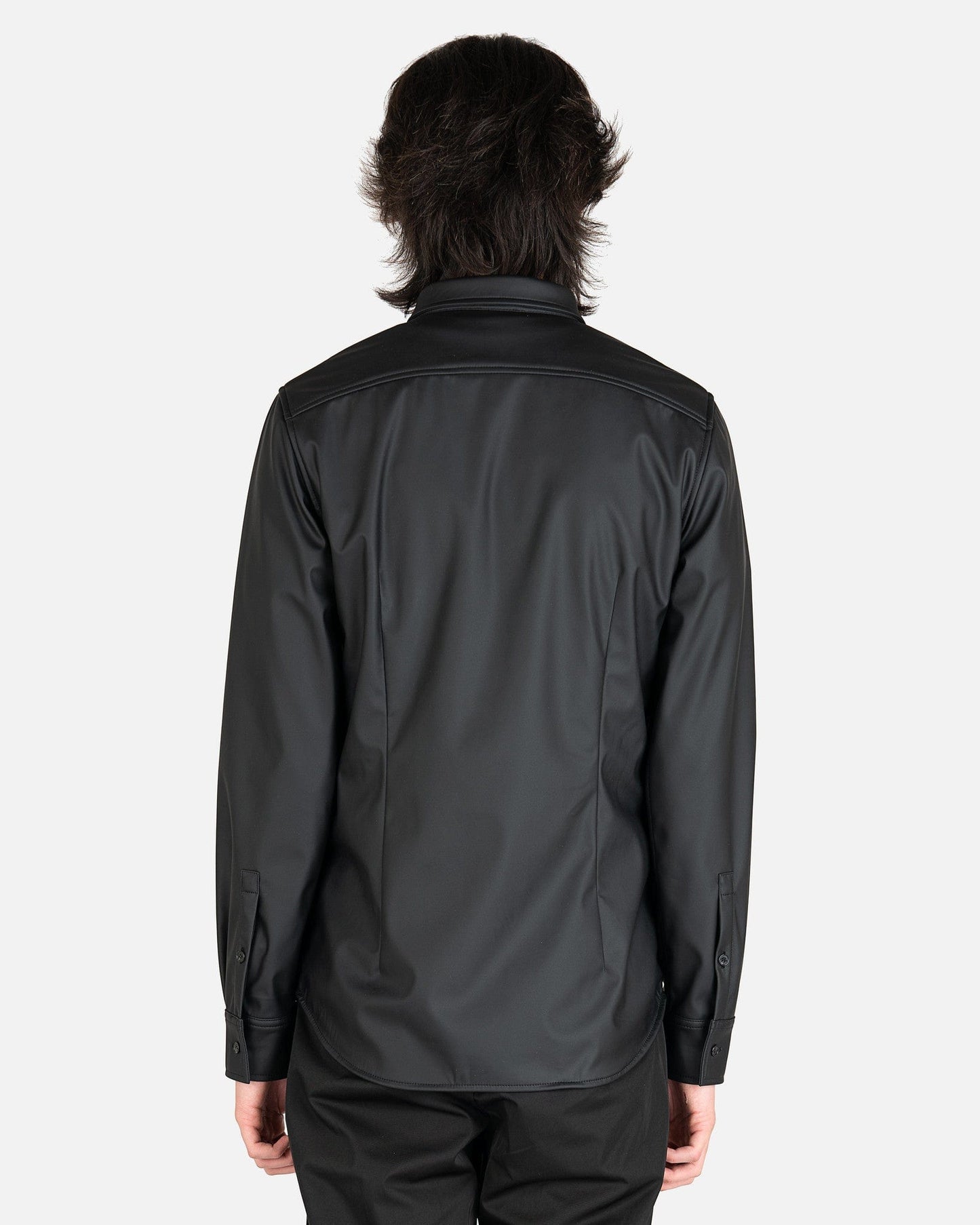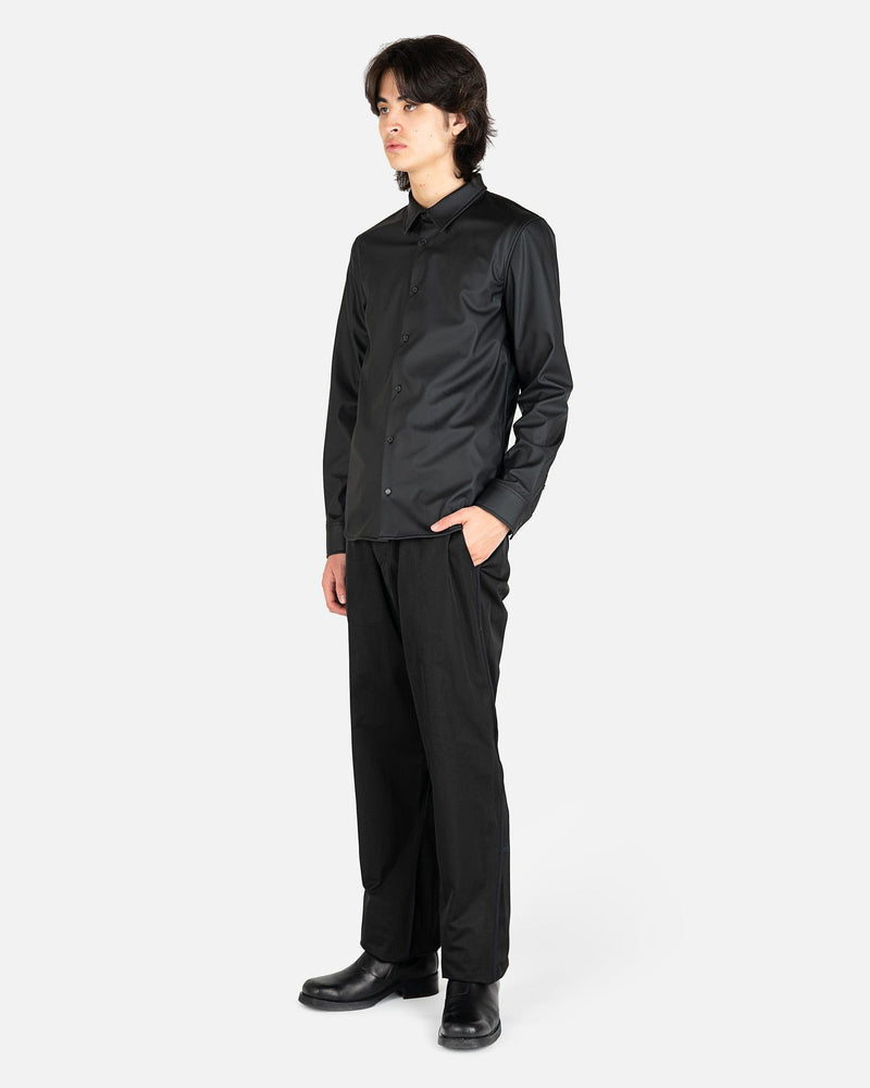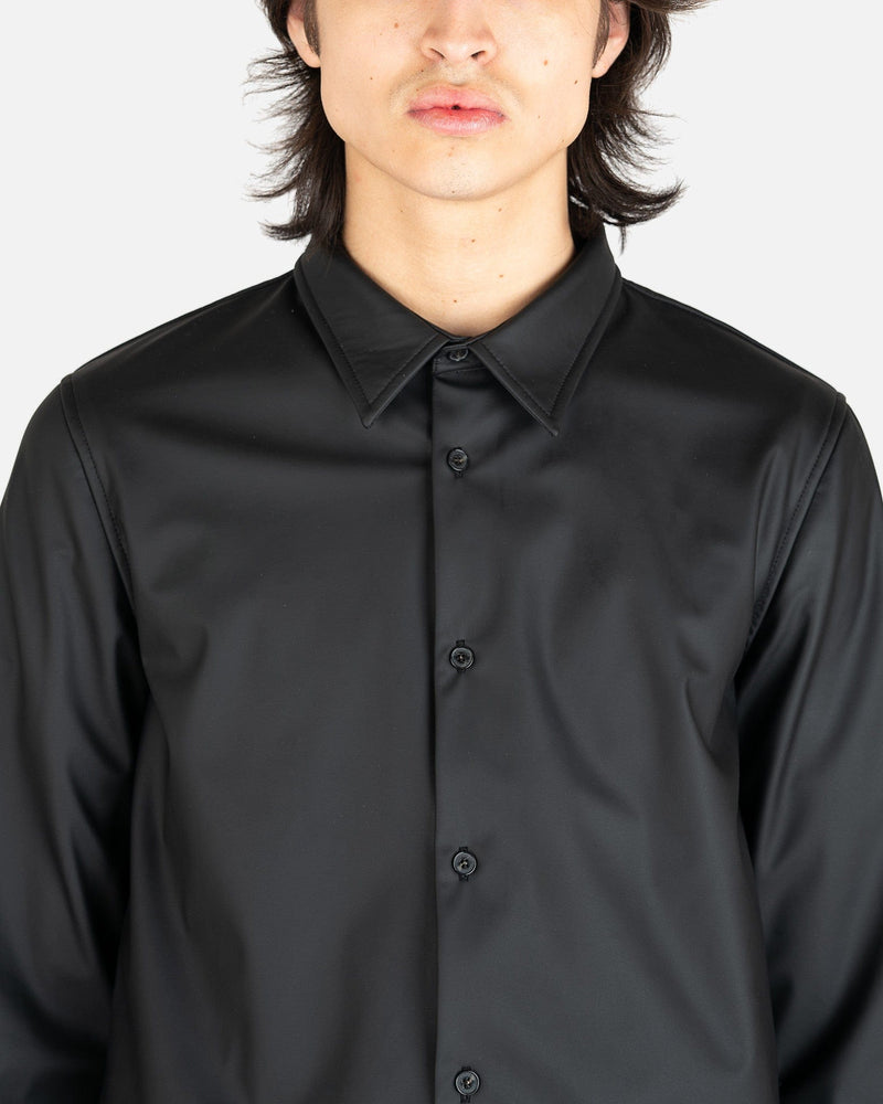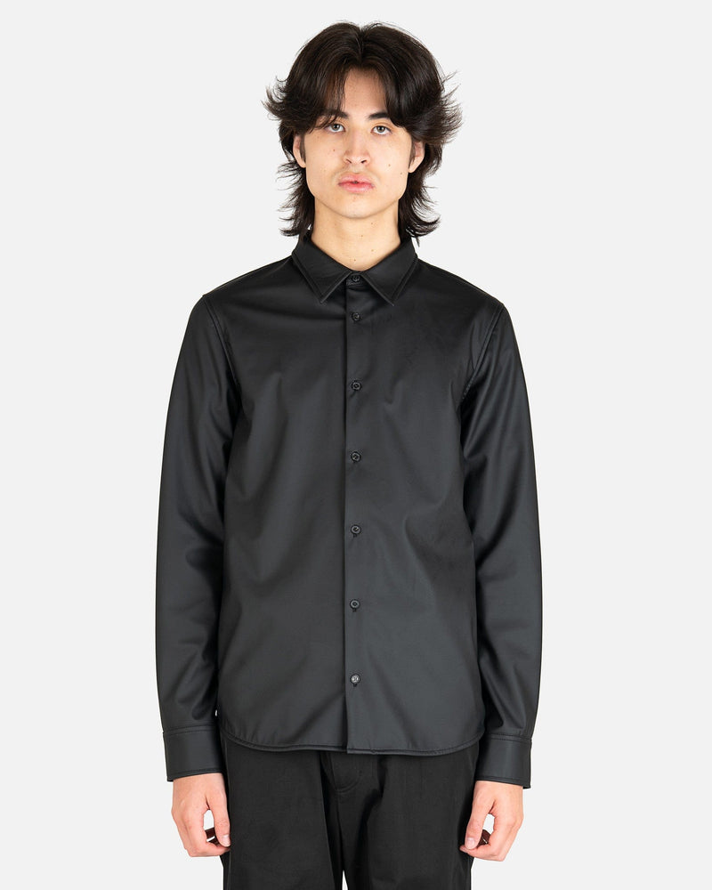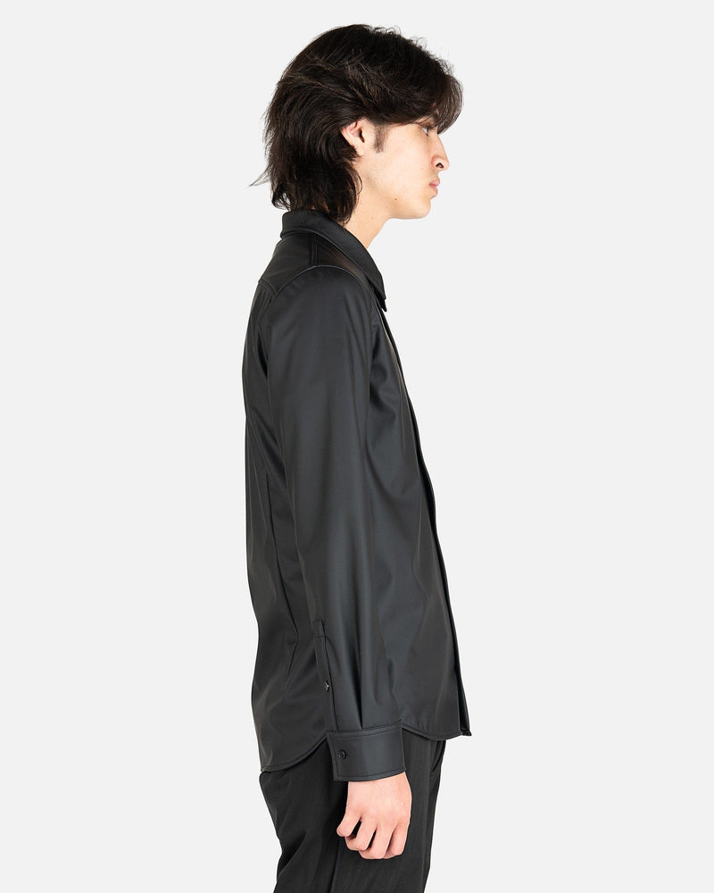 KANGHYUK men's vegan leather long sleeved shirt in black. This top has a classic collar and front button closure with a curved hem.