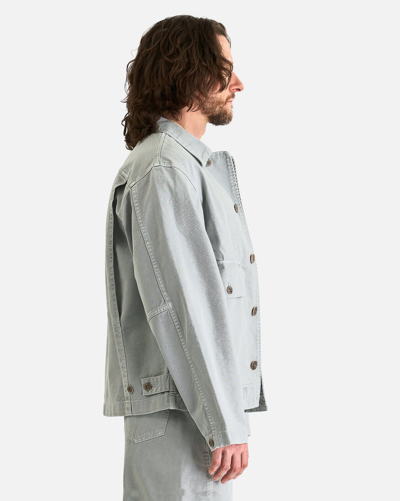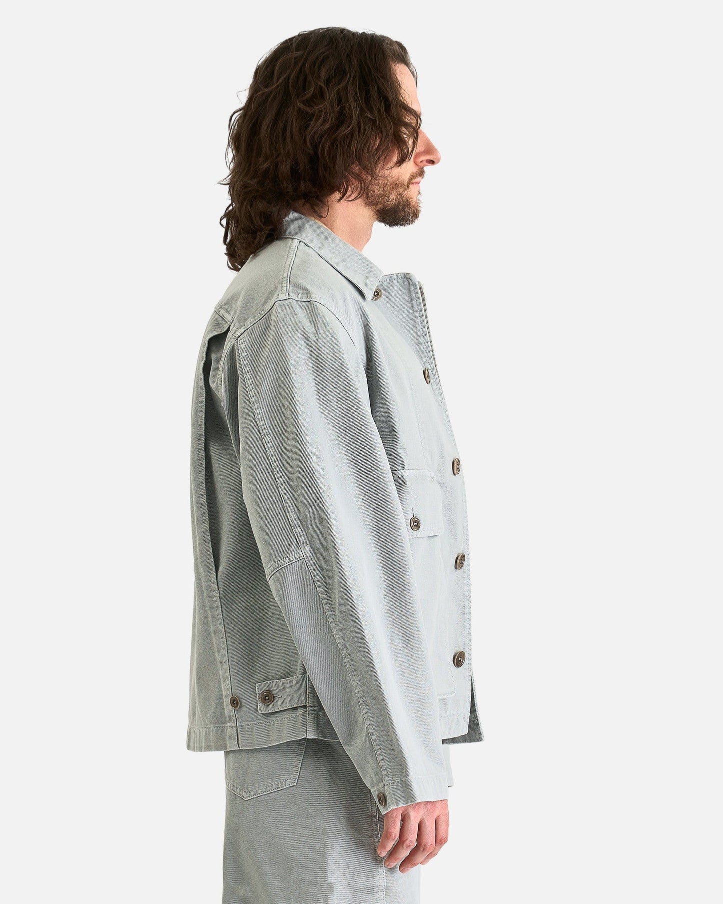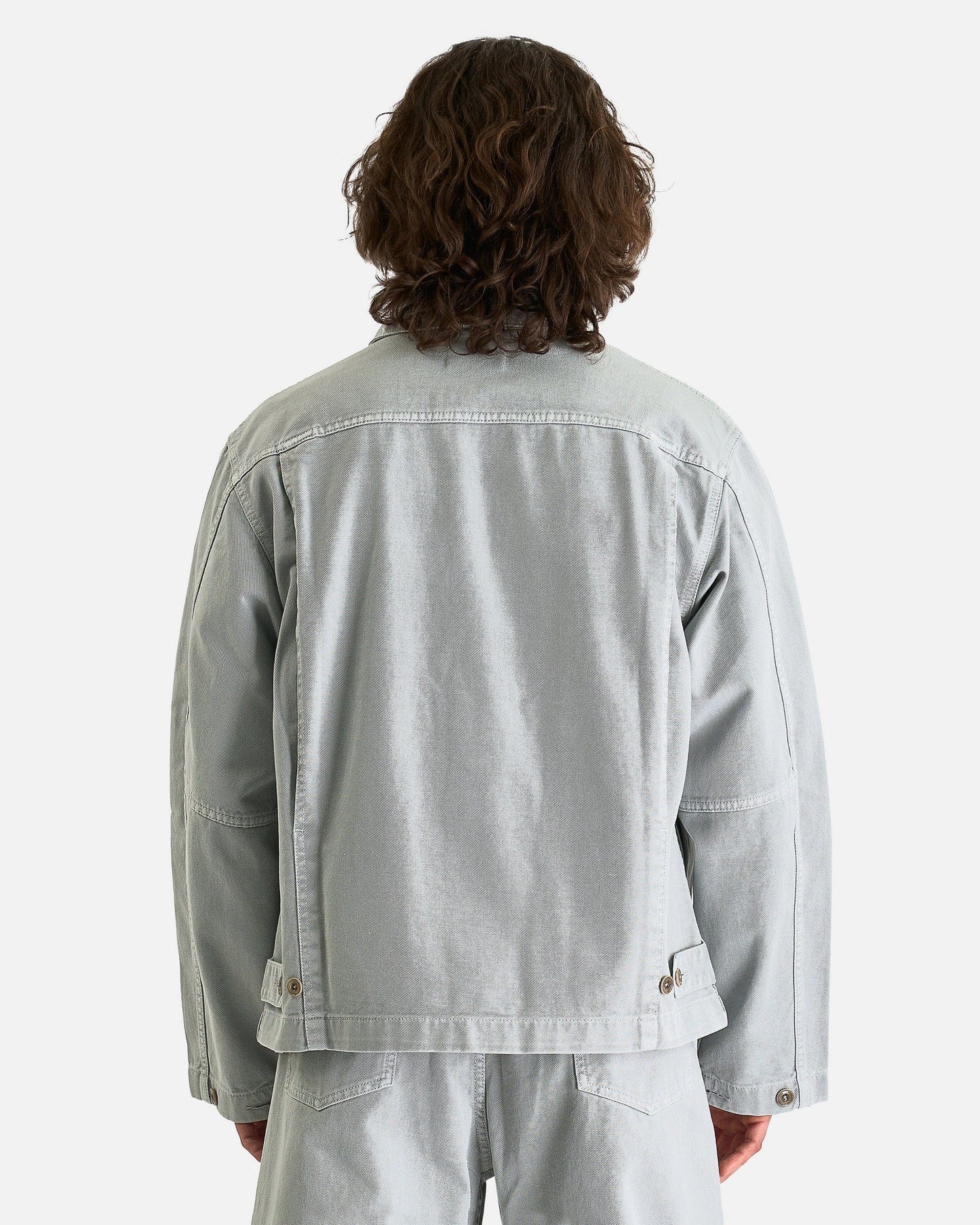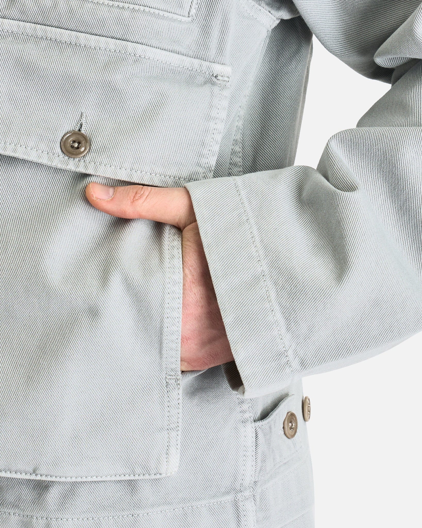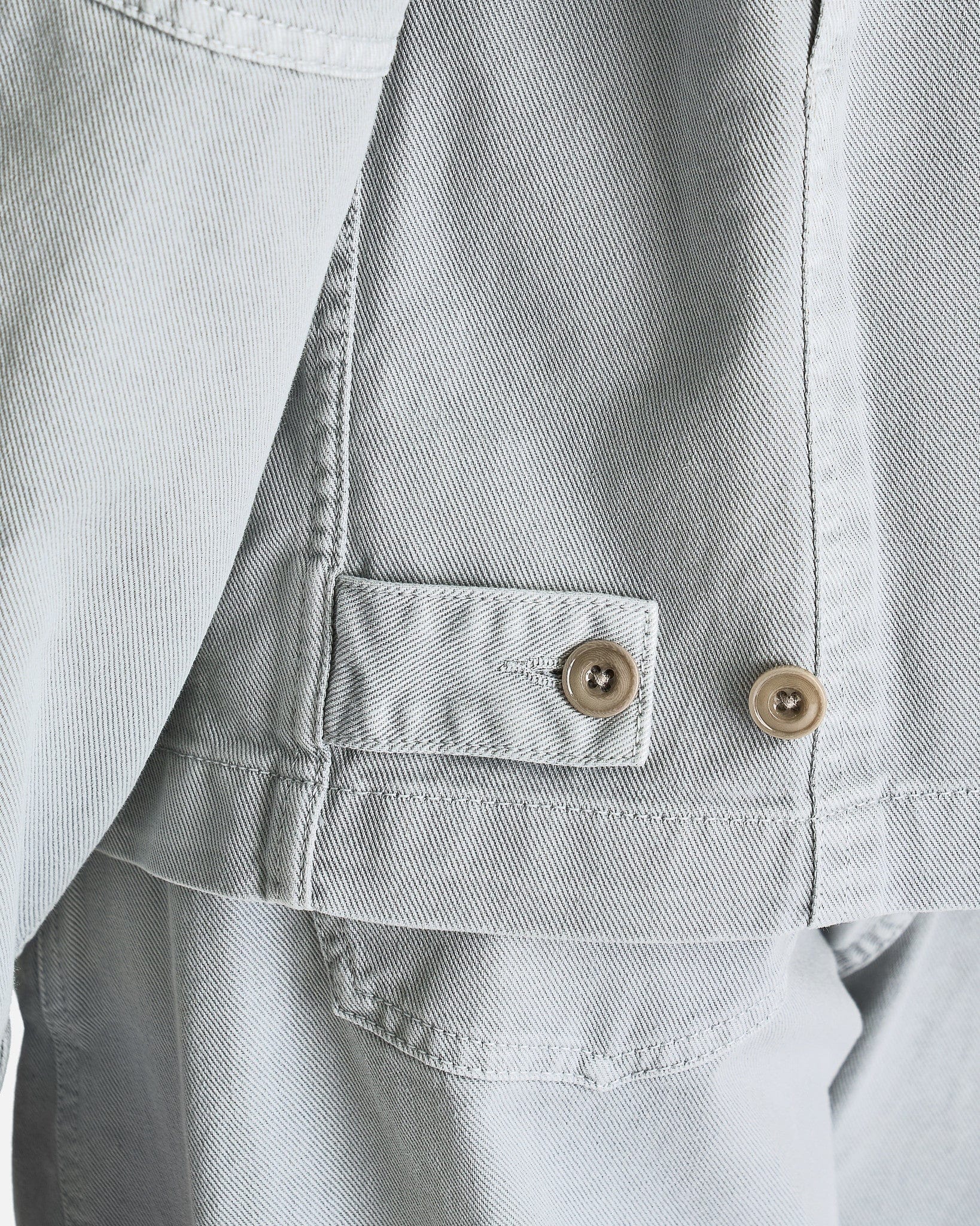 LEMAIRE Boxy Jacket in Snowy Blue Grey. This jacket is crafted from a garment dyed heavy cotton denim and features a spread collar, french placket button closure, gusseted hand-warming pockets on the front and adjustable straps with button fastening at the side waist.