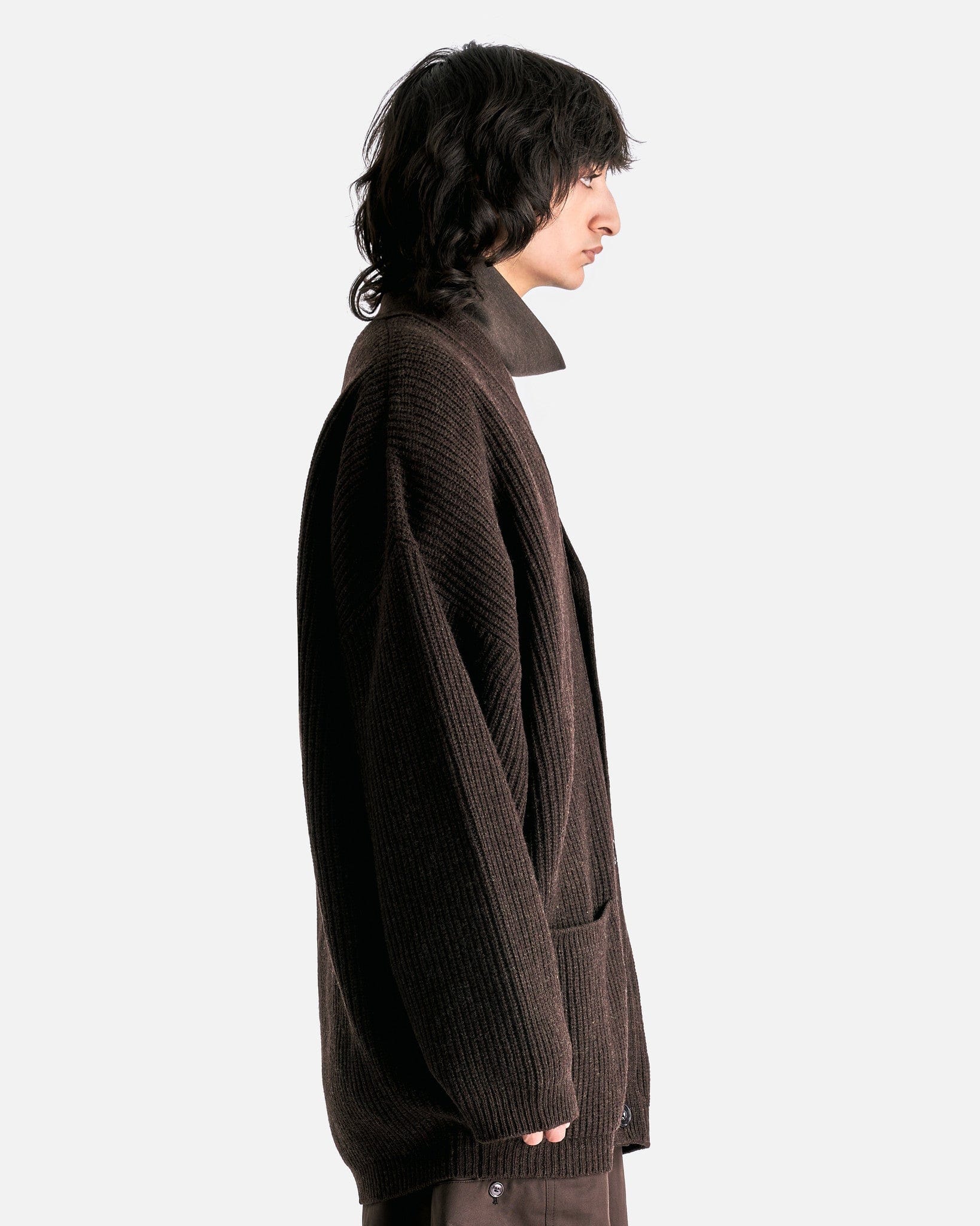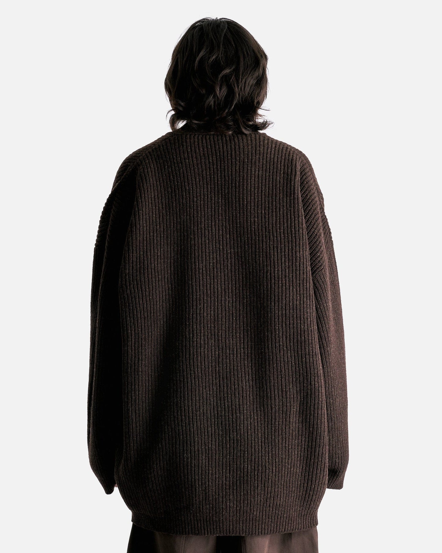 LEMAIRE Felted Cardi Coat in Dark Acajou Melange. This coat is constructed from a heavy weight shetland wool and features a deep v-neck, corozo button closure, wide patch pockets and a voluminous fit.