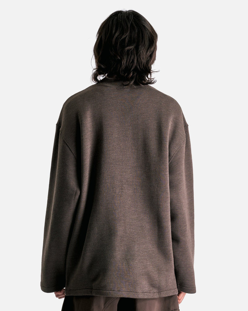 LEMAIRE Mock Neck Sweatshirt in Dark Brown Melange. This sweatshirt features a rib knit mock neck, dropped shoulder seams and a straight hem.