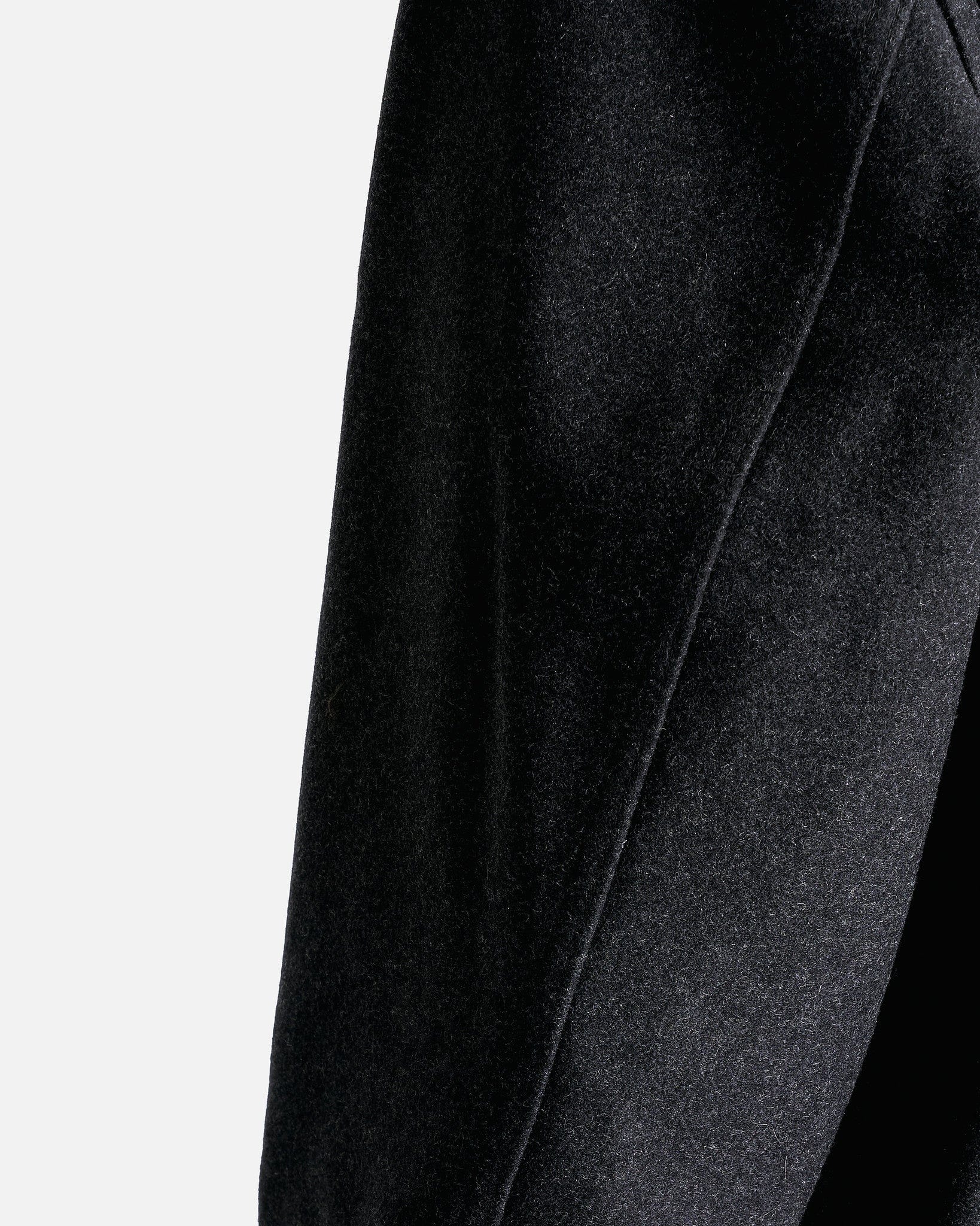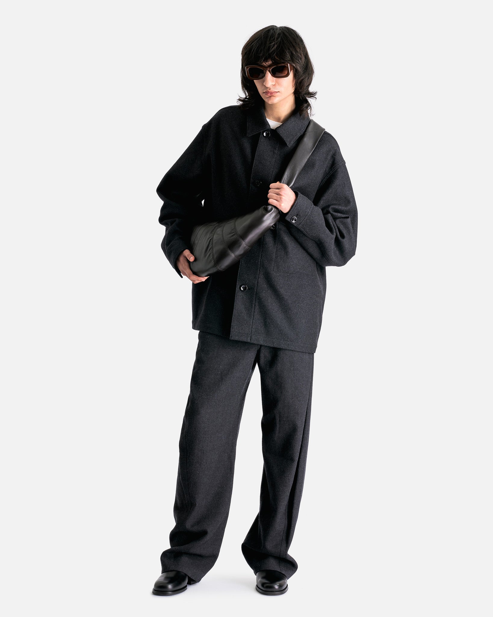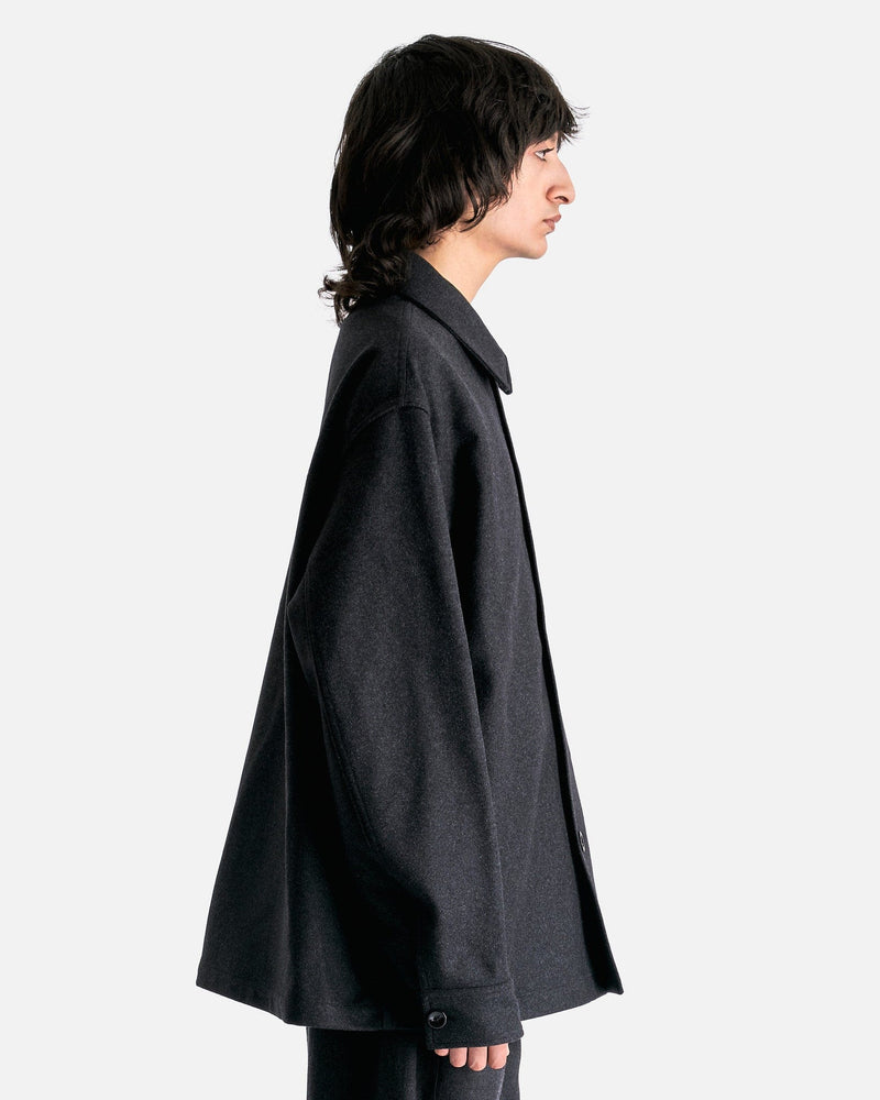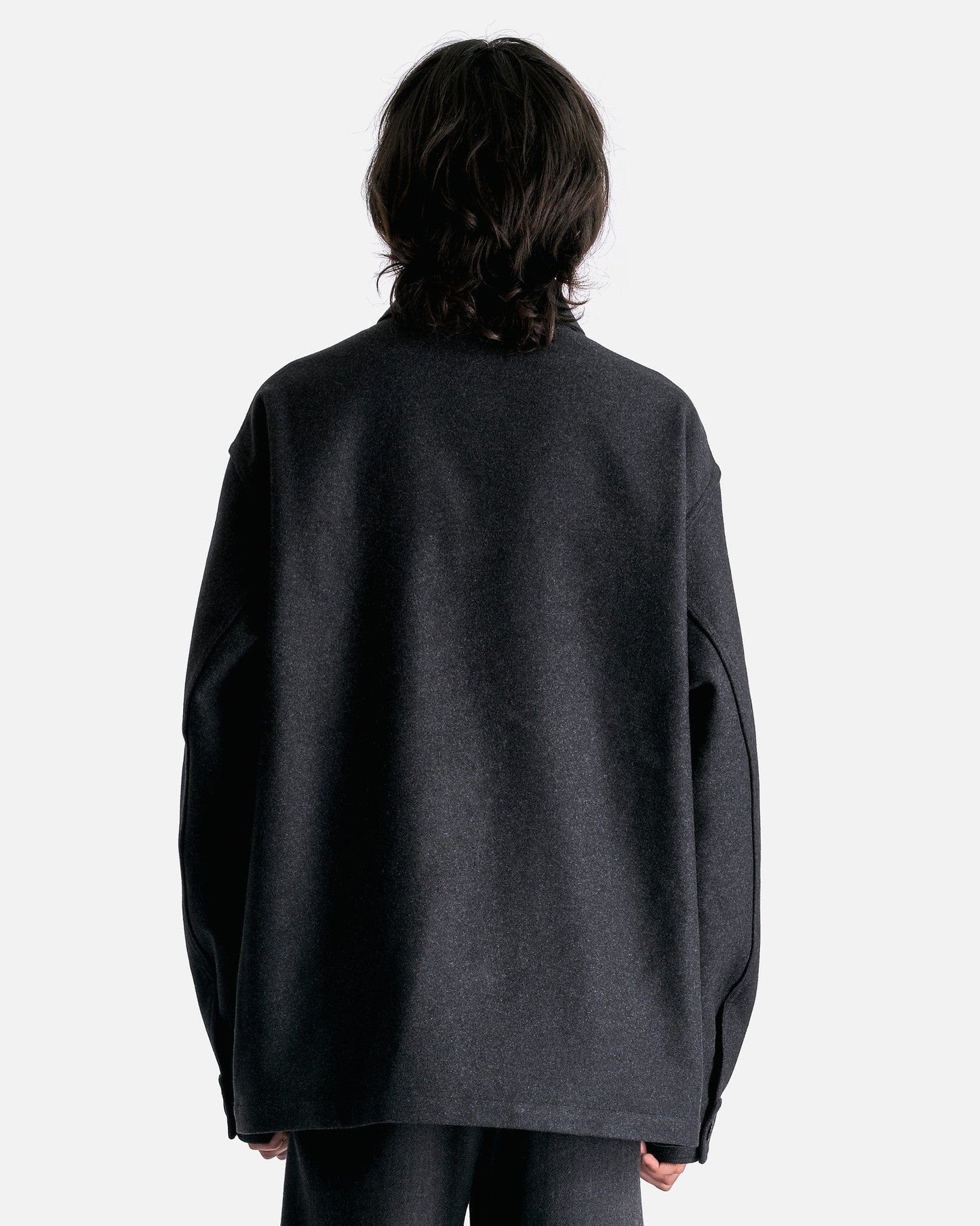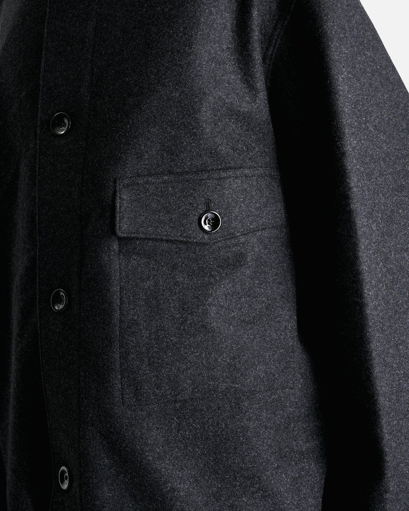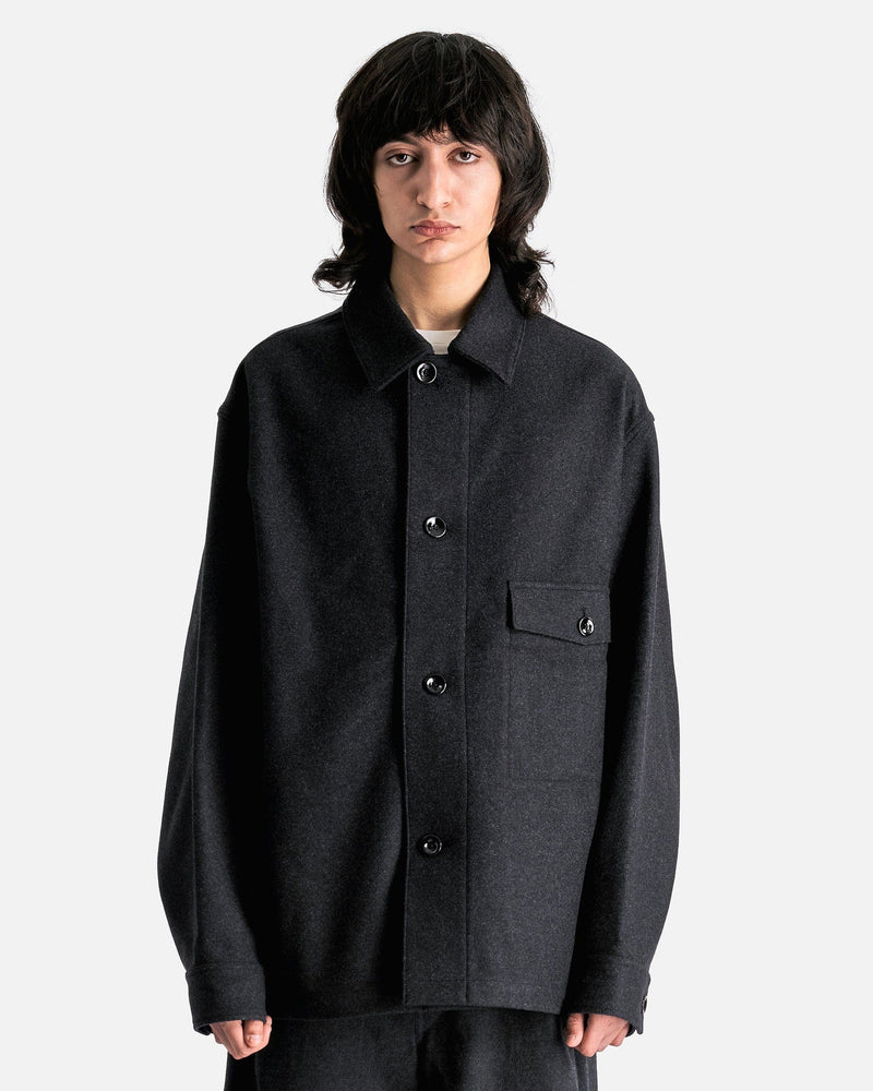 LEMAIRE One Pocket Overshirt in Ash Black. This overshirt features a classic collar, wide button placket, single chest pocket with button fastening, dropped shoulder seams and single button cuffs.