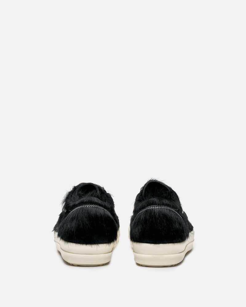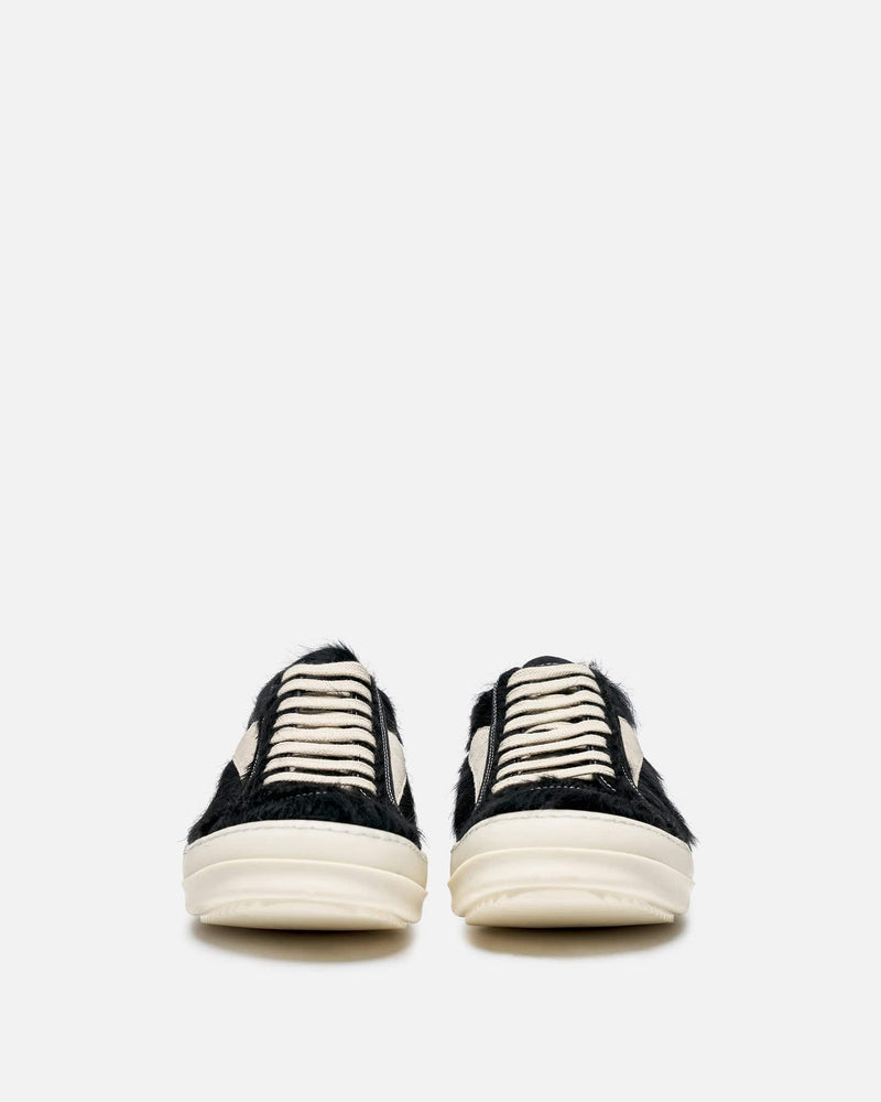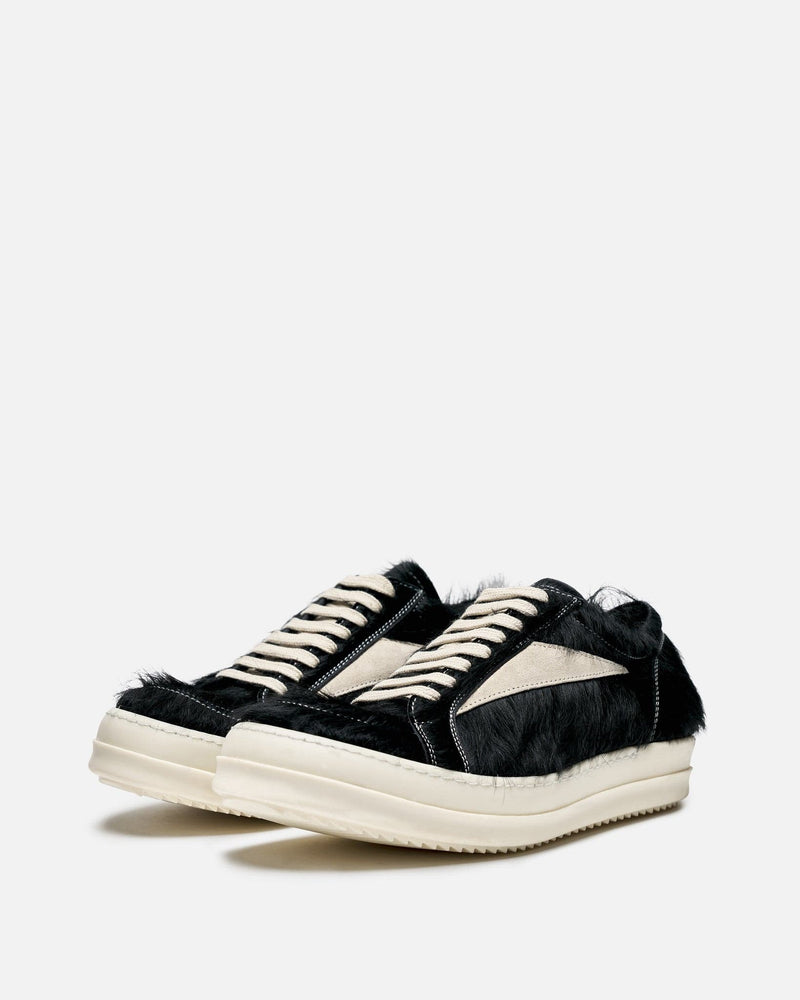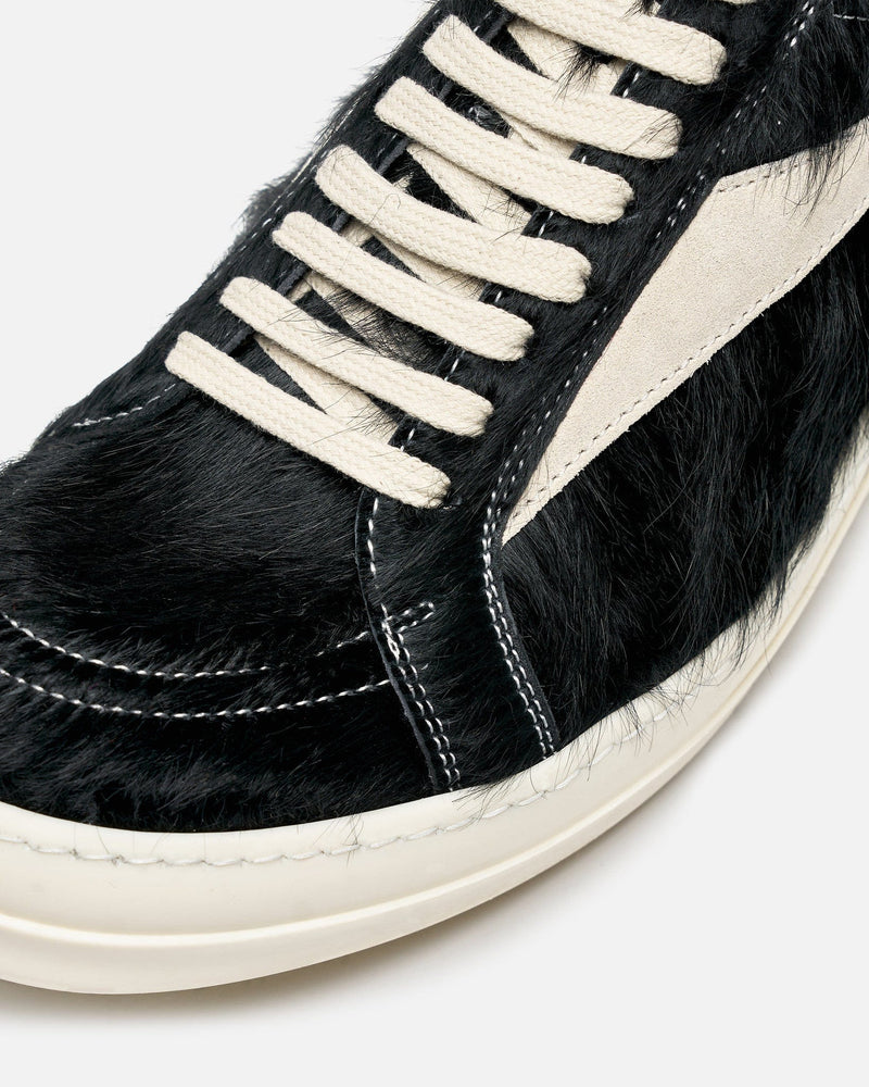 Rick Owens Long Hair Vintage Sneakers in Black/Milk. These shoes feature hair-on cowhide with natural course hair, velour suede appliqué at the sides, contrast stitching, slim profile and shark tooth soles.