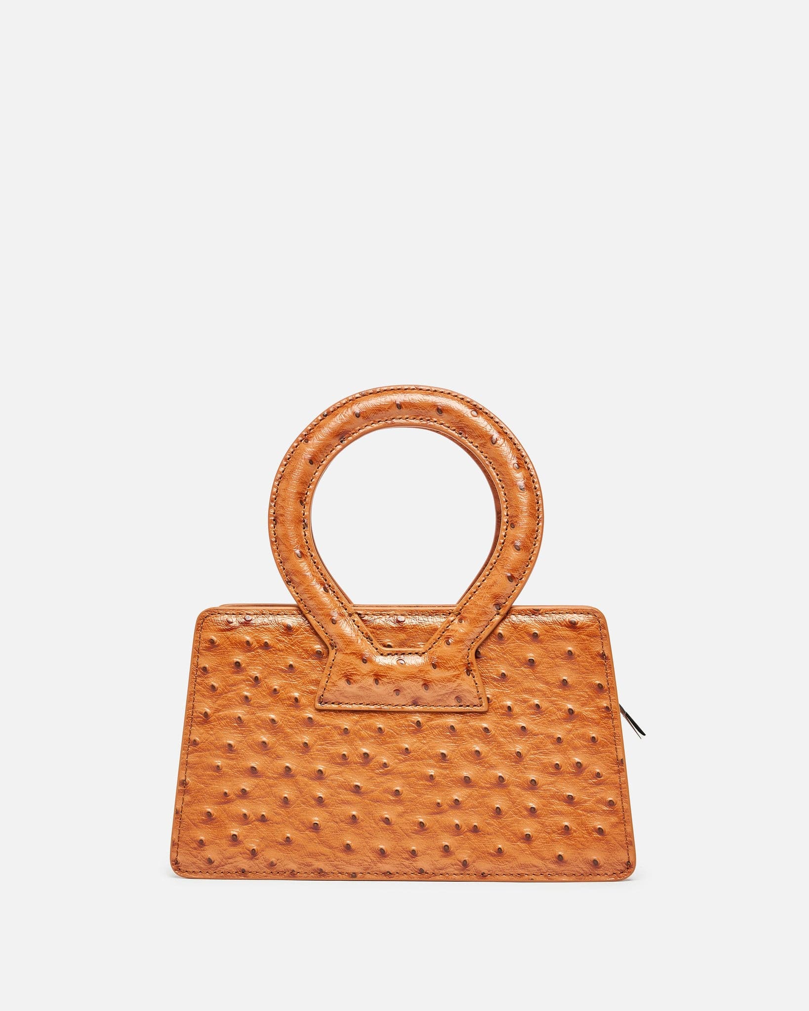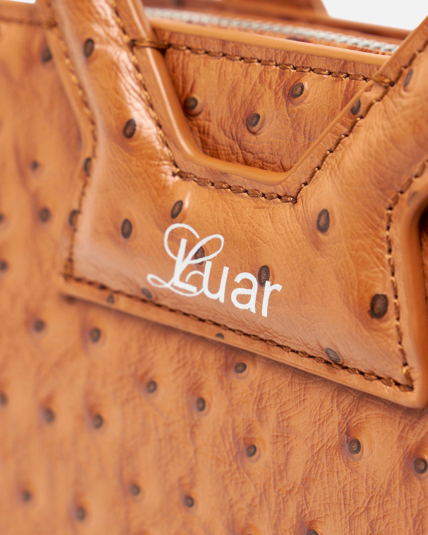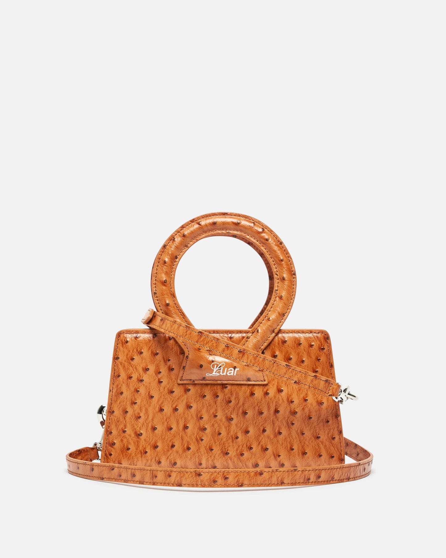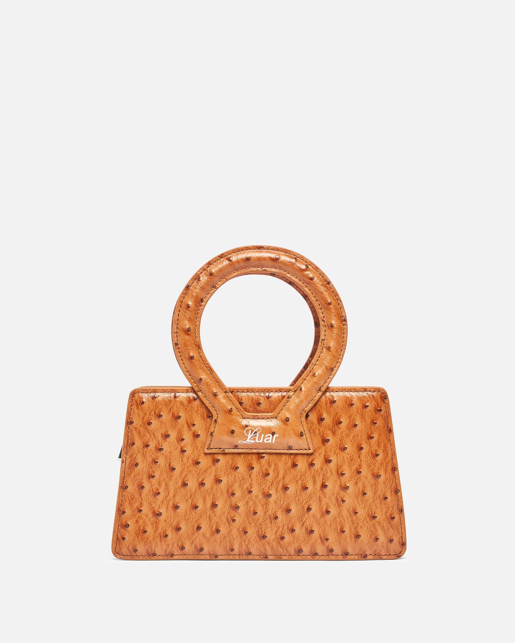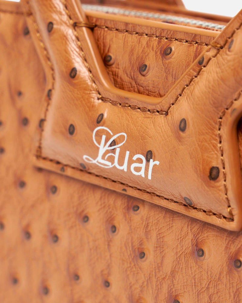 Luar women's small handbag in tan. This cow leather bag features a unique texture inspired by ostrich skin. The bag has a round top handle and removable shoulder strap.
