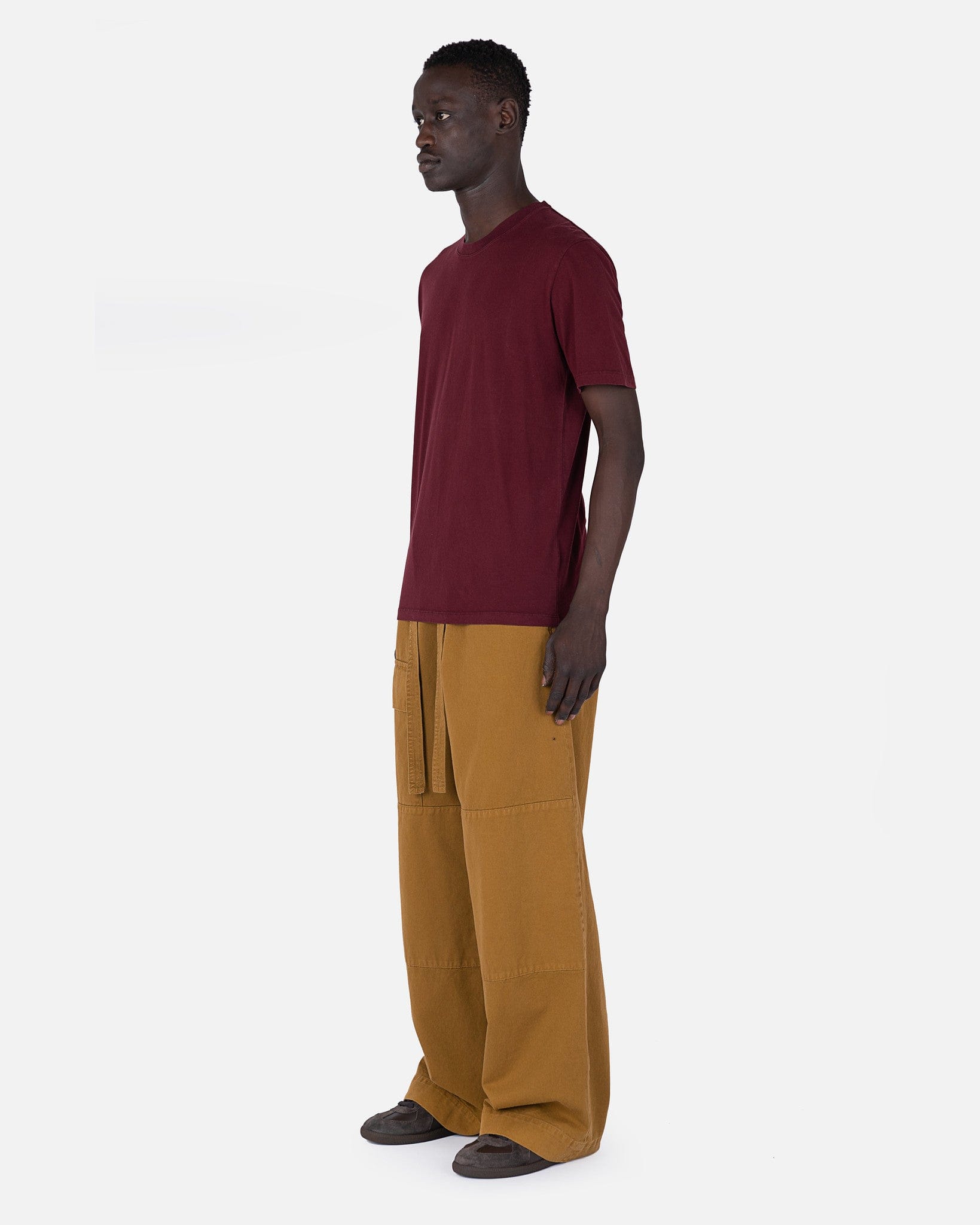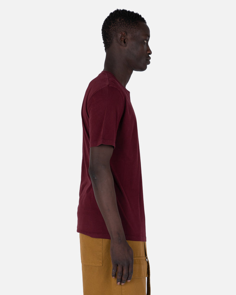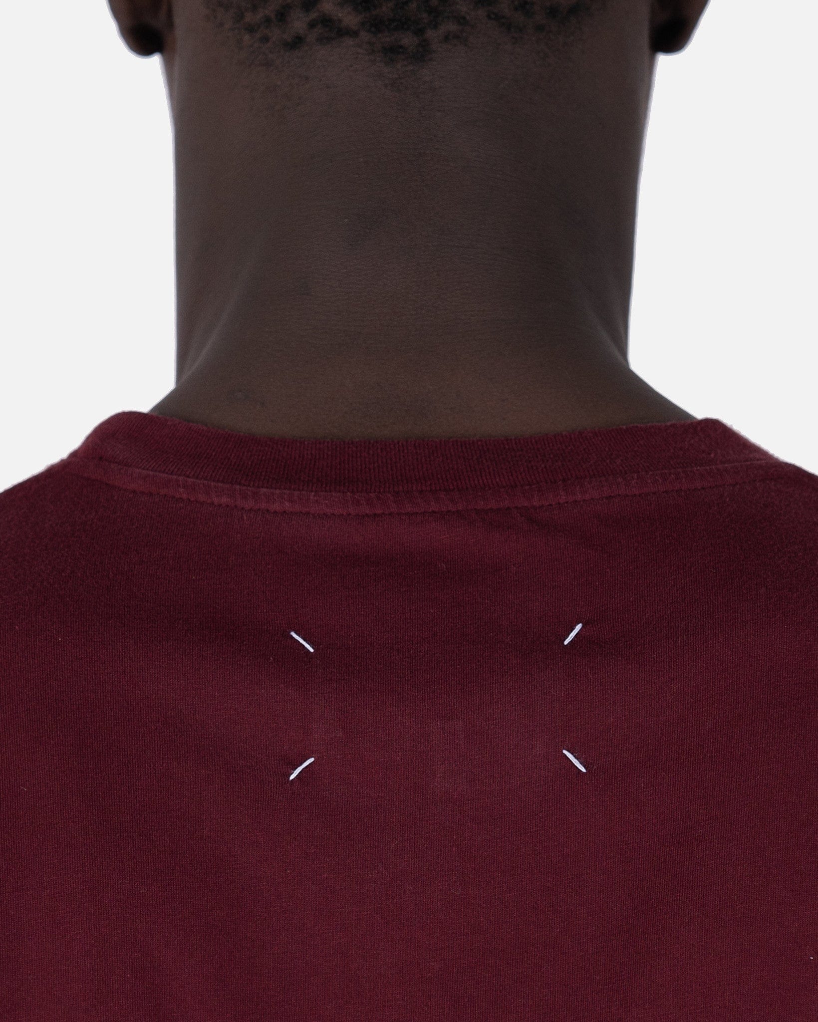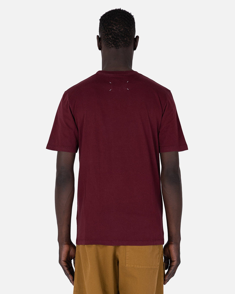 Maison Margiela men's t-shirt in maroon. This t-shirt features a crew neckline and short sleeves. It has a straight hem. The signature four stitch moniker is on the nape.