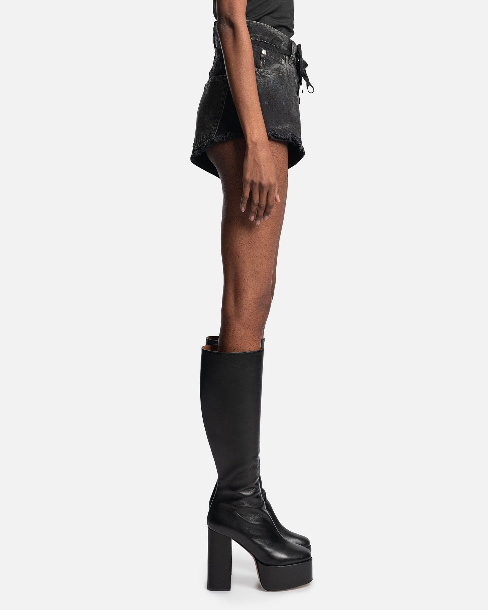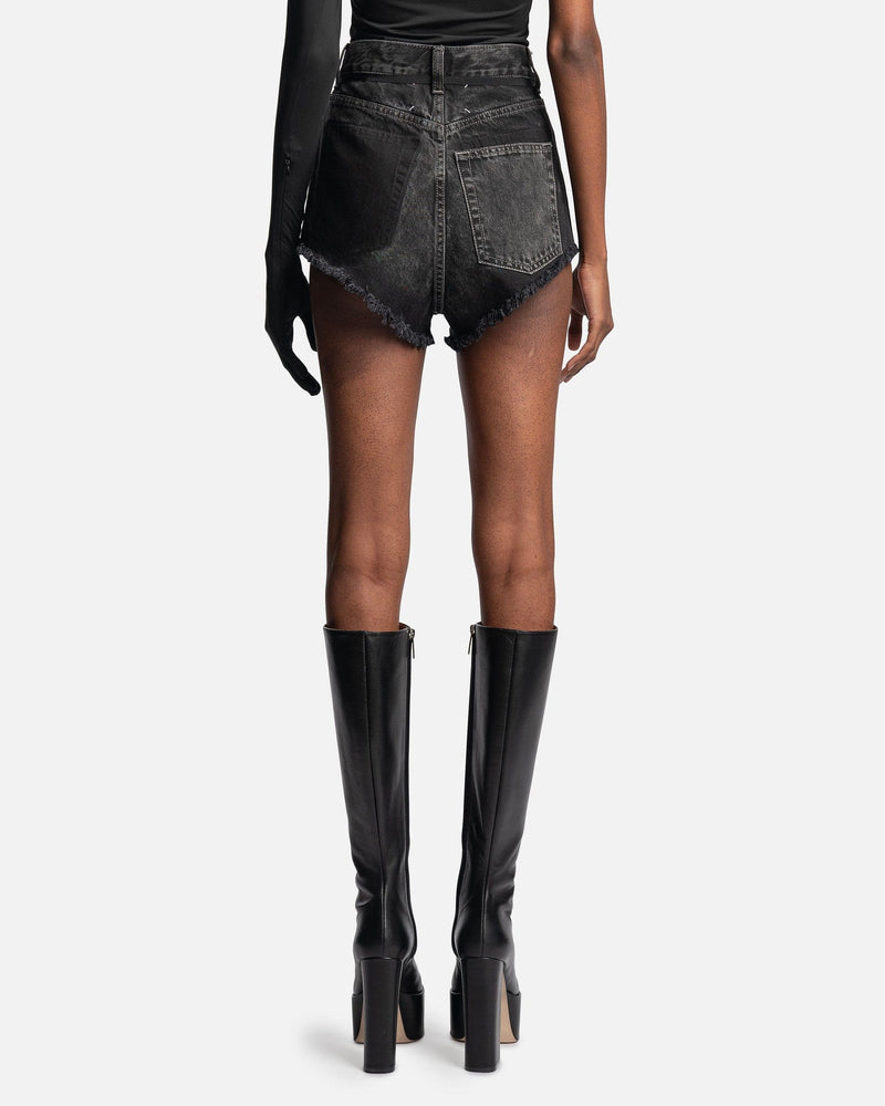 Maison Margiela women's distressed denim shorts in black. These shorts are highwaisted and are cut off high at the rear.