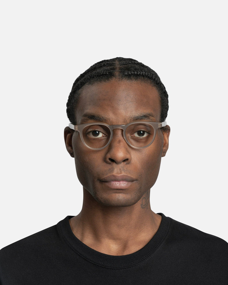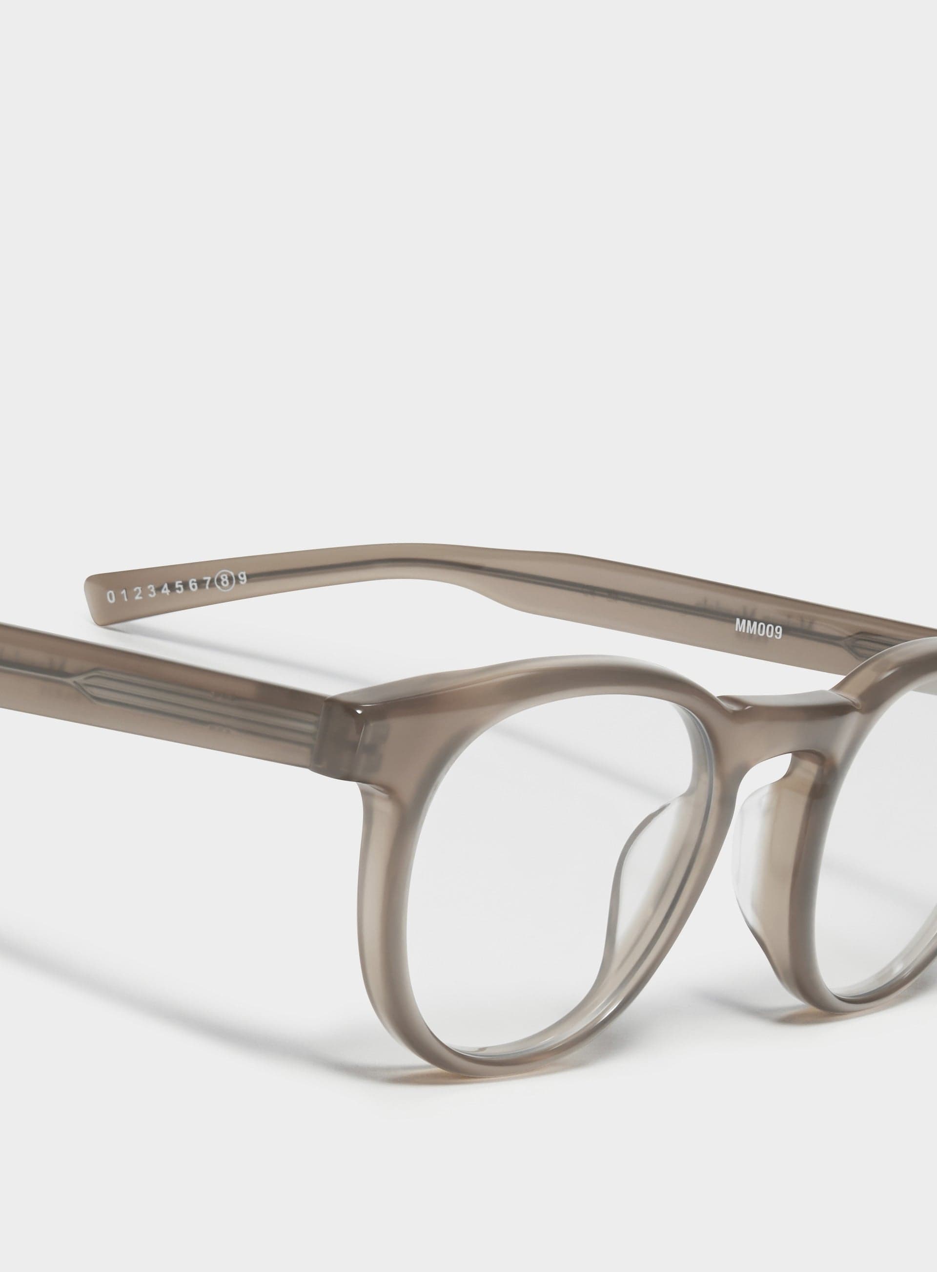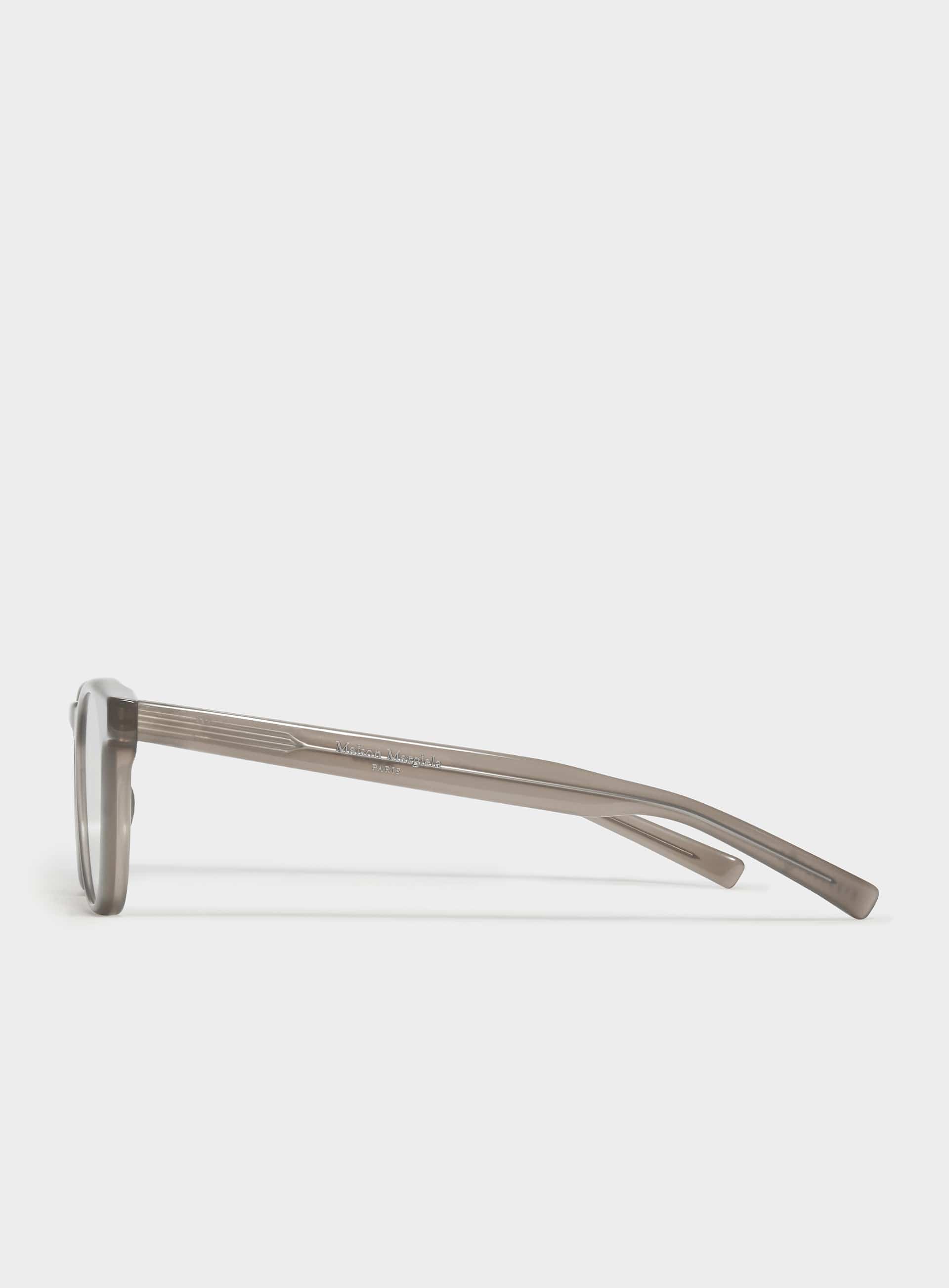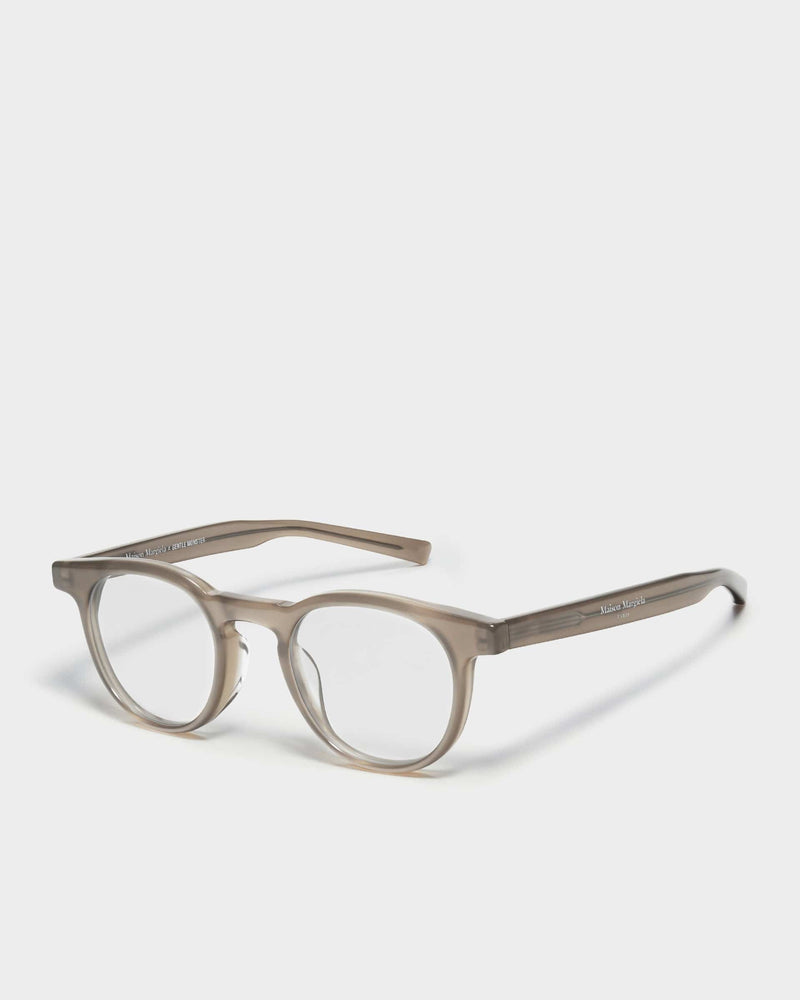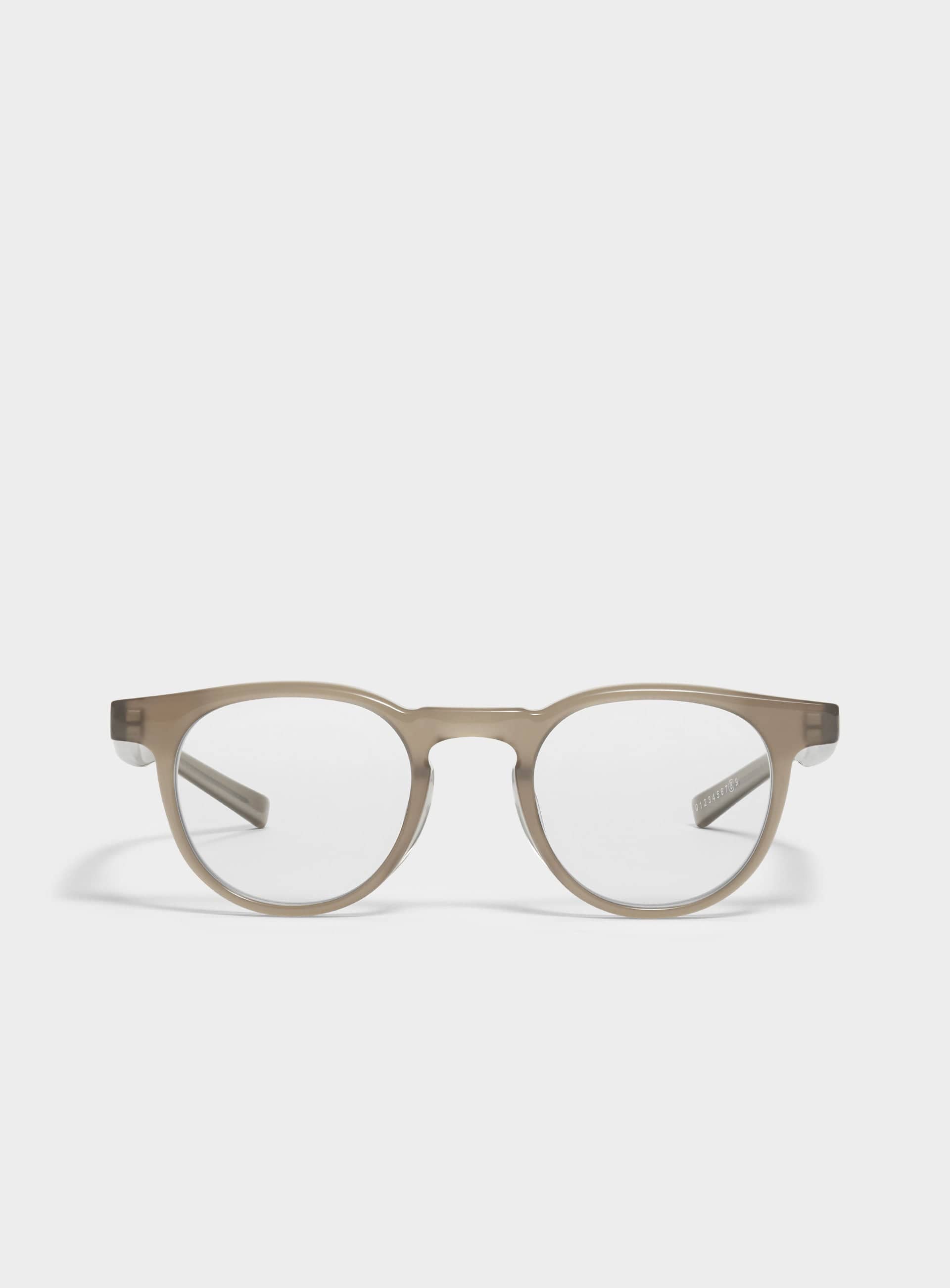 Maison Margiela x Gentle Monster round translucent sunglasses in brown. These glasses feature a clear brown acetate frame. There is logo embellishment on the inner left temple.