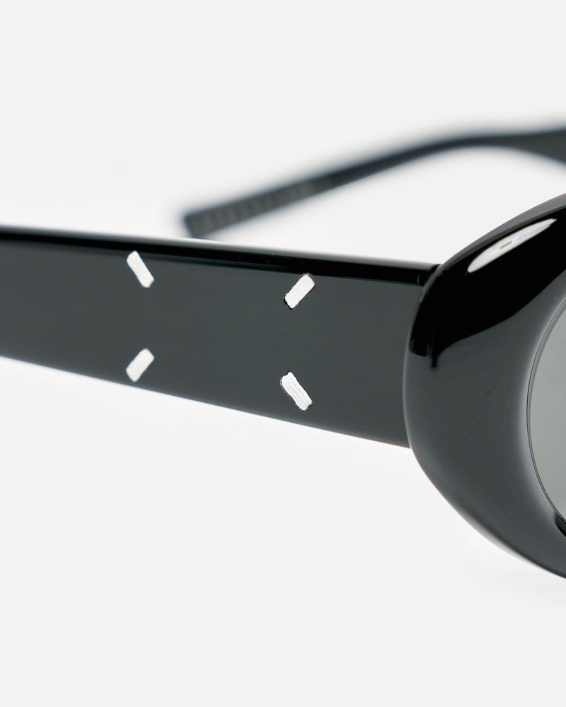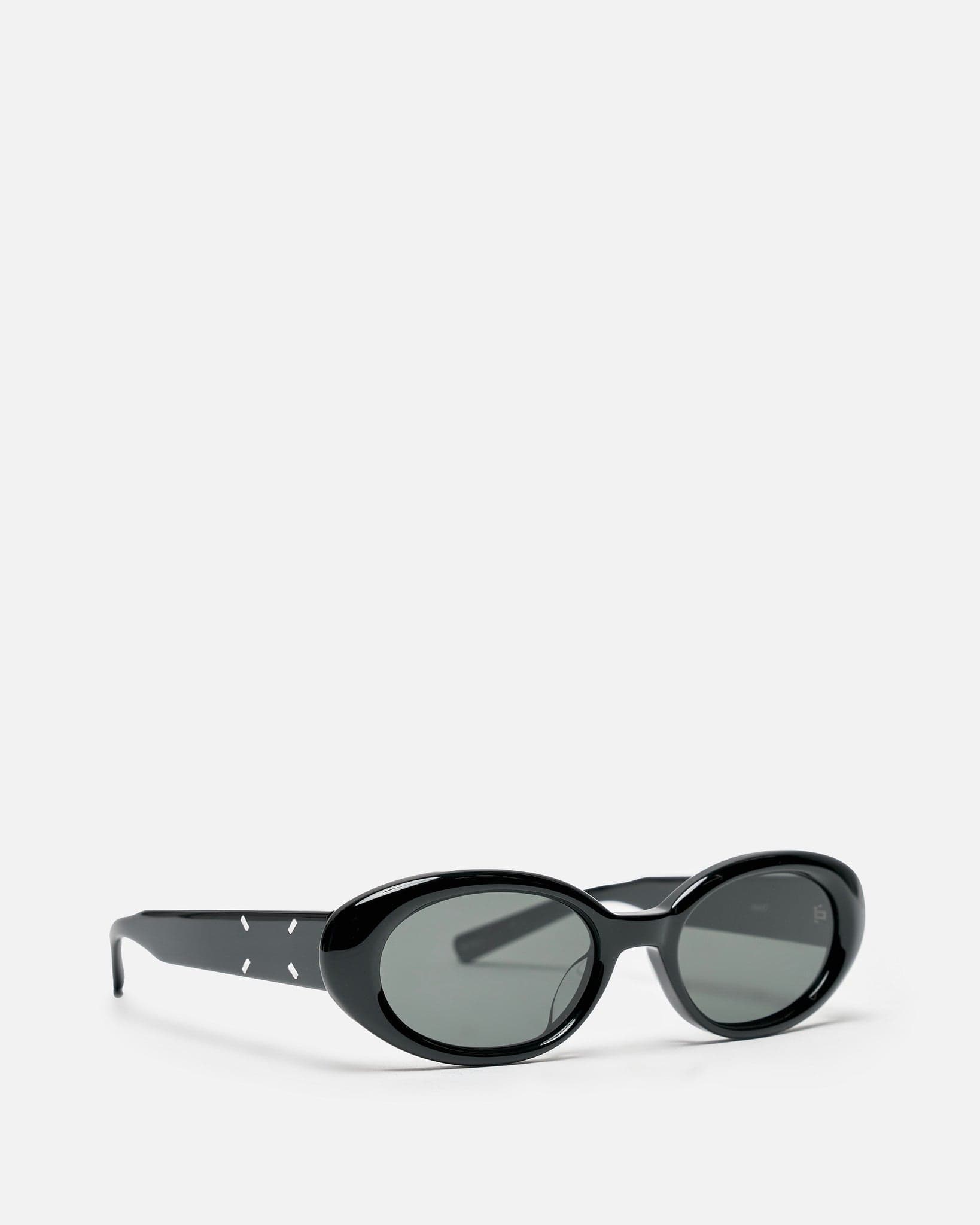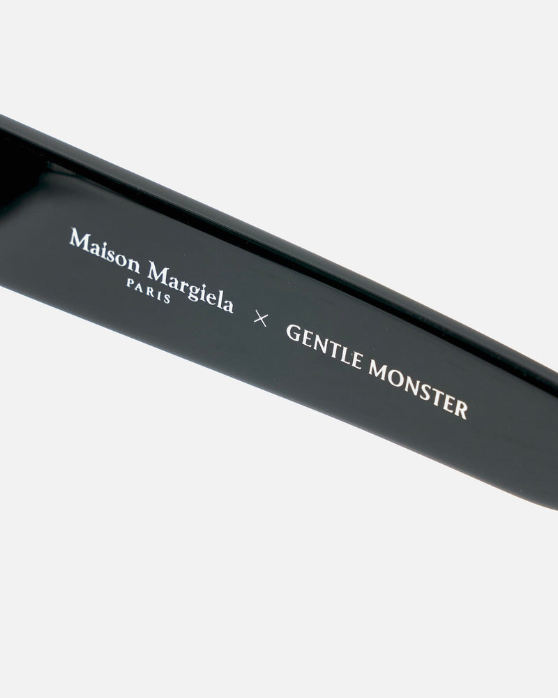 Maison Margiela x Gentle Monster MM107 01. These sunglasses feature a chunky oval acetate frame, Margiela number system stamp on interior arm, collaborative logo on opposite interior arm, white copper core and hinge and the prominent 4-stitch signature made with real thread on lateral side hinge.
