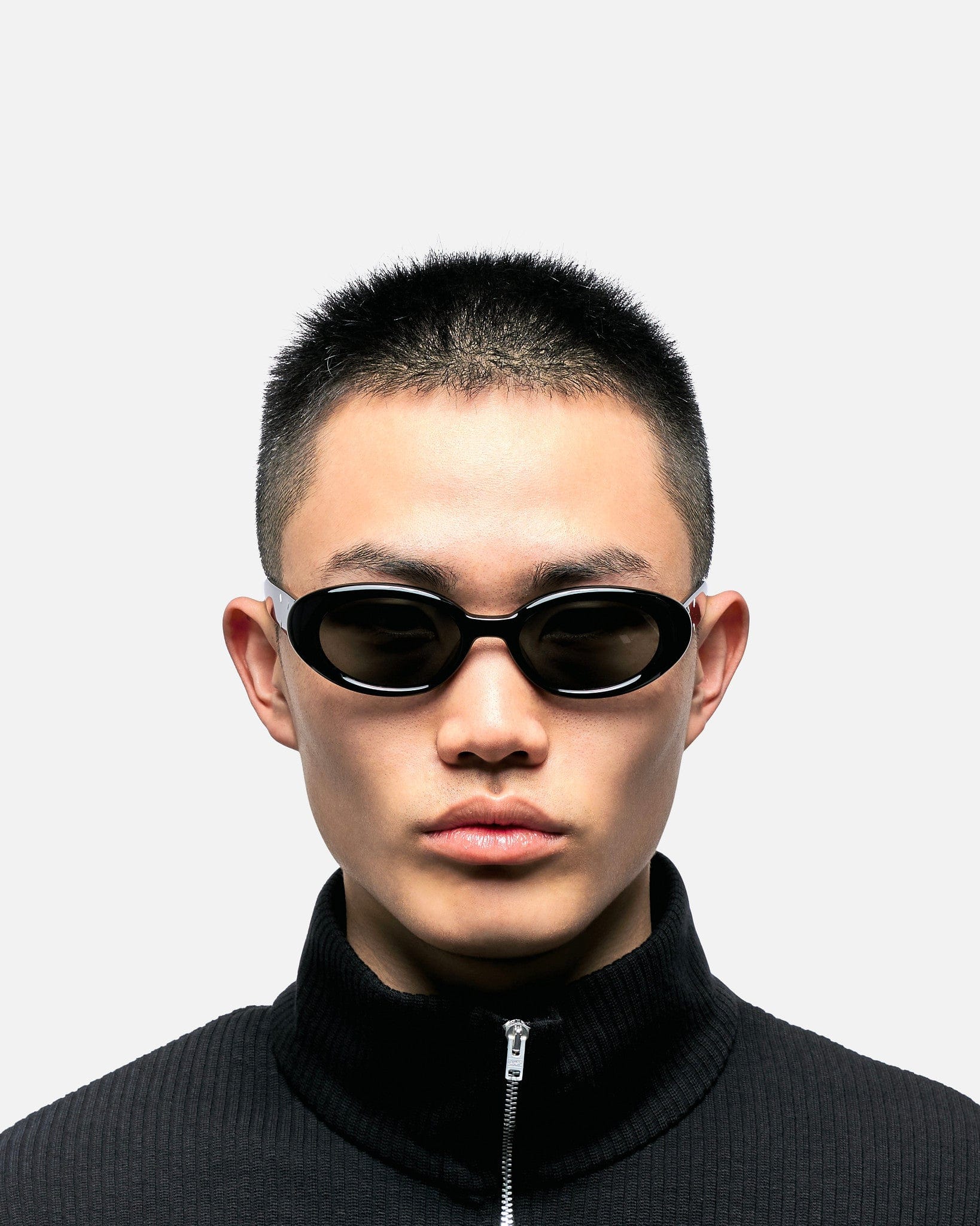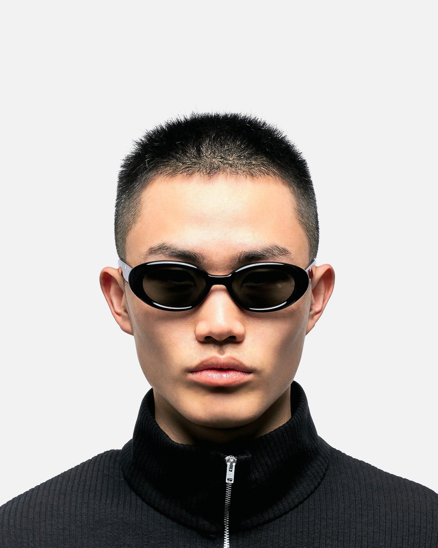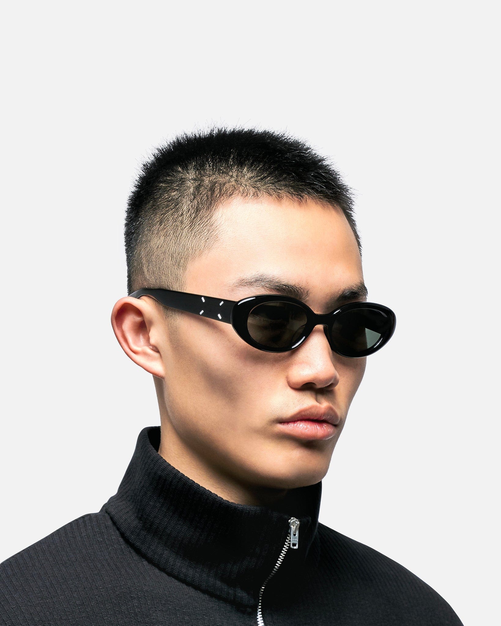 Maison Margiela x Gentle Monster MM107 01. These sunglasses feature a chunky oval acetate frame, Margiela number system stamp on interior arm, collaborative logo on opposite interior arm, white copper core and hinge and the prominent 4-stitch signature made with real thread on lateral side hinge.