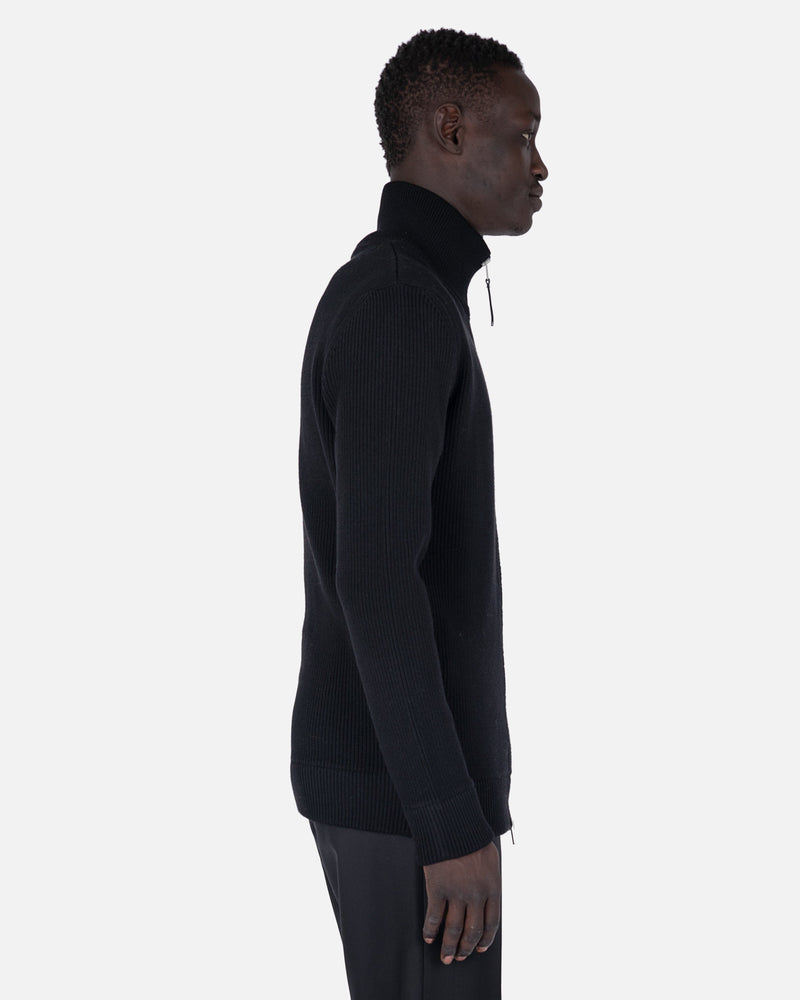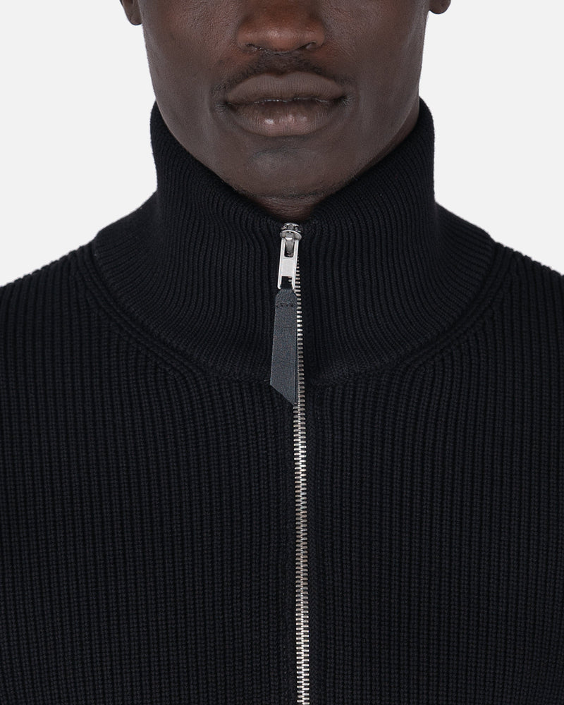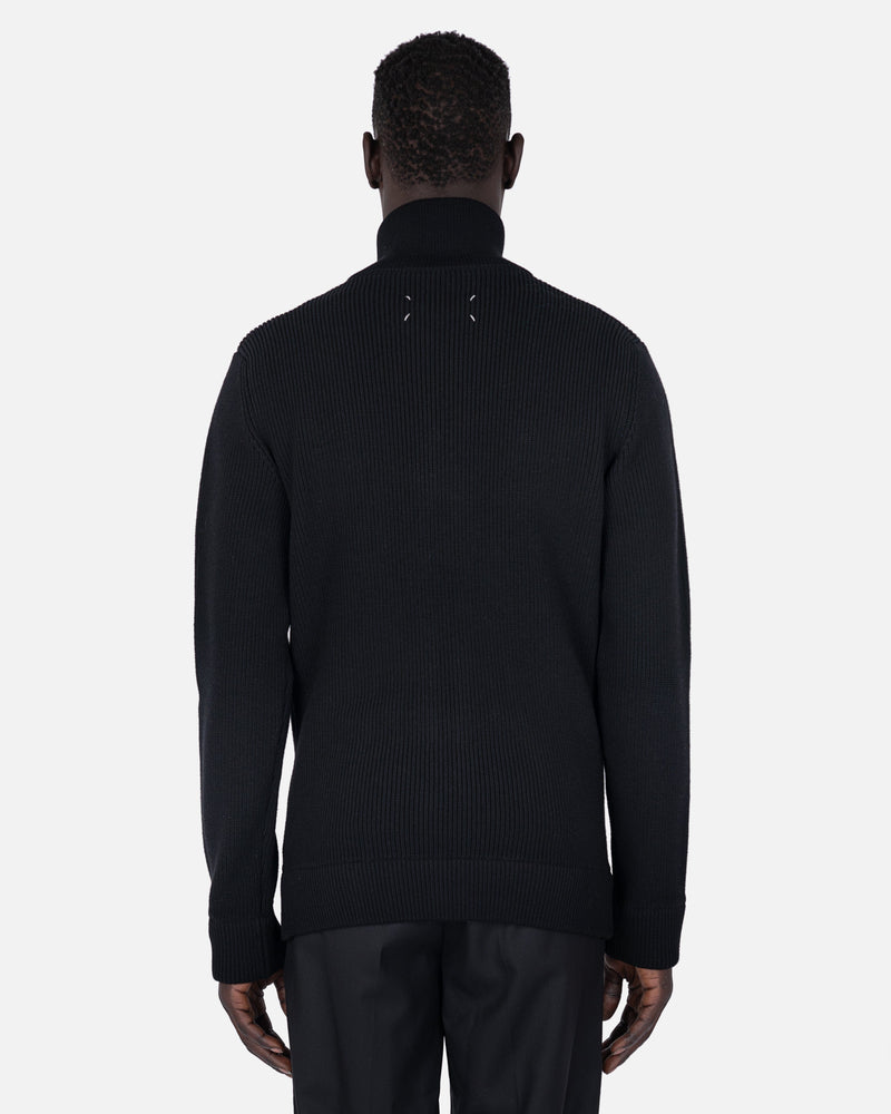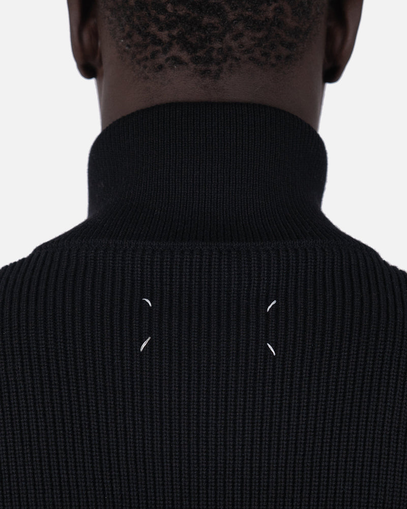 Maison Margiela men's cardigan in black. This cardigan features long sleeves with ribbing throughout the entire garment with a front zipper.