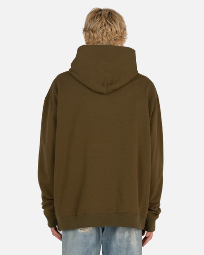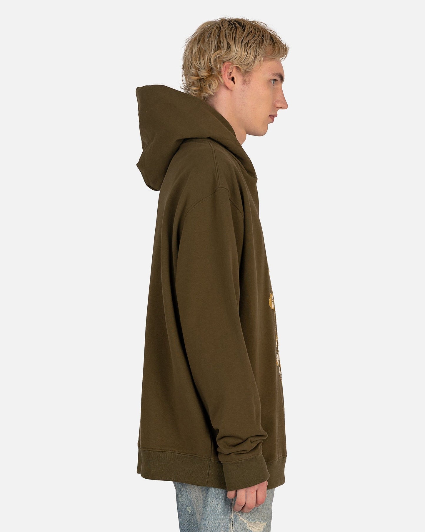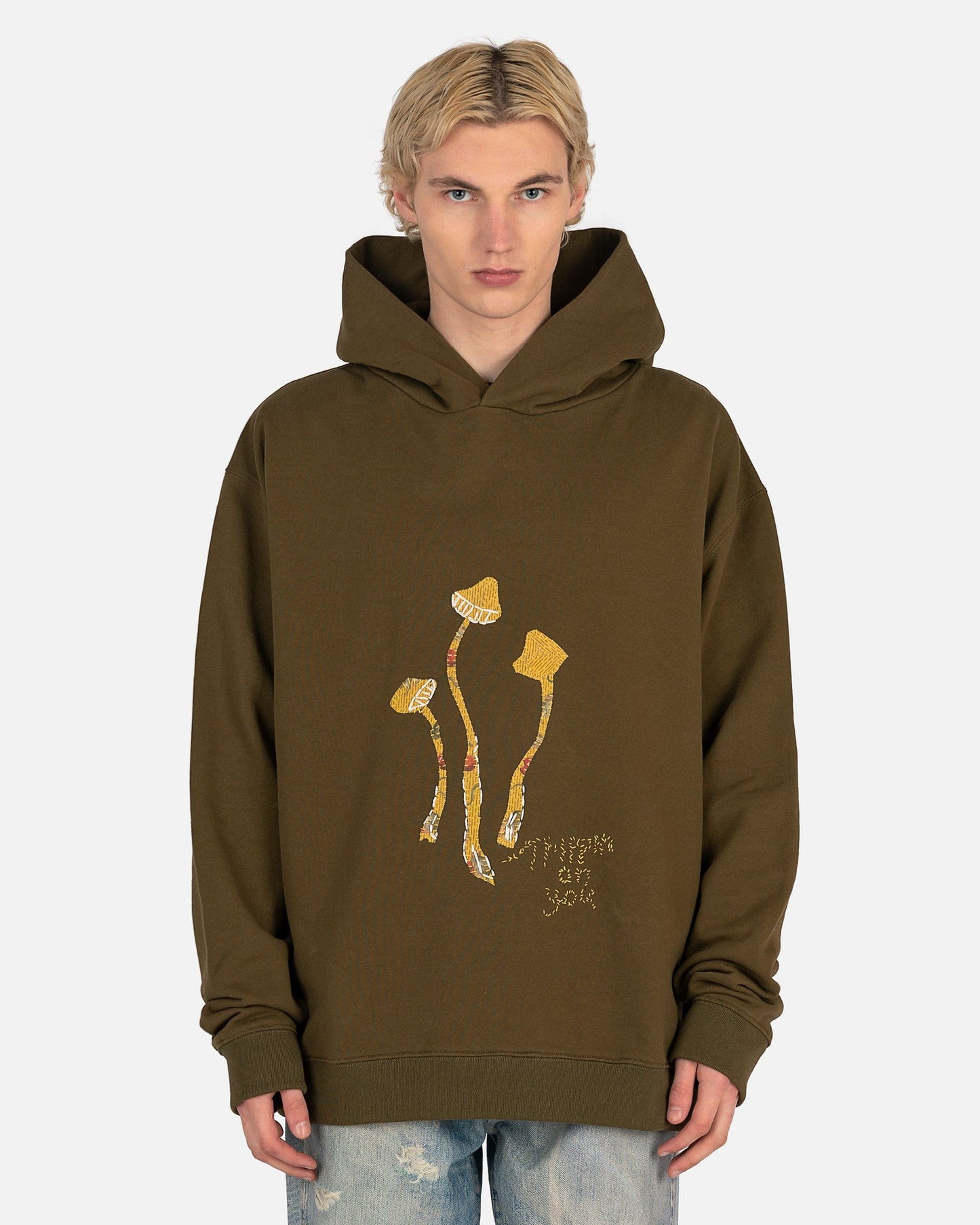 Maison Margiela men's mushroom embroidered hoodie in green. This hoodie has drop shoulders and long sleeves. There is an embroidered graphic of mushrooms on the front with the text 'trippin on you.' The hem and cuffs are ribbed.