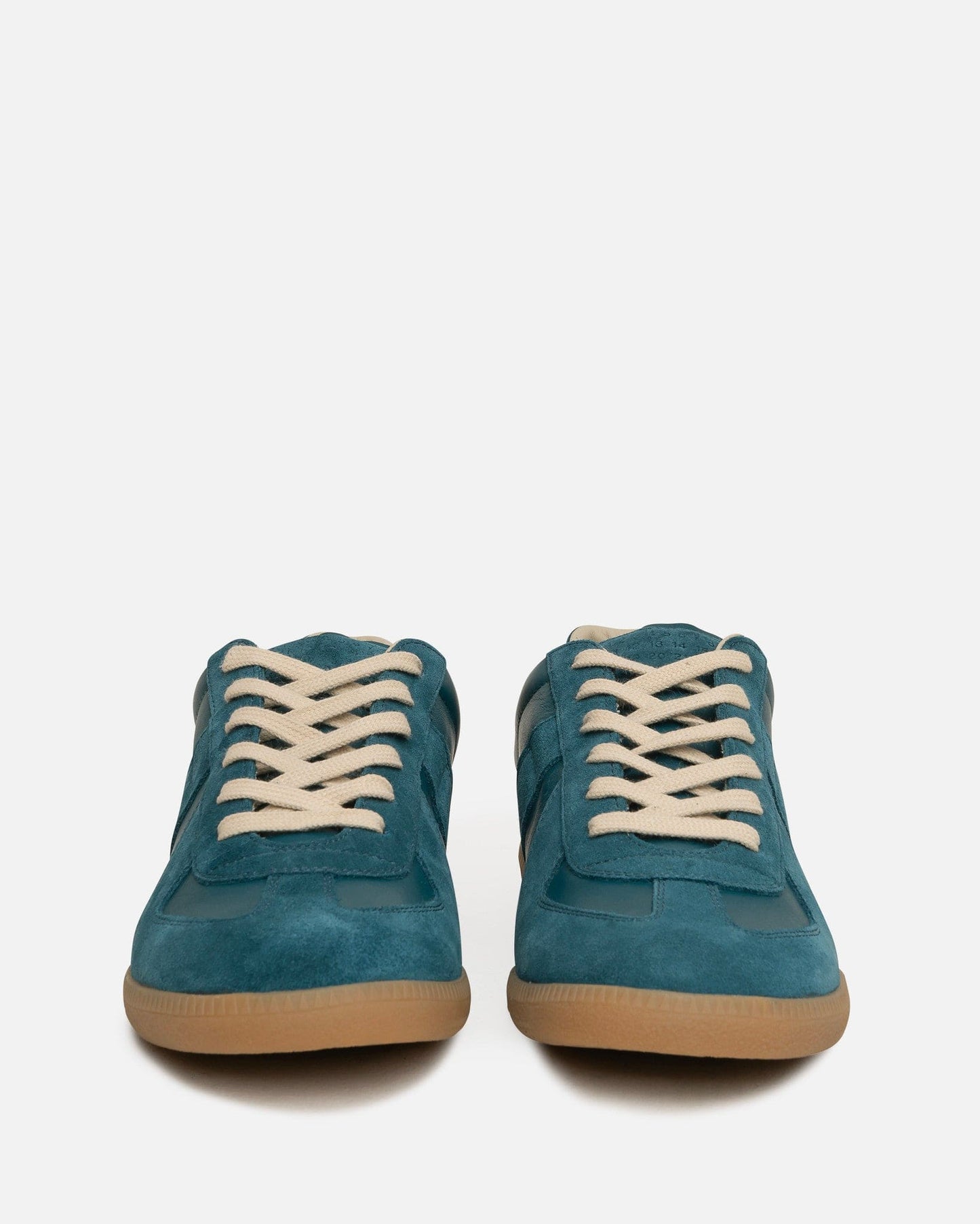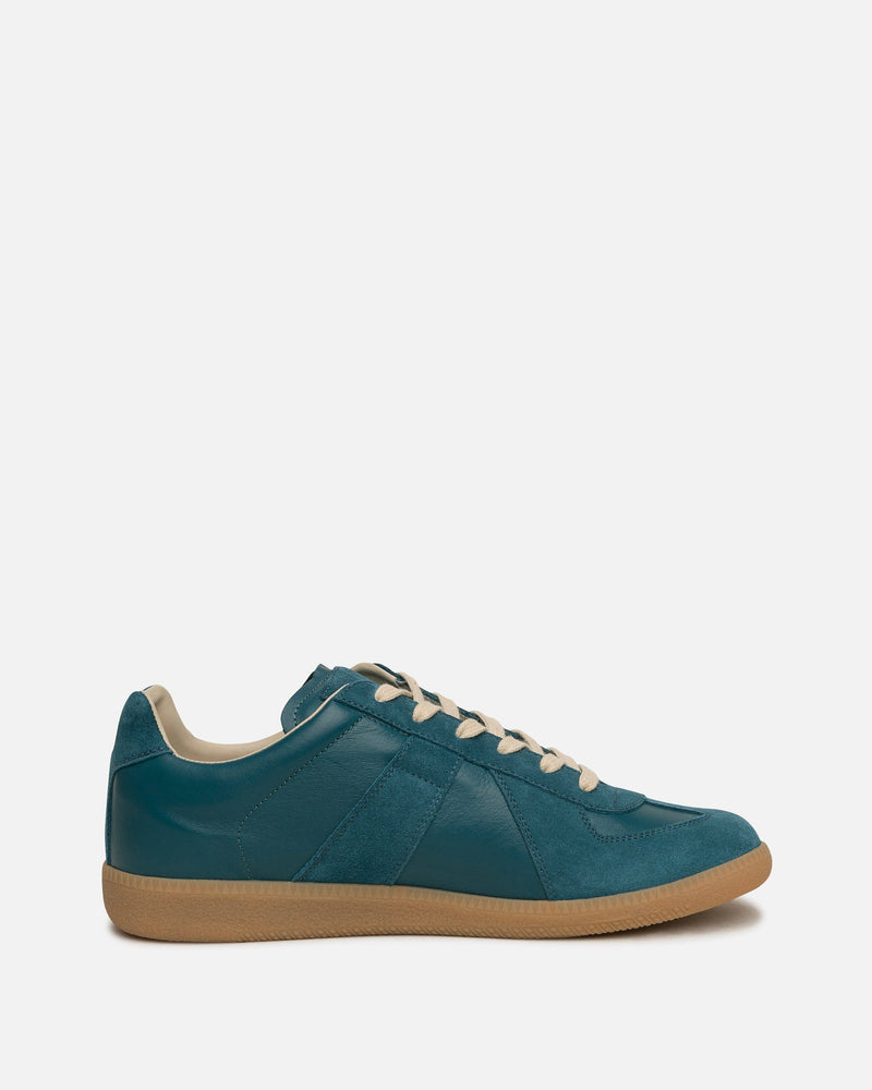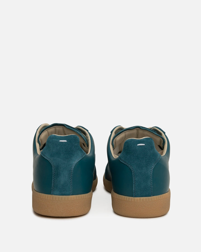 Maison Margiela men's low-top paneled sneakers in Forest green. These sneakers are made with premium bovine leather and suede paneling. The signature single stitch moniker graces the back heel.