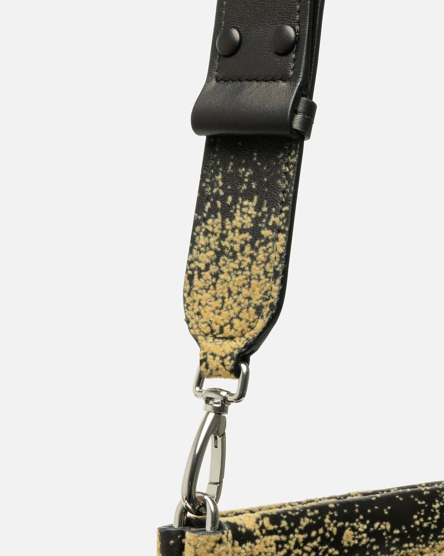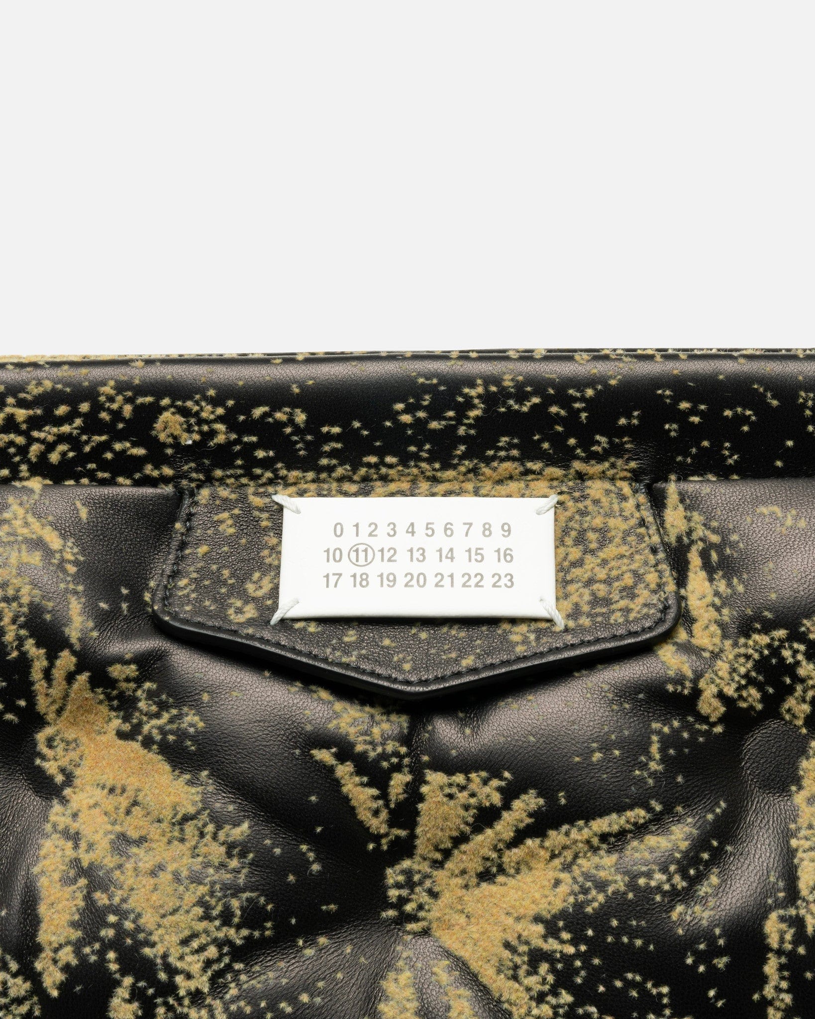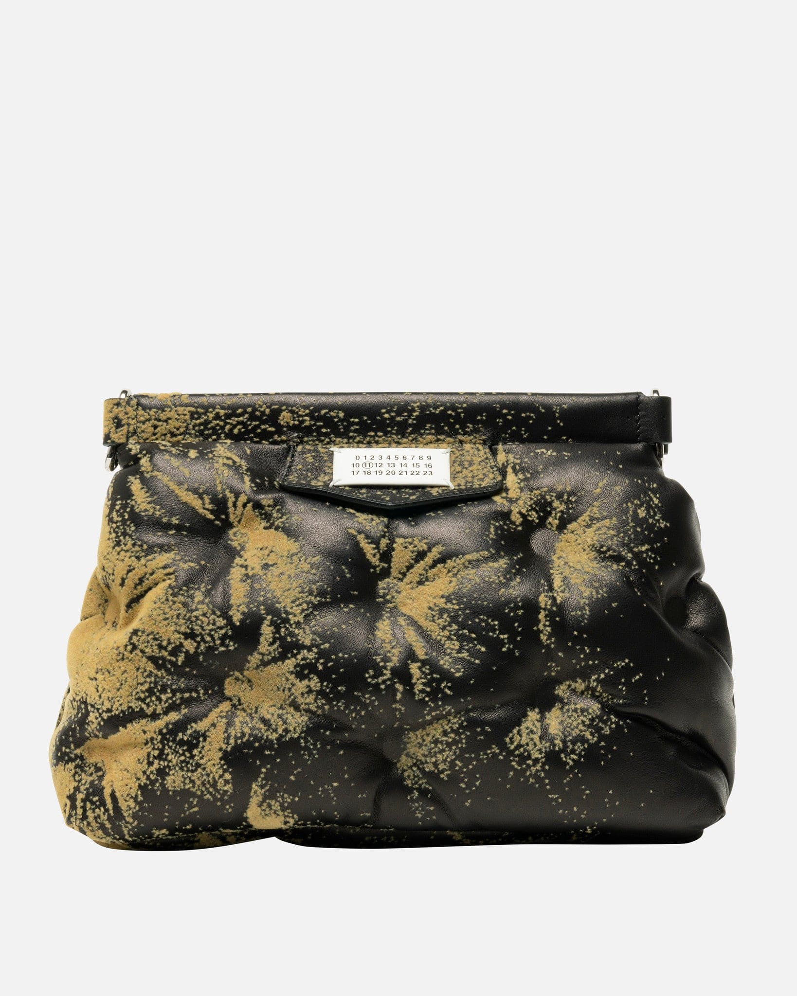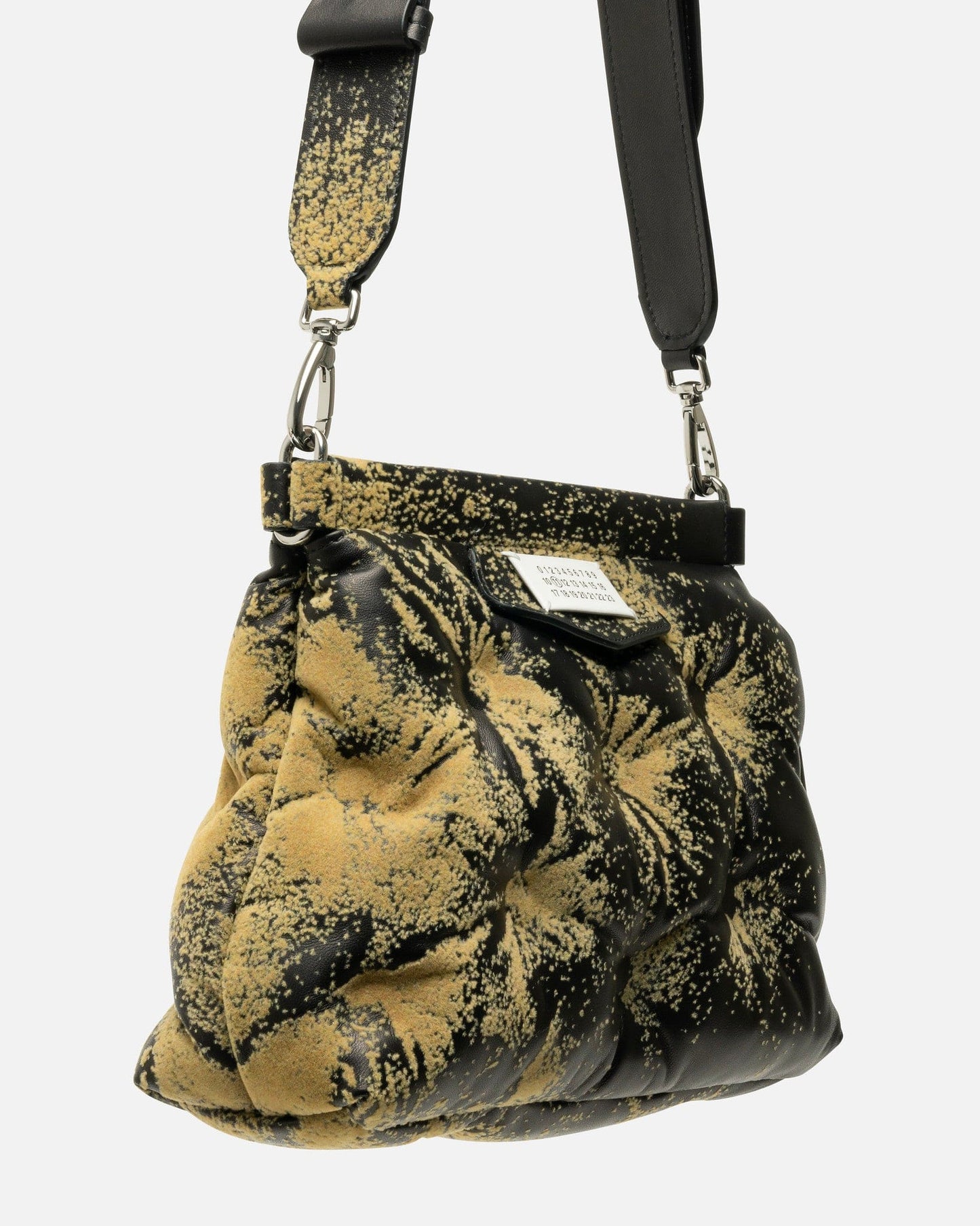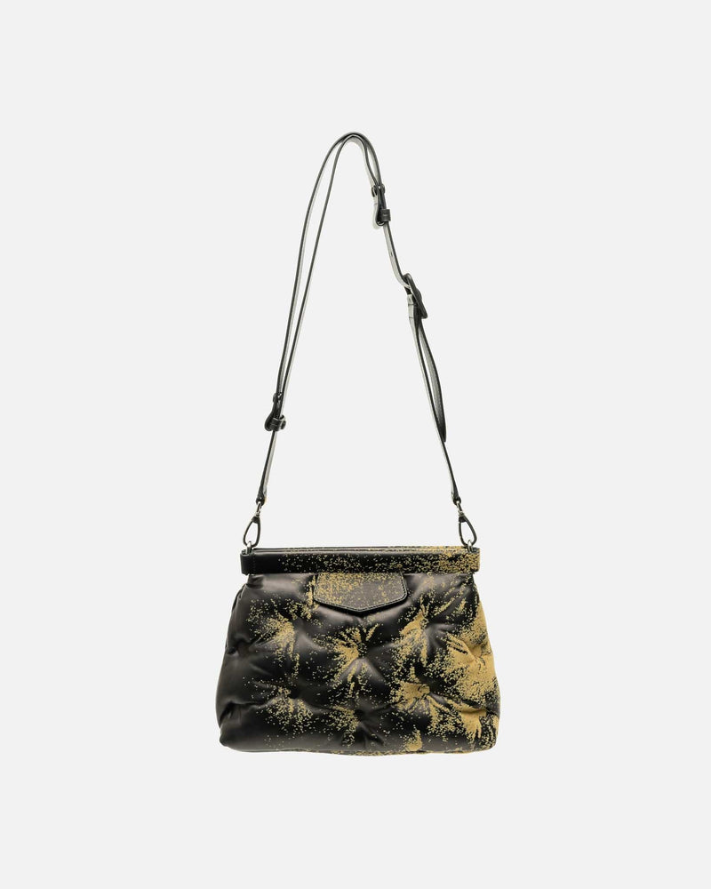 Maison Margiela Sandstorm Flock Print Small Glam Slam Classique in Black. The outer lining of this bag has been heat-sealed to give a quilted effect. On the outer lining is flocking sandstorm detailing and a logo patch on the front. To complete the design, there is a detachable shoulder strap, silver-plated metal hardware, an internal pocket with a zip compartment and a snap closure on the outside of the bag.