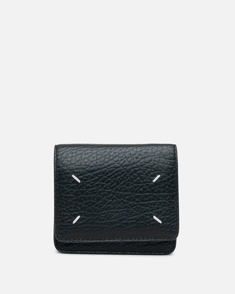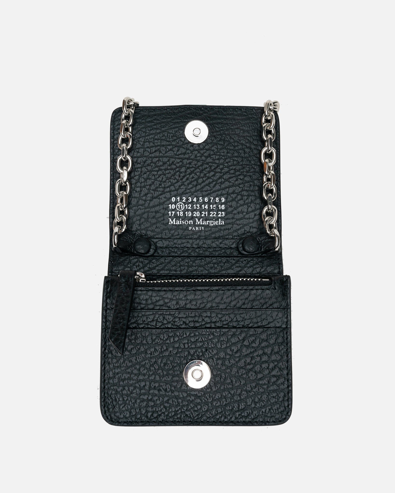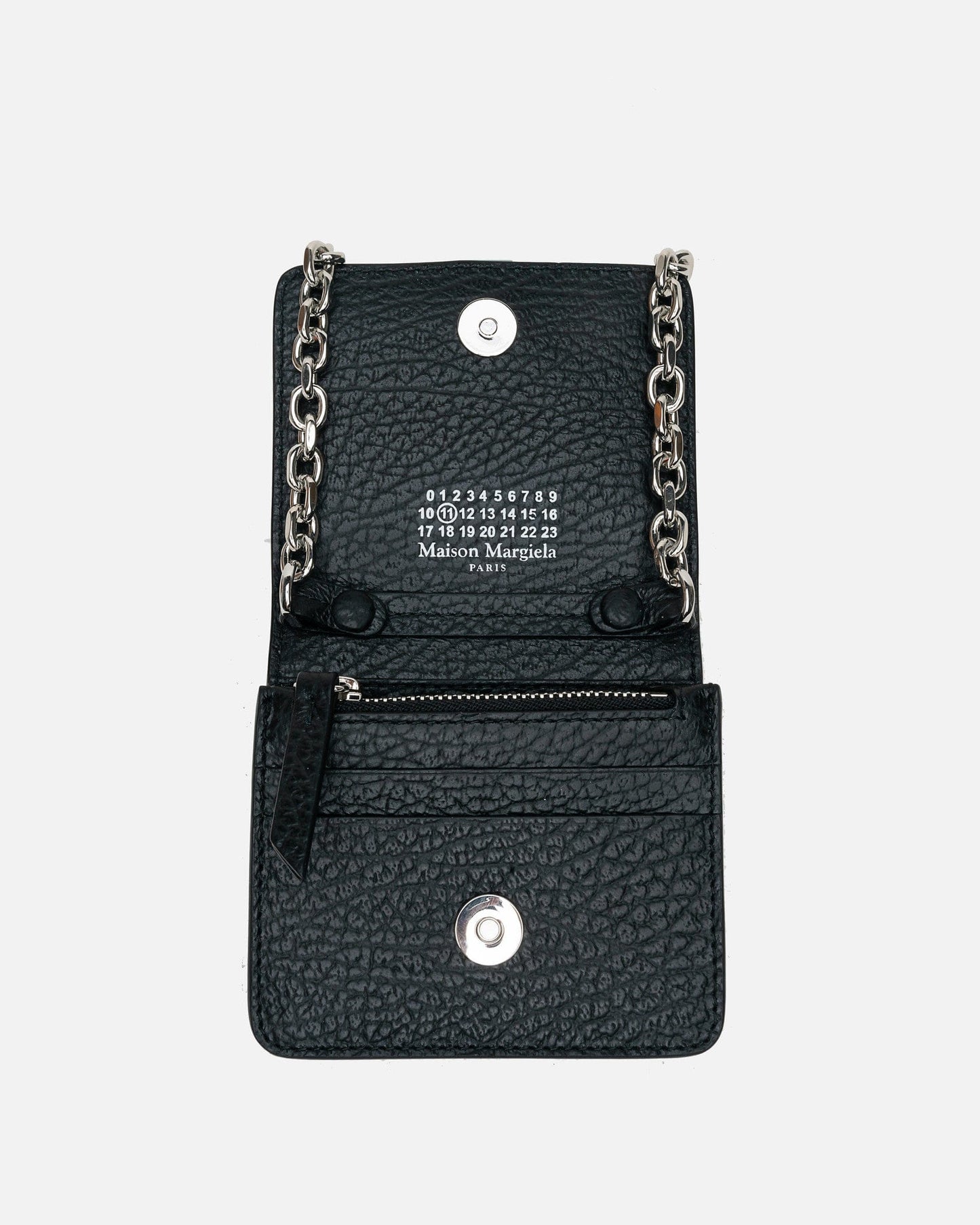 Maison Margiela women's leather chain wallet in black. This shoulder wallet is made of black calfskin leather. It has an interior zippered pocket and uses magnetic button closure. The interior flap has the Margiela logo printed under the button. The wallet has a silver chained strap to rest comfortably on the shoulder.