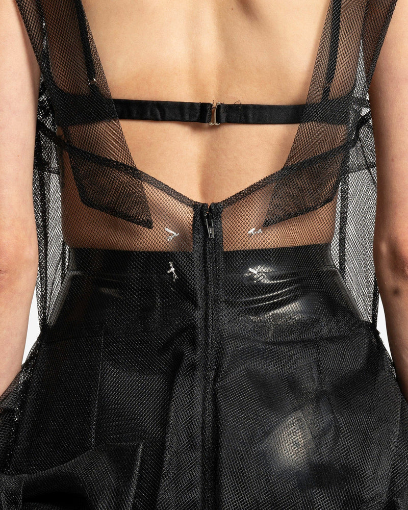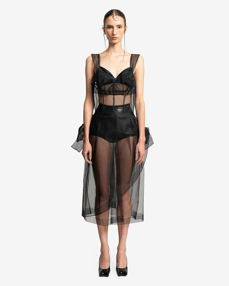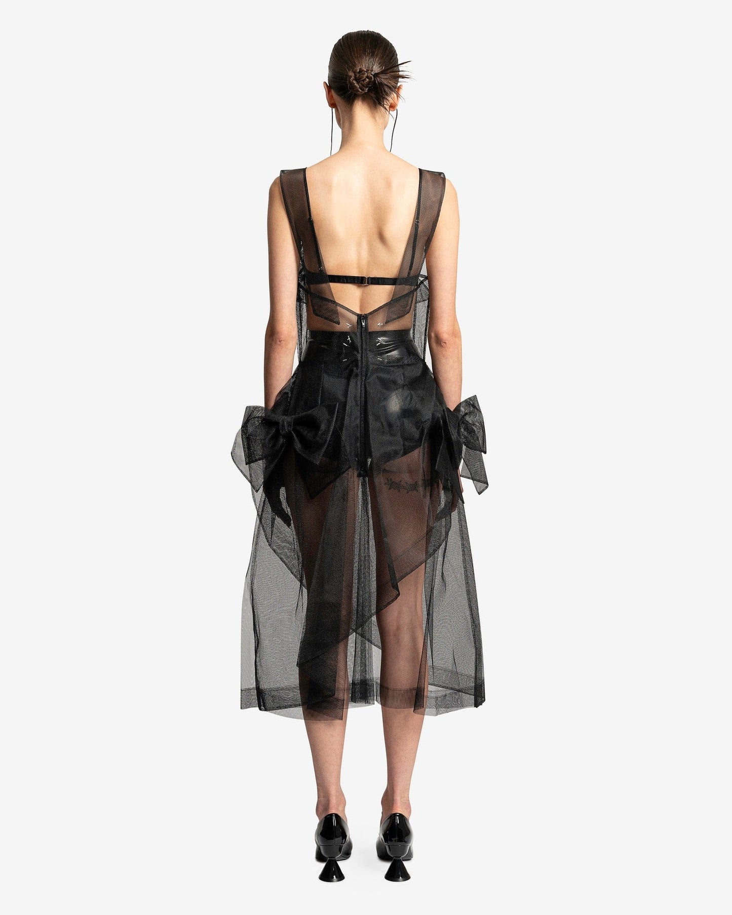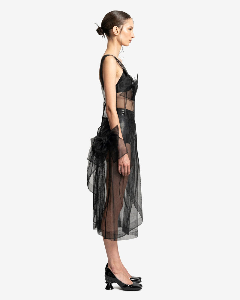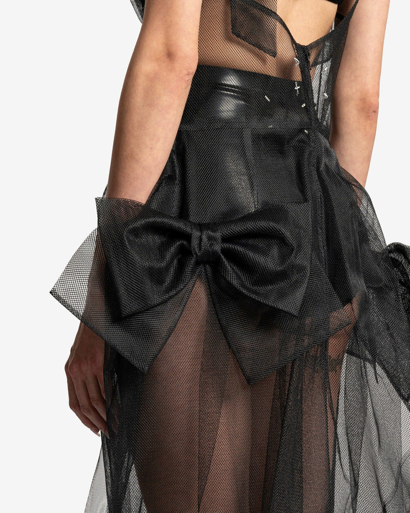 Maison Margiela women’s Tulle Midi Dress in Black. This dress is crafted in pure tulle, featuring oversized bows on either side of the garment. The top half of the garment has a corset structure design.
