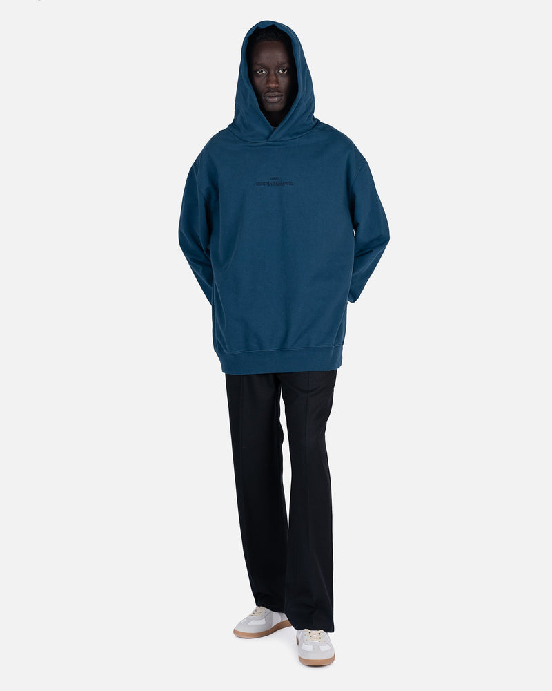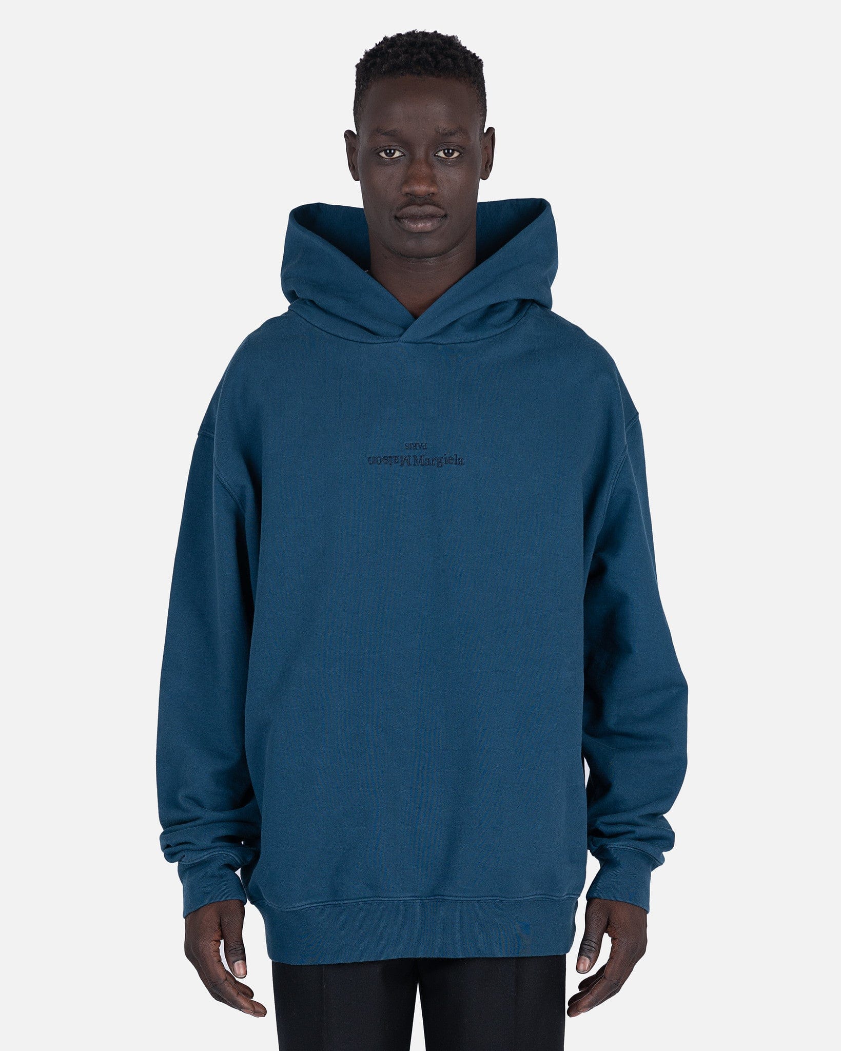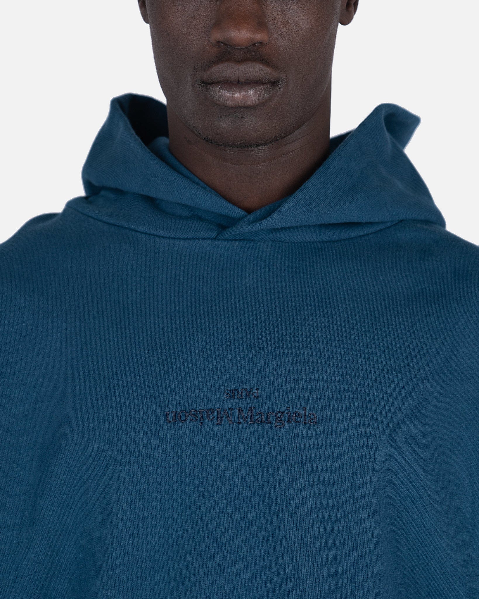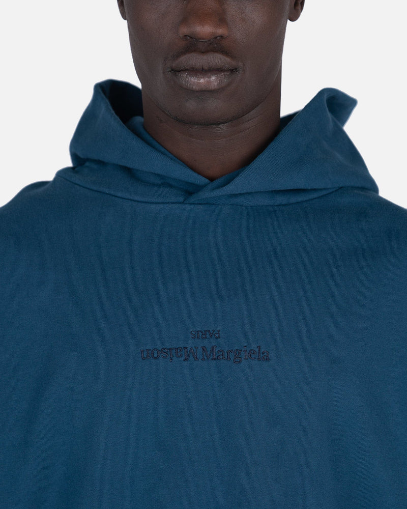 Maison Margiela men's upside down logo hoodie in blue. This hooded sweatshirt has an oversized fit and features the upside down logo embroidered onto the center of the chest.