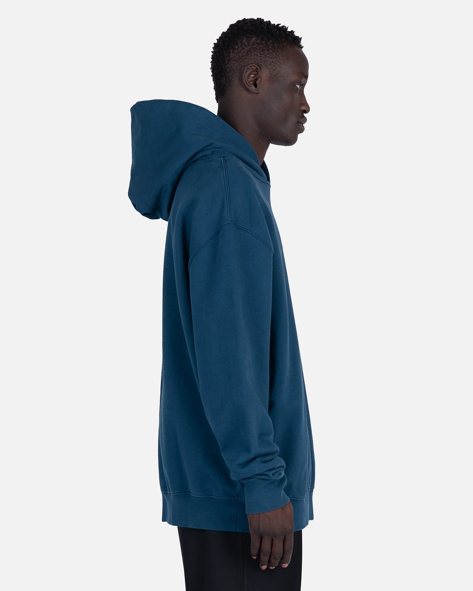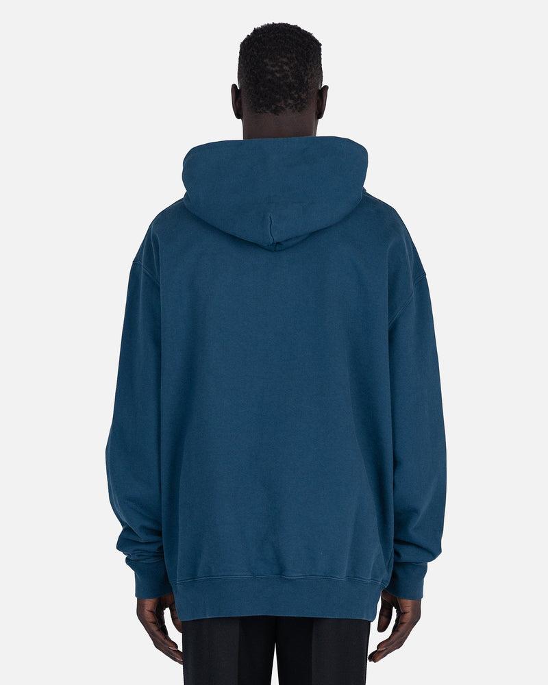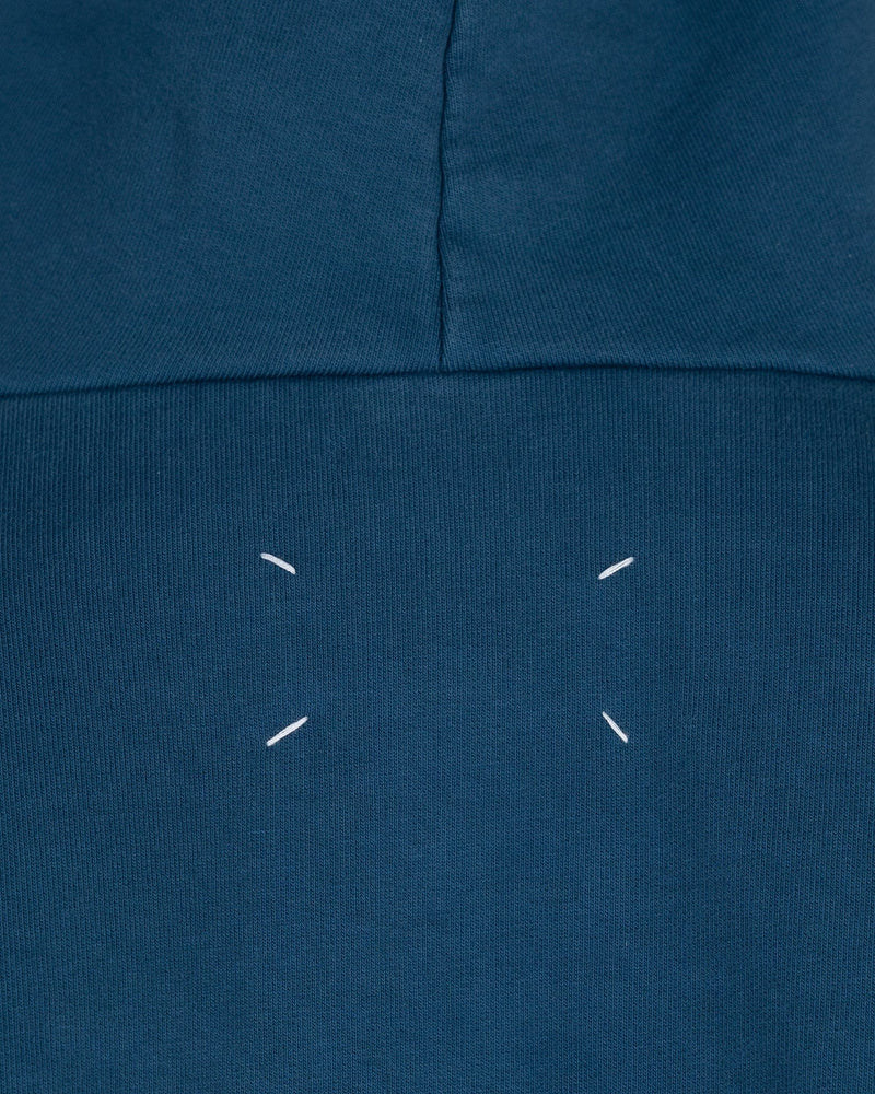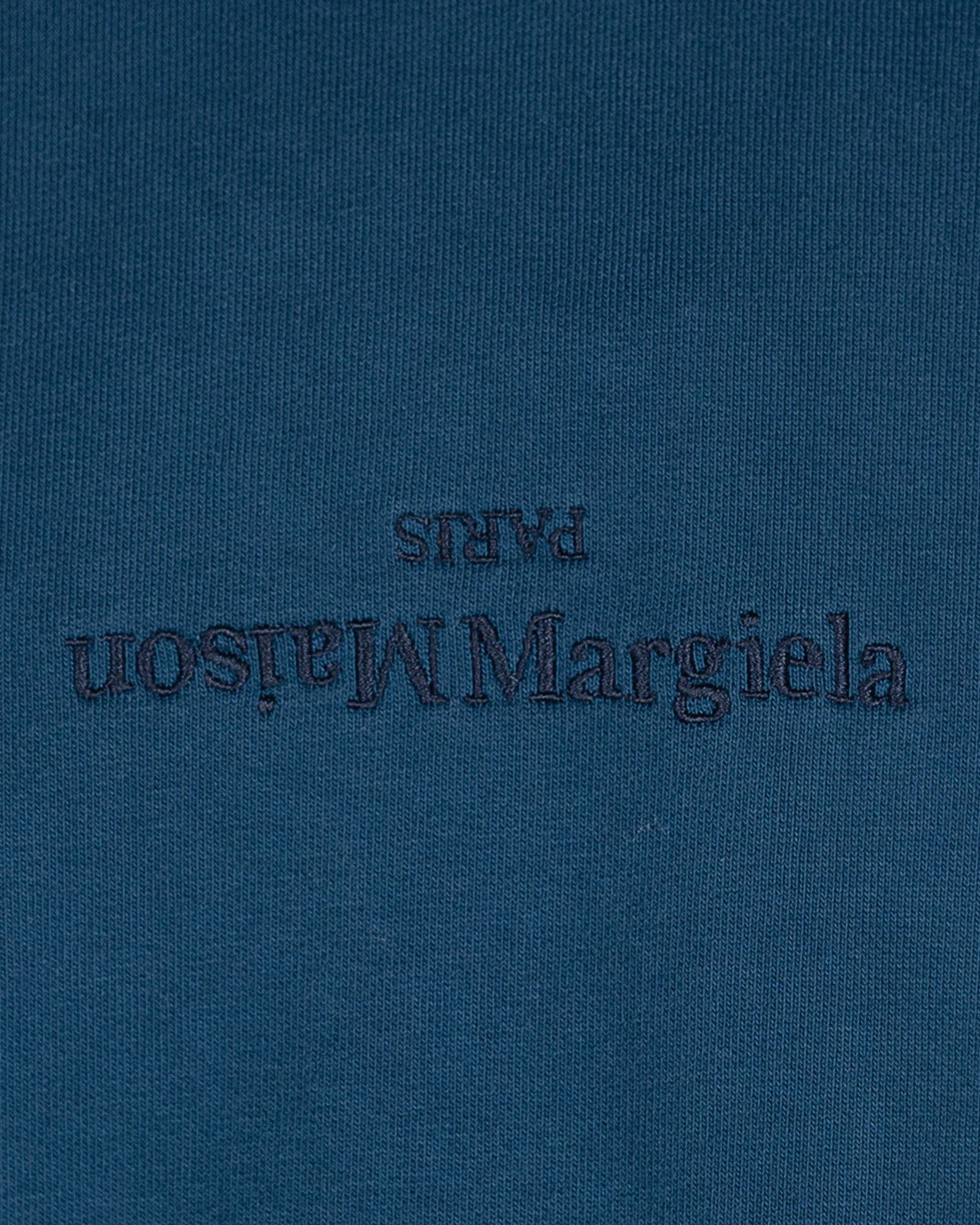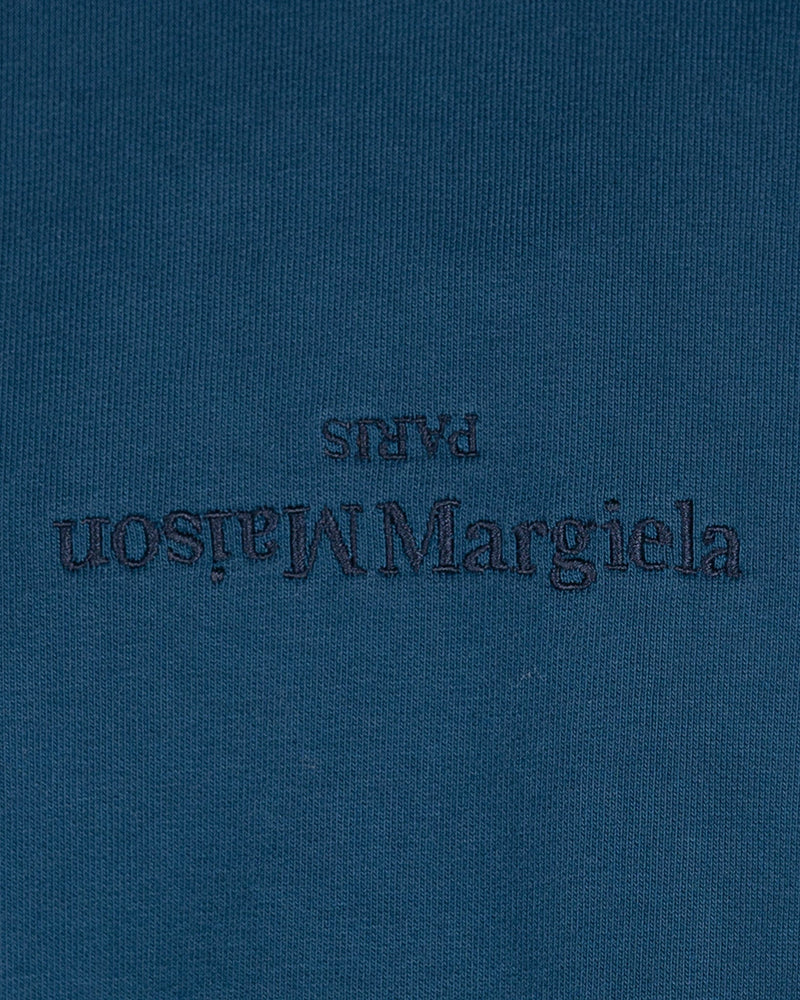 Maison Margiela men's upside down logo hoodie in blue. This hooded sweatshirt has an oversized fit and features the upside down logo embroidered onto the center of the chest.