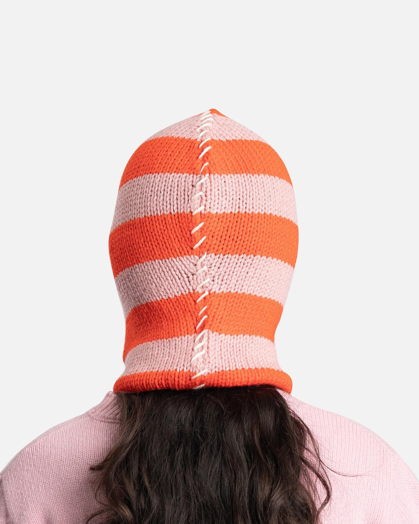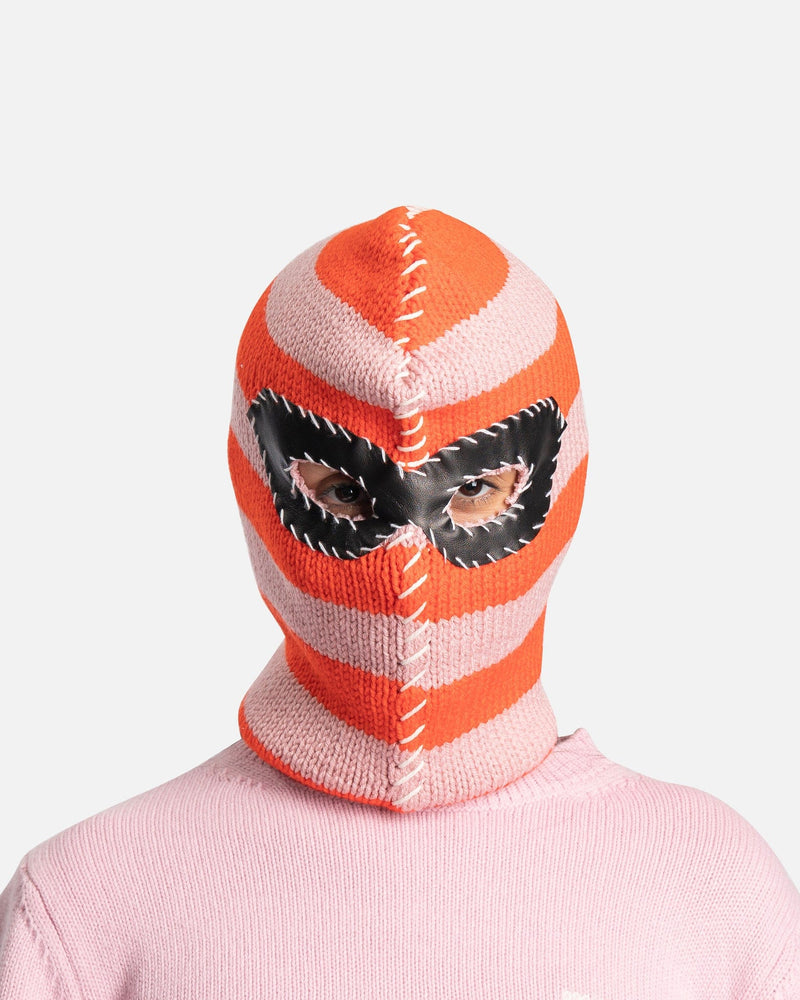 Marni striped balaclava in pink and orange. This hat features stitching details, a green leather panel embroidered around the eyes, and a rib knit cuff.
