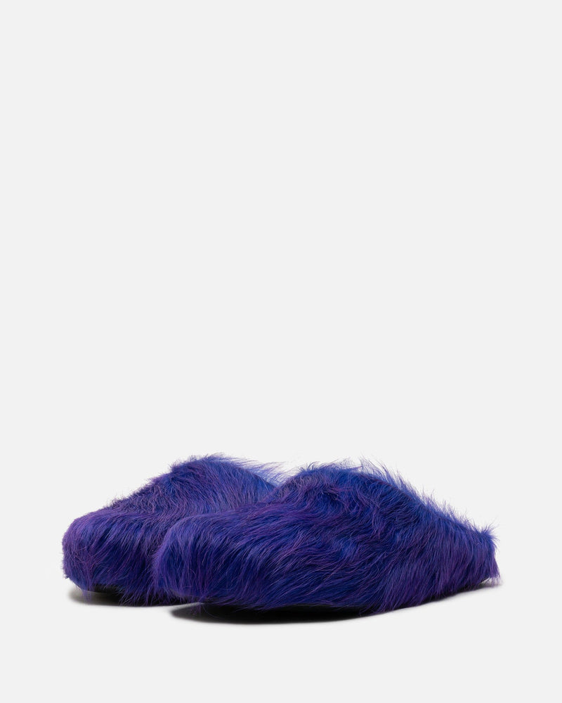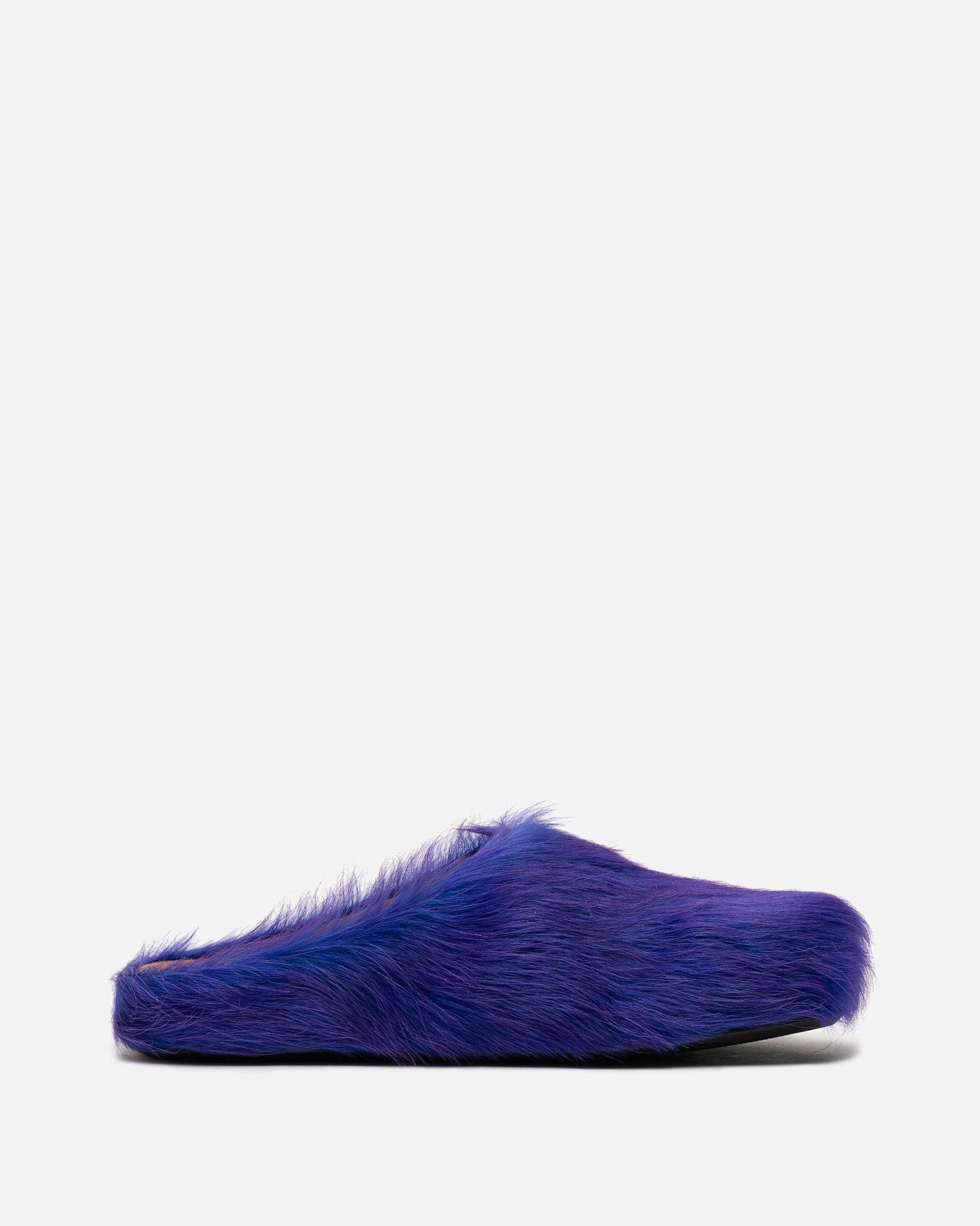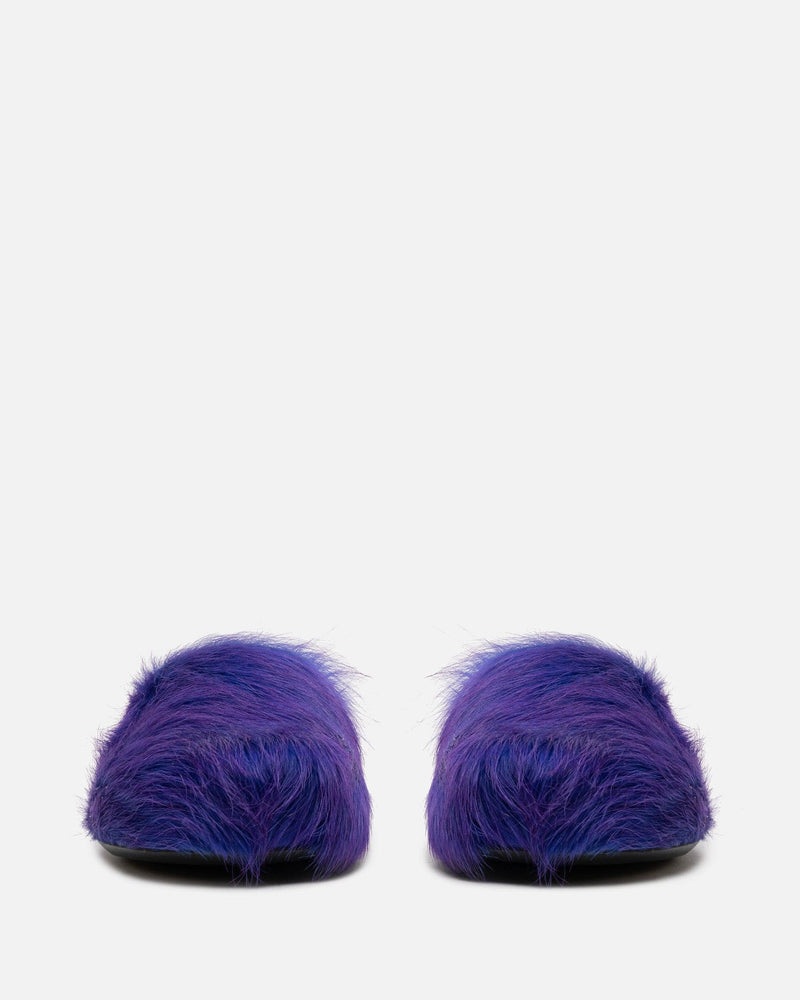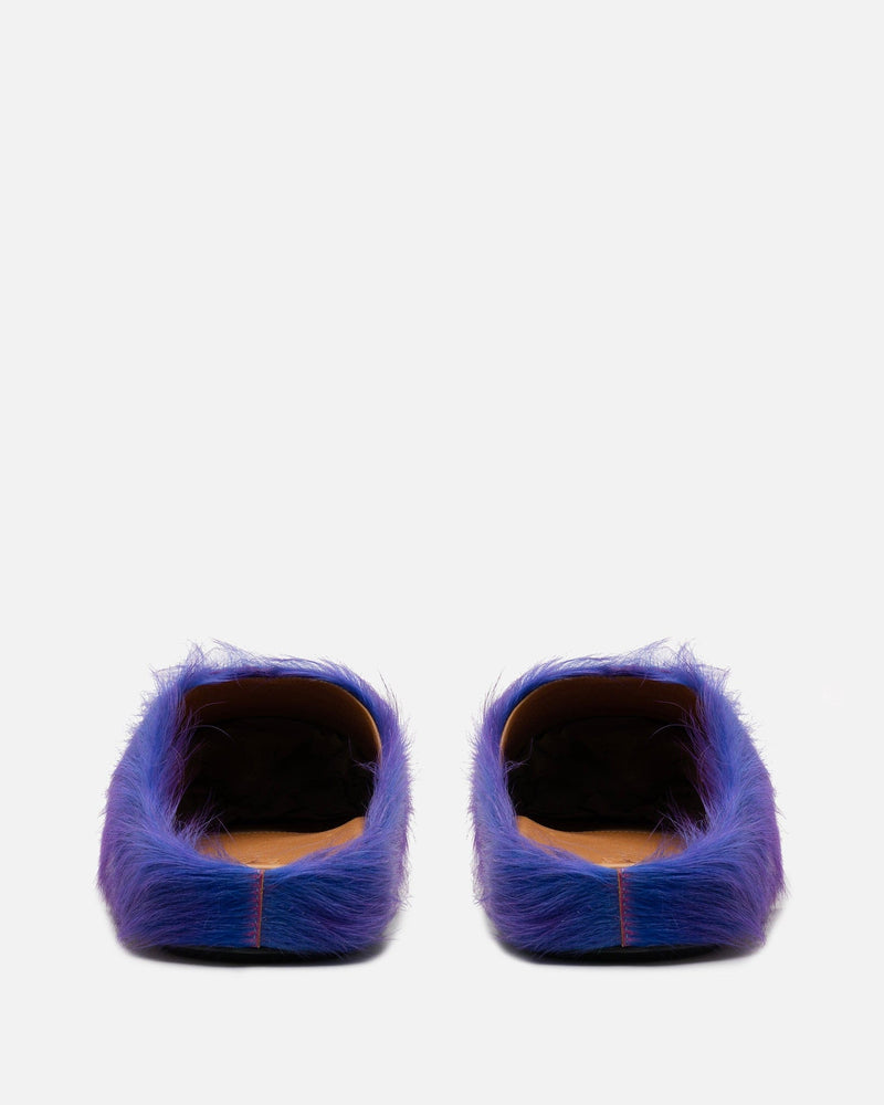 Marni Sabot long haired fur mules in purple. These shoes are made from calf hair covered leather featuring a round toe line and a slip-on design.