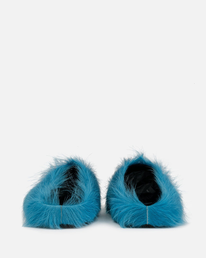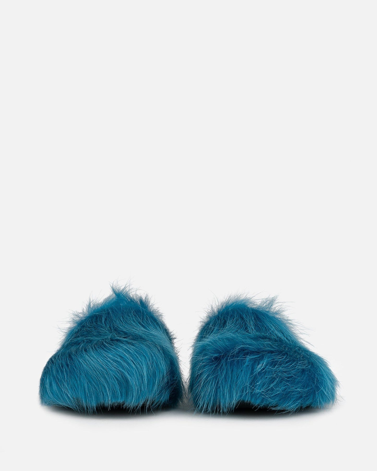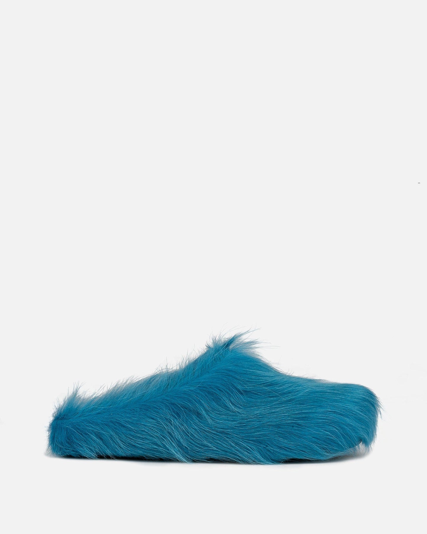 Marni Sabot fur mules in blue are made from calf hair covered leather featuring a round toe line and a slip-on design.