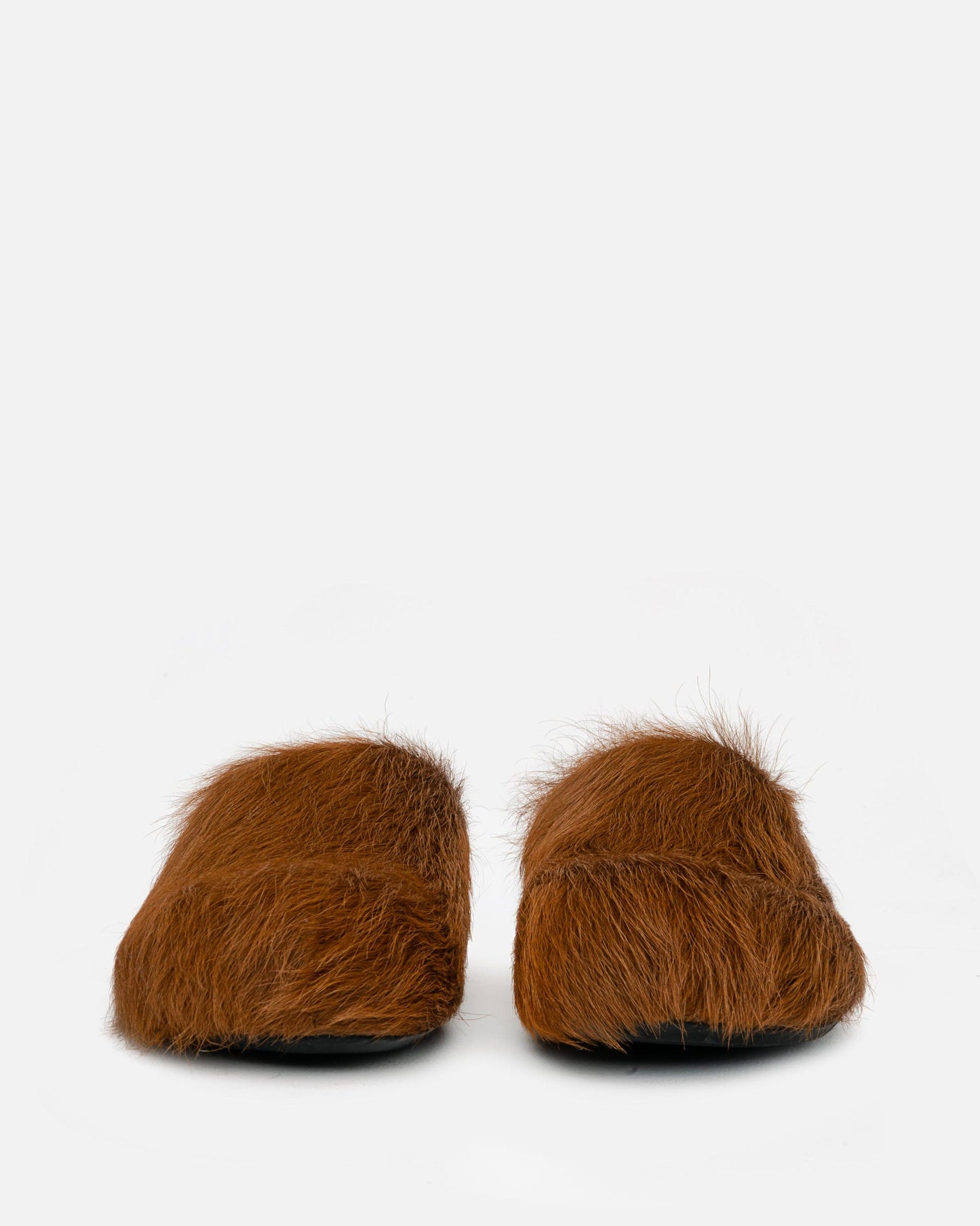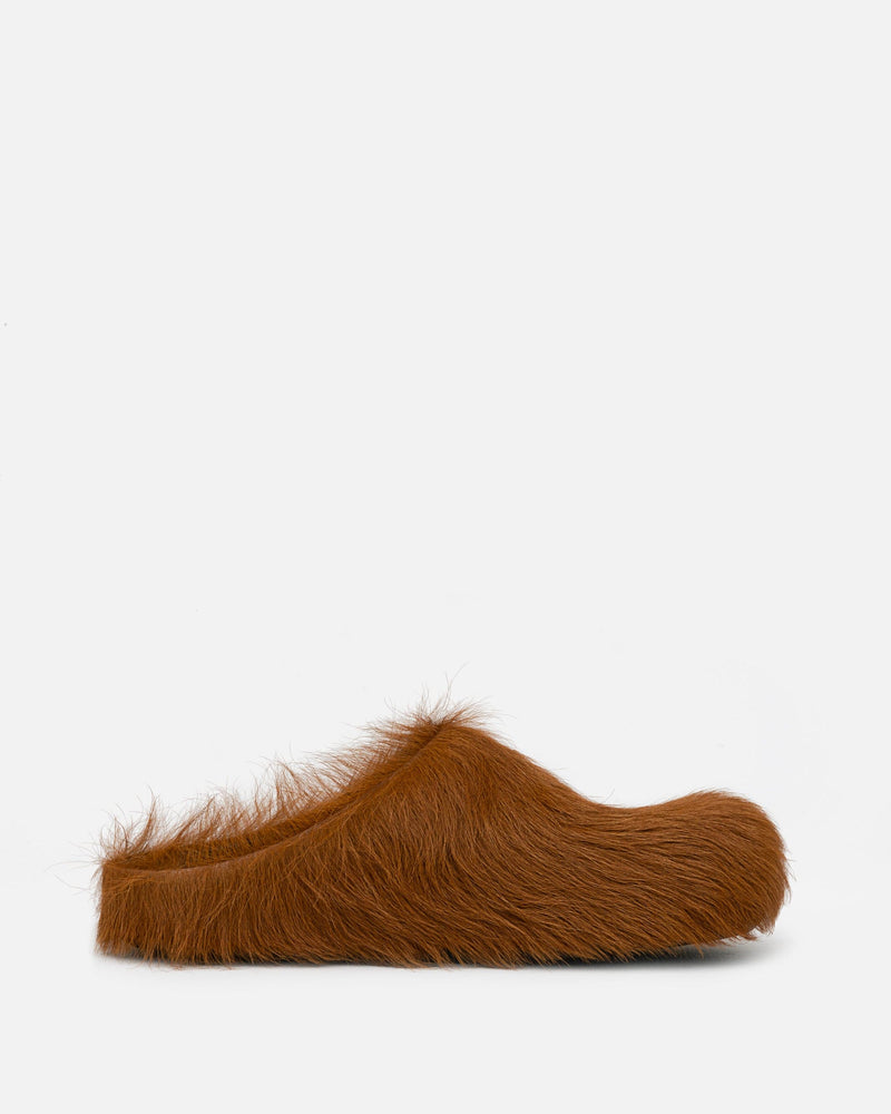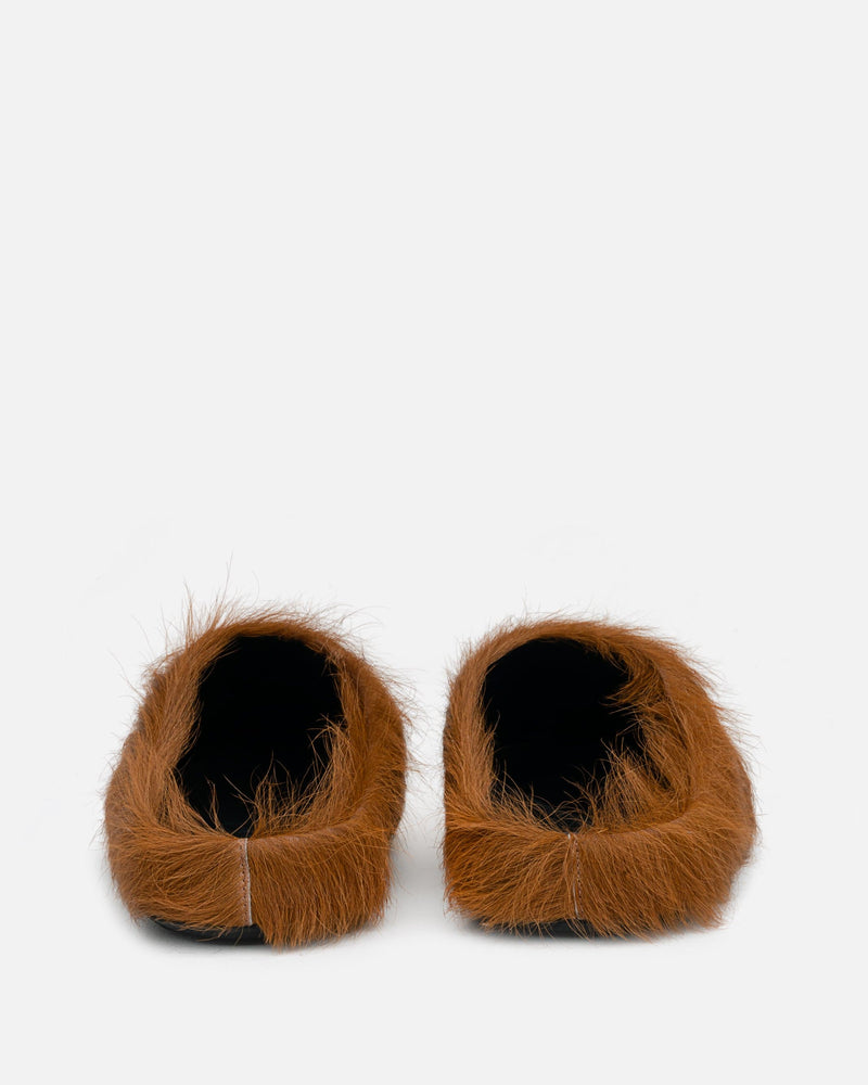 Marni Sabot fur mules in tobacco brown are made from calf hair covered leather featuring a round toe line and a slip-on design.