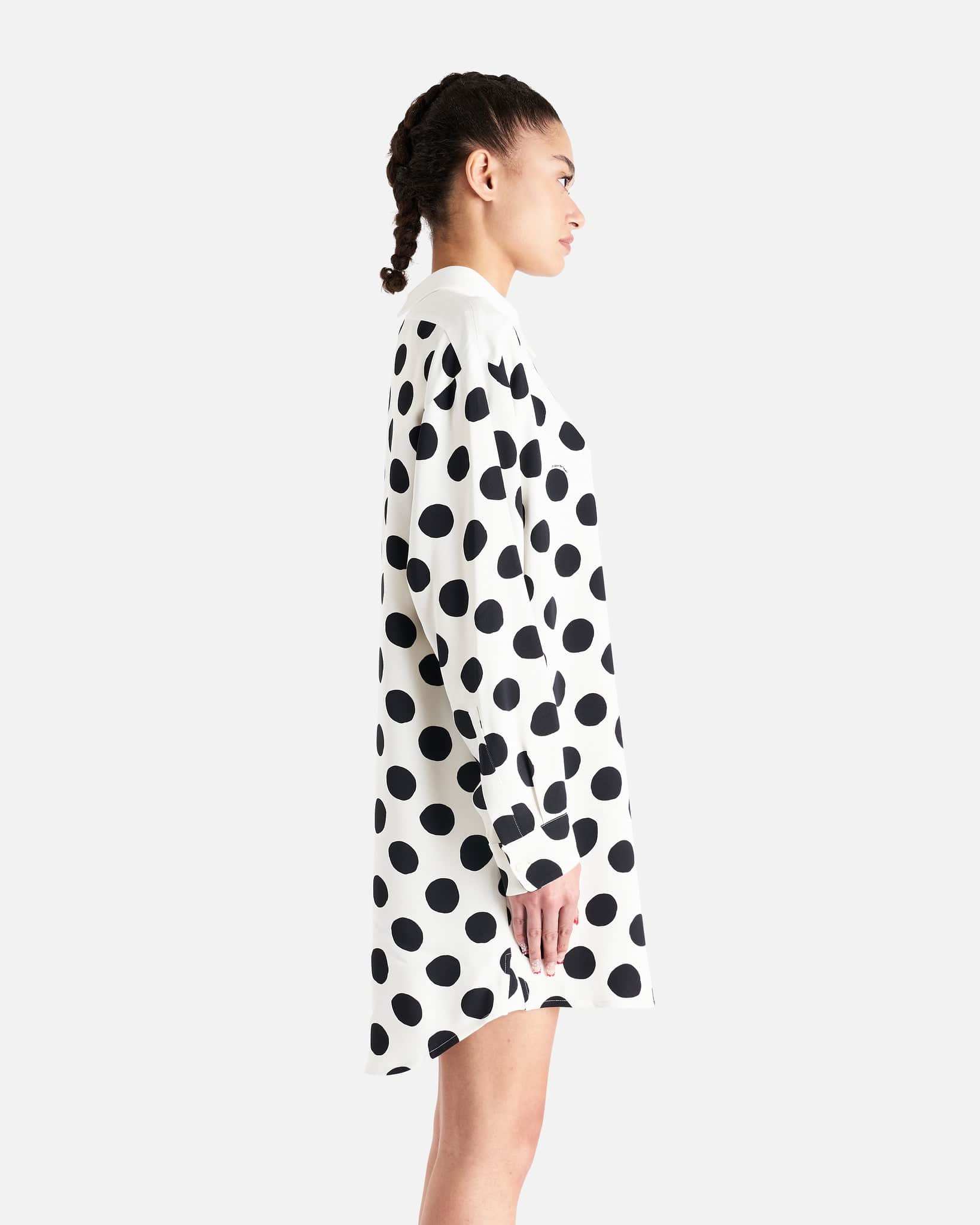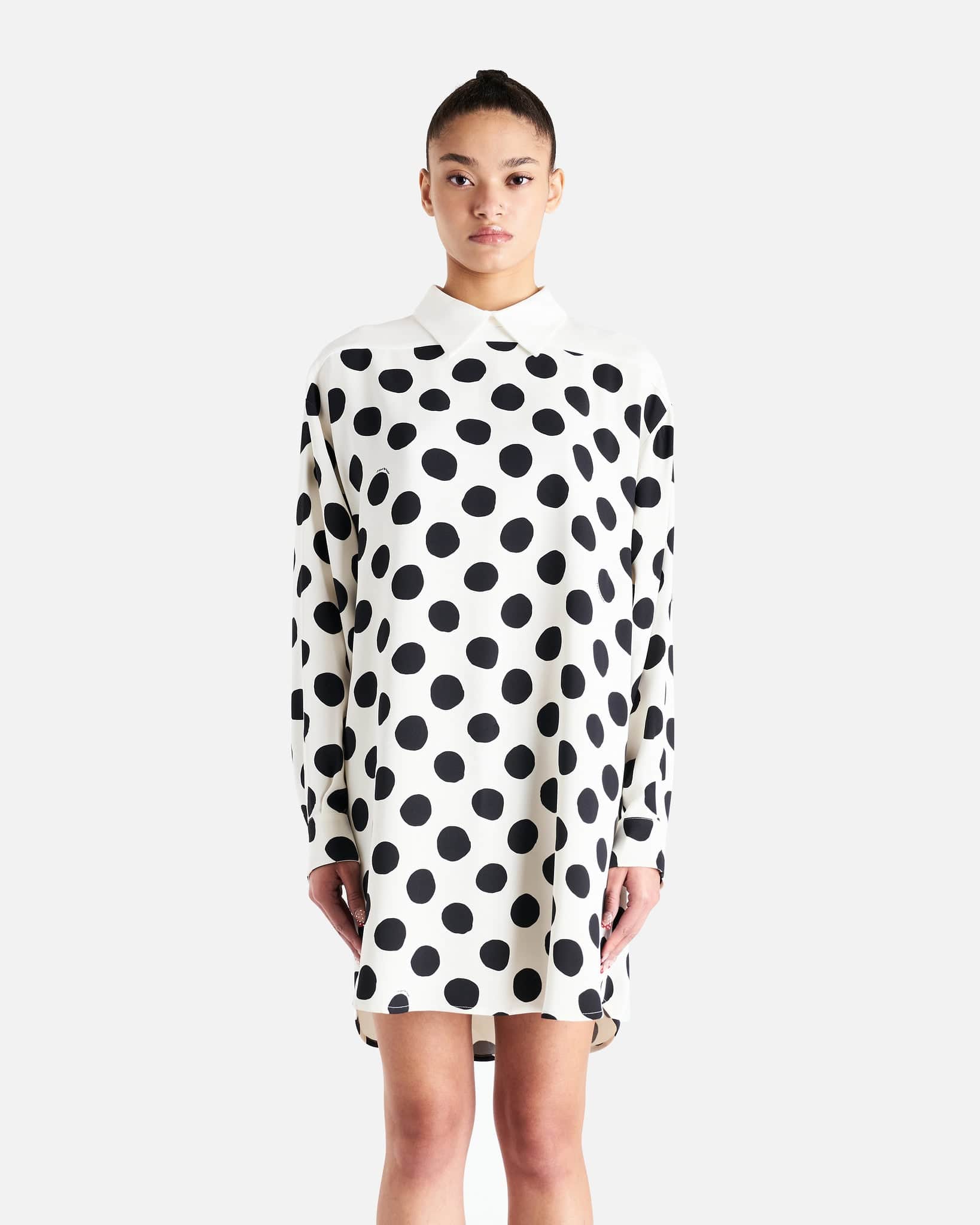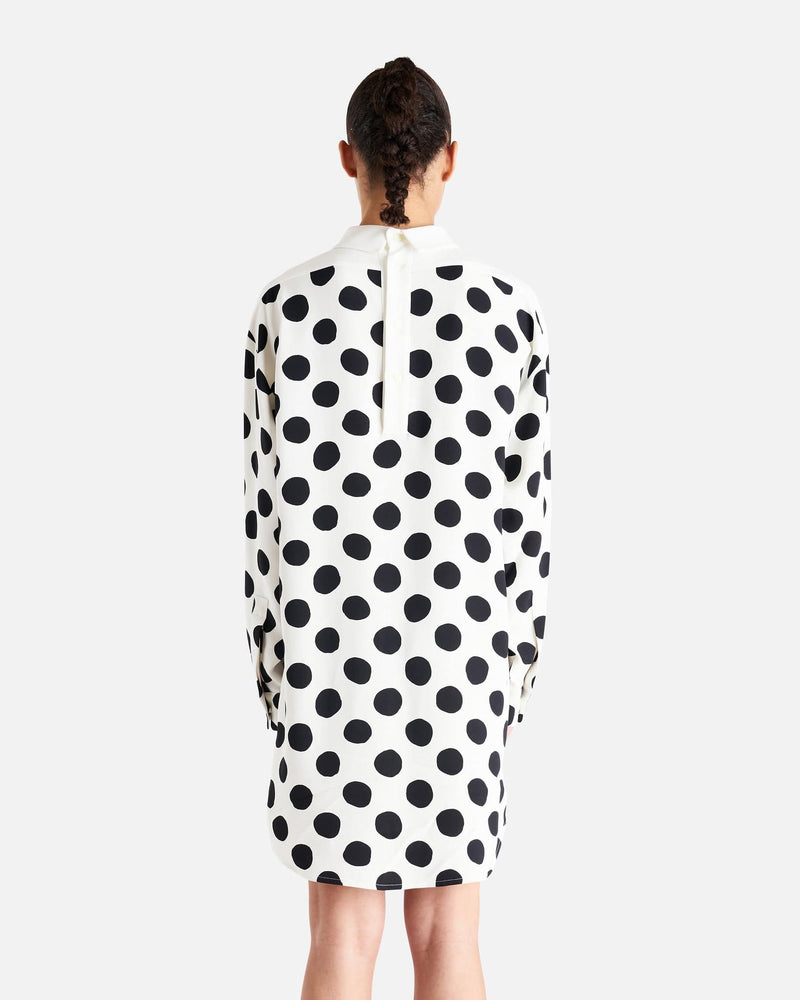 Marni women's polka dot shirt dress in white and black. This mini dress features a classic collar, long sleeves and back button closure.