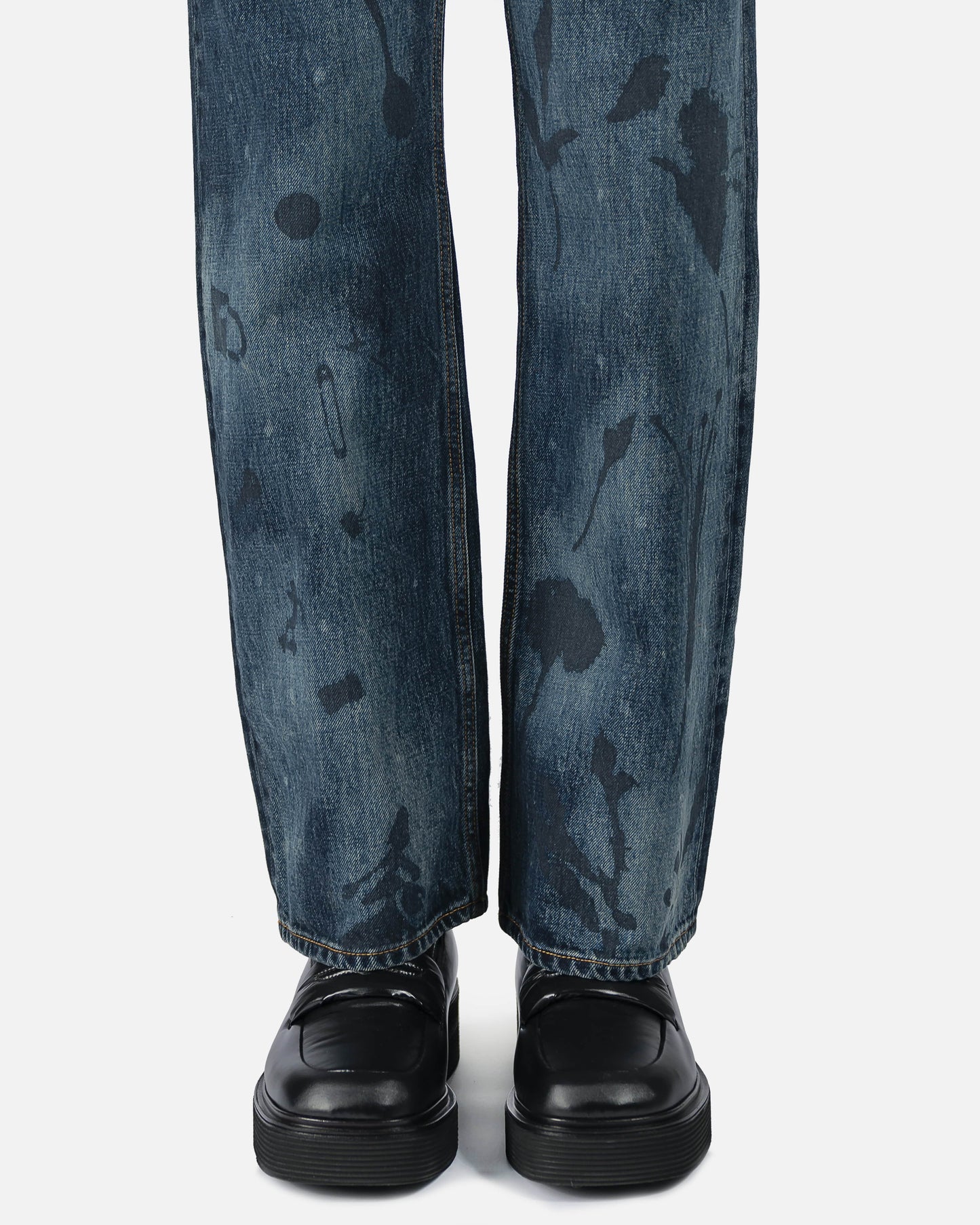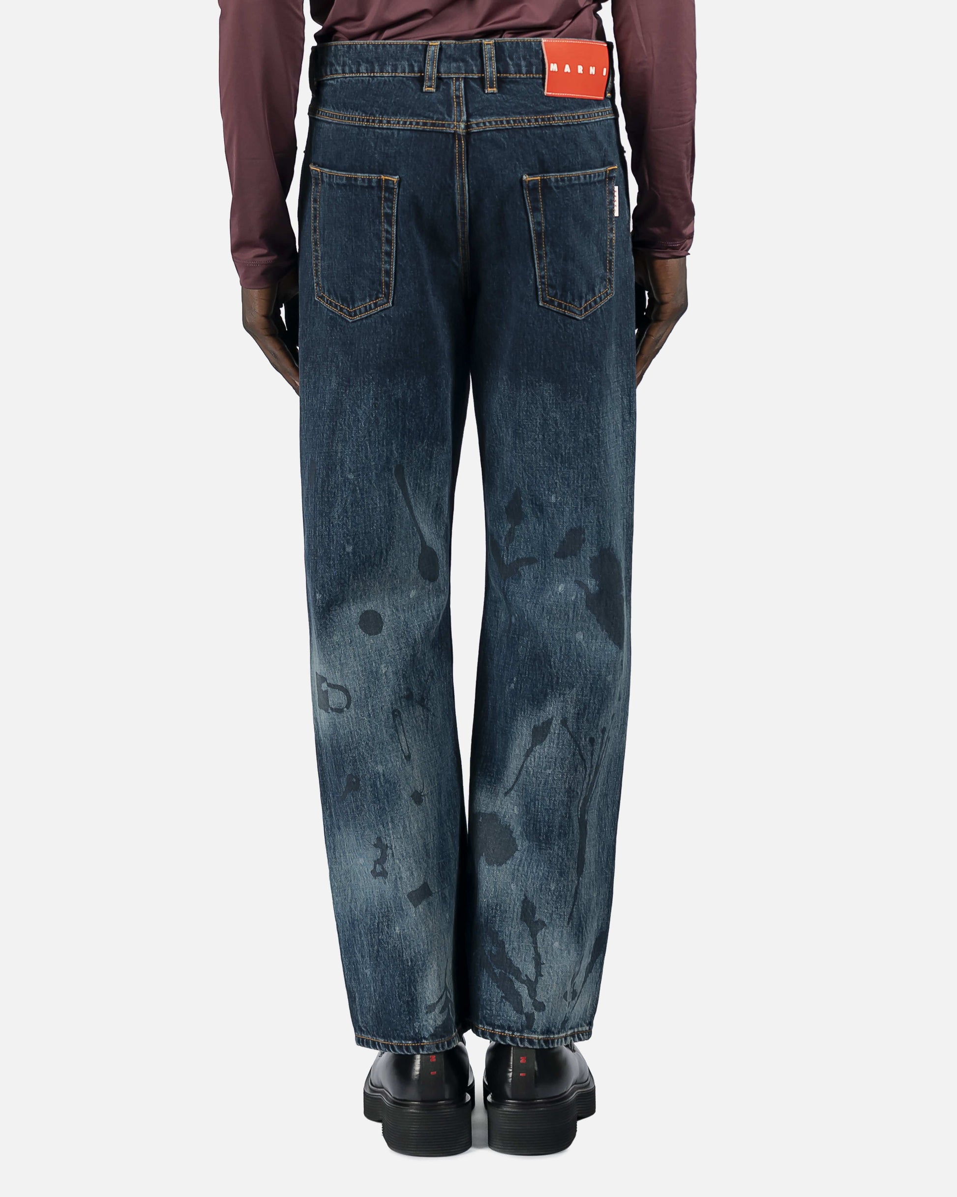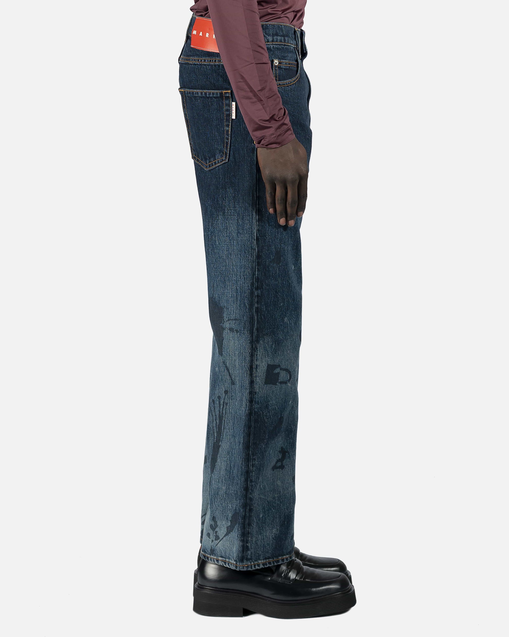 Traditional 5-pocket pants with loose fit and found objects motif corrosion treatment throughout. Branded metal buttons for waistband, zip closure and rivets only on the front. Marni label in leather on the back.