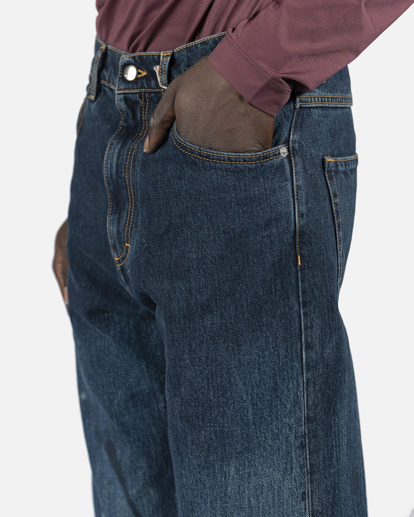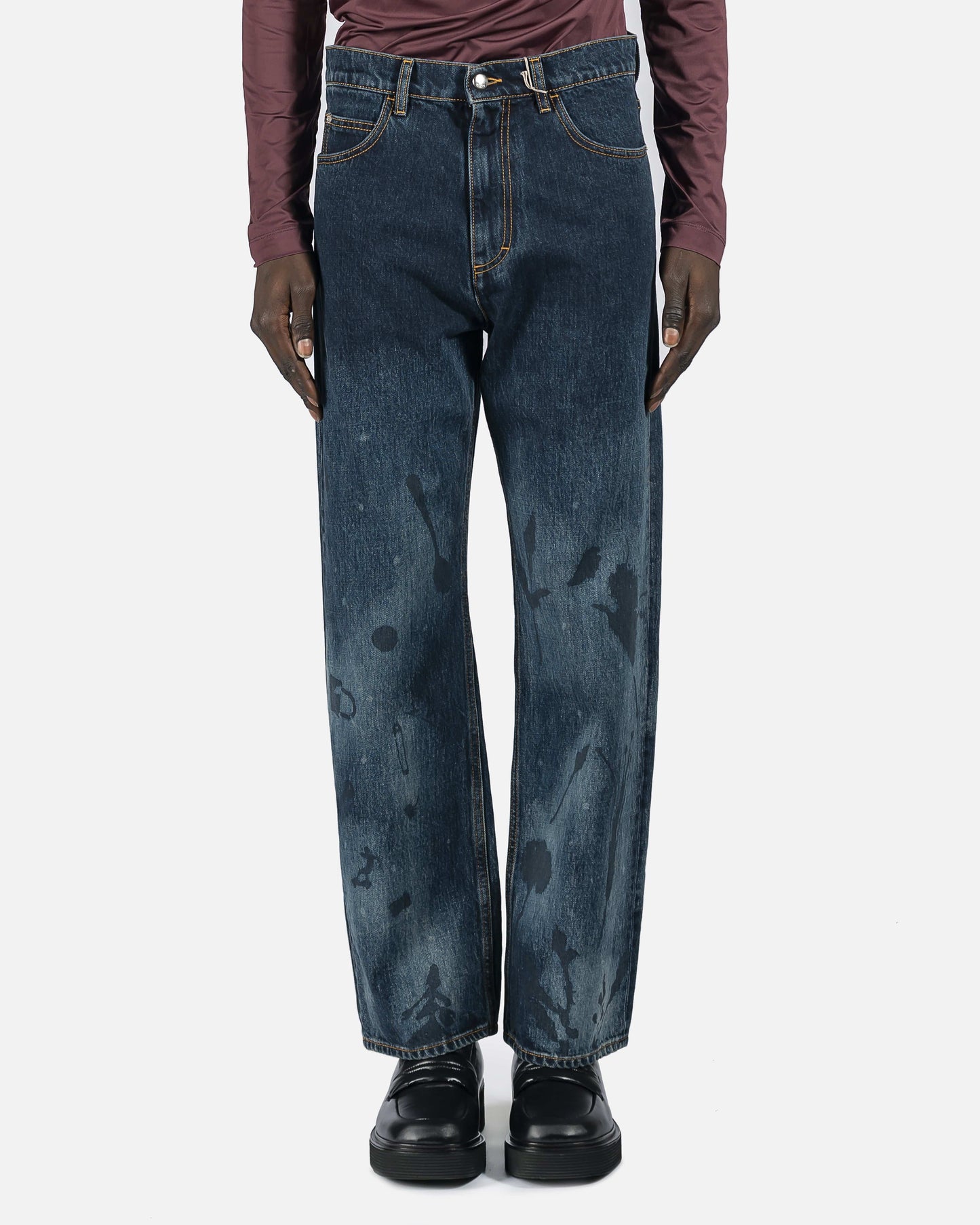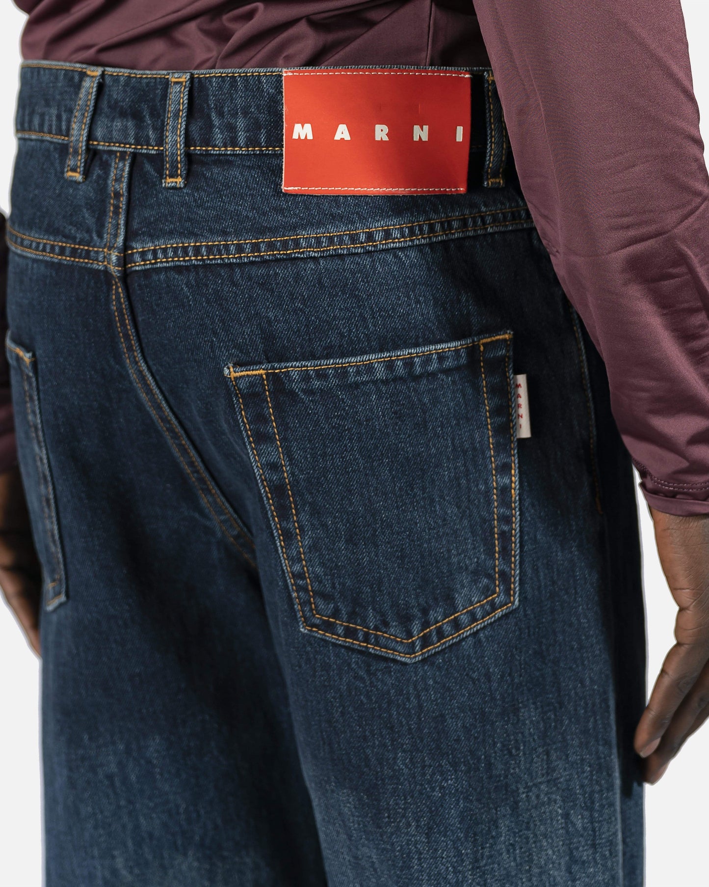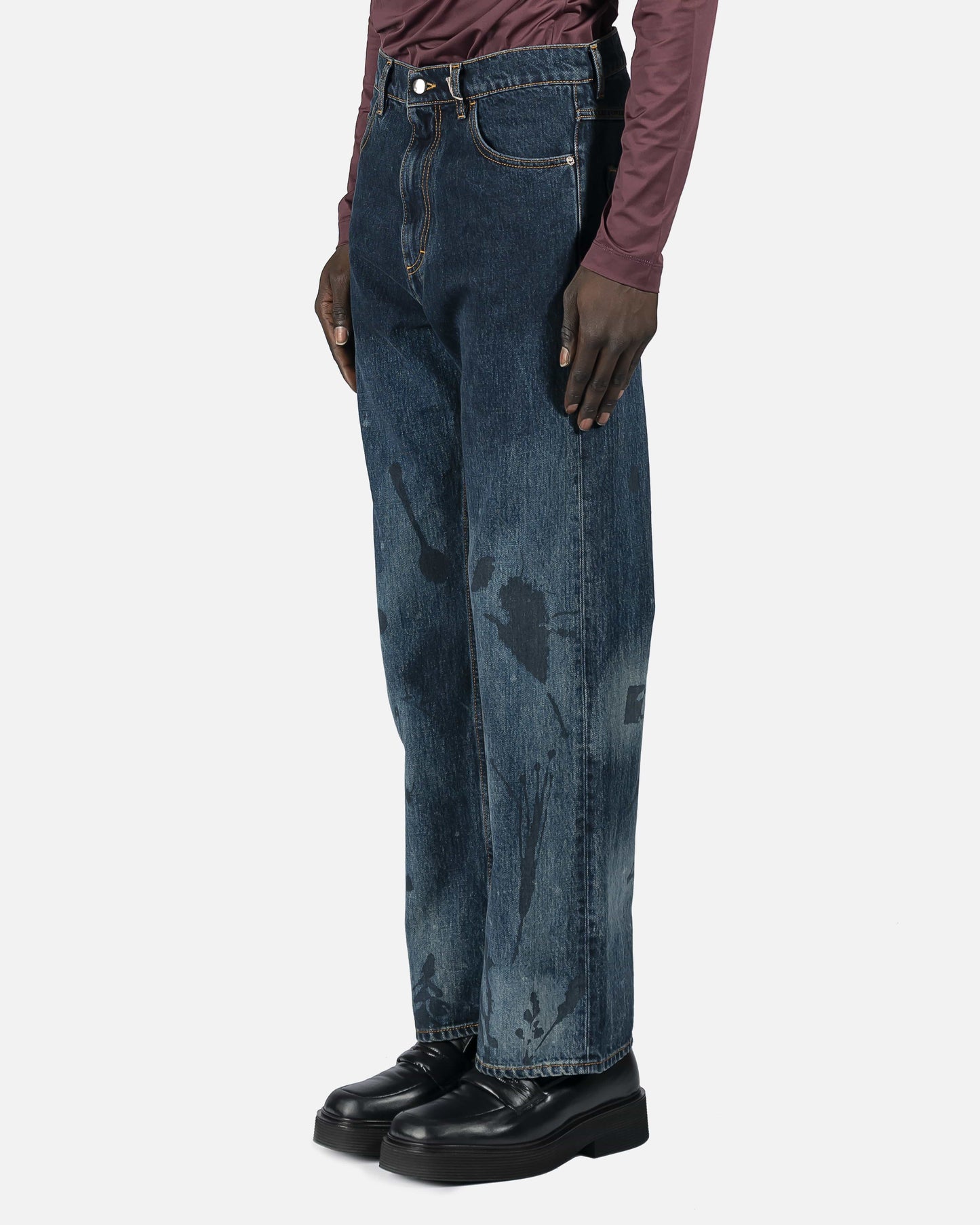 Traditional 5-pocket pants with loose fit and found objects motif corrosion treatment throughout. Branded metal buttons for waistband, zip closure and rivets only on the front. Marni label in leather on the back.
