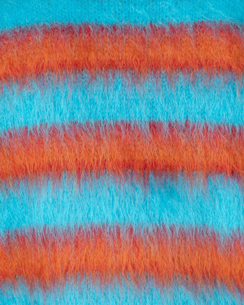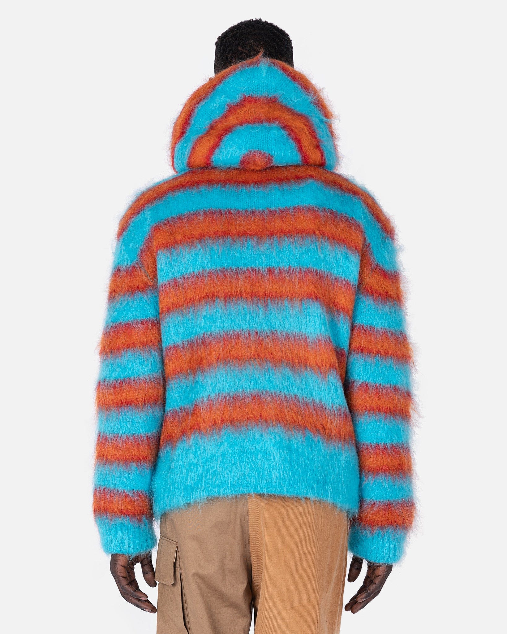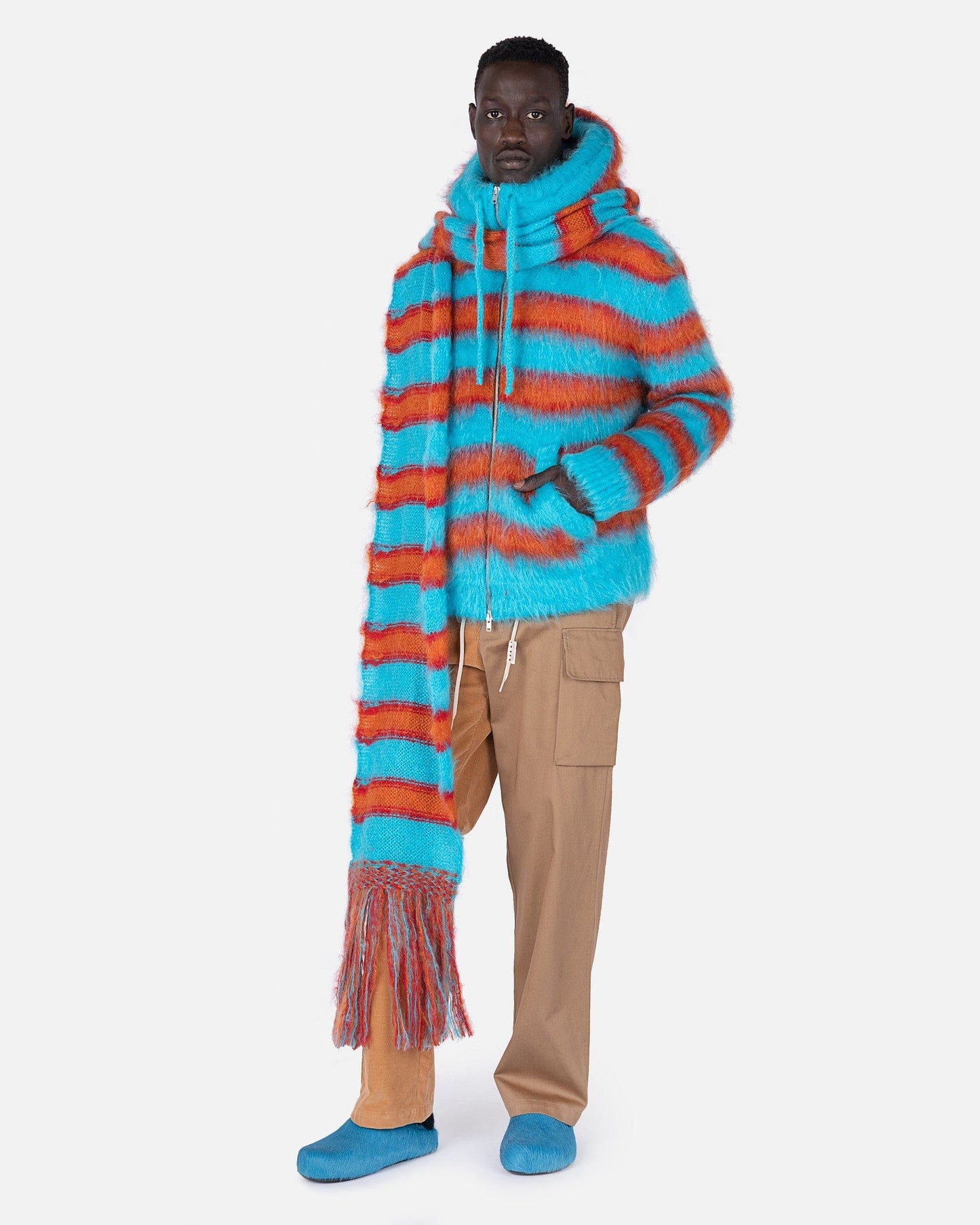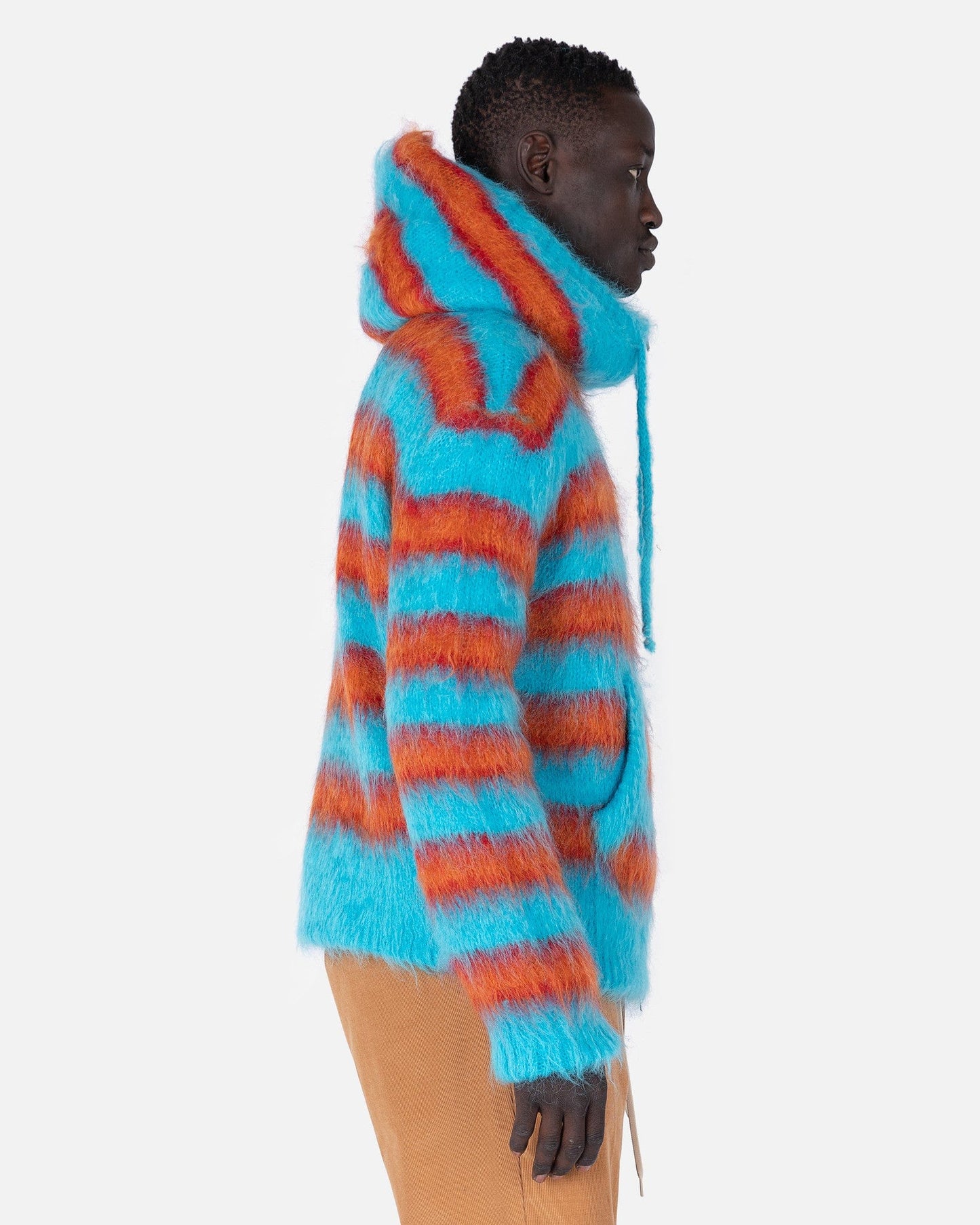 Marni men's mohair zip up hoodie in turquoise. This hooded cardigan is made with the iconic, fuzzy Marni mohair. It features a rainbow stripe pattern and a hood with drawstring closure.