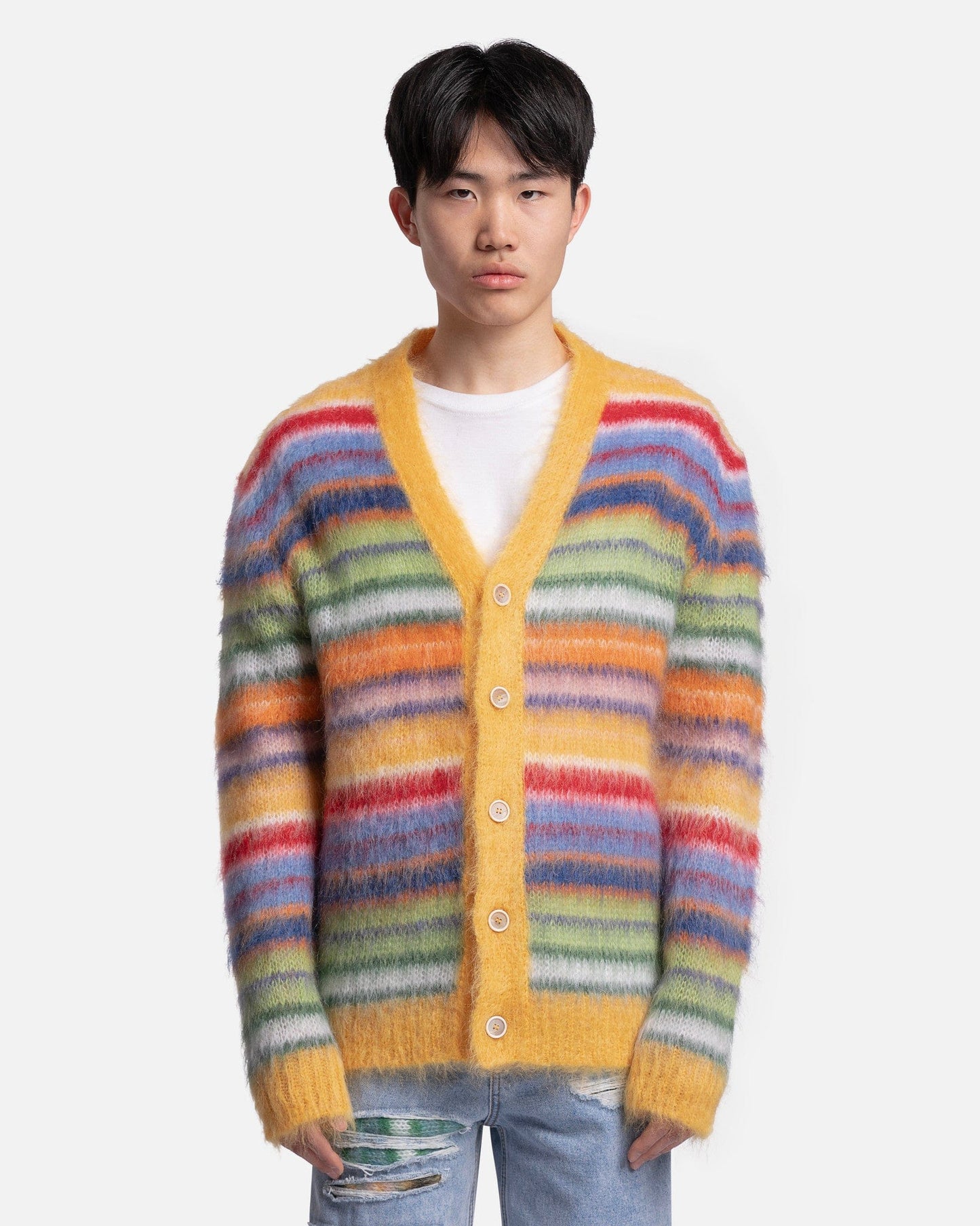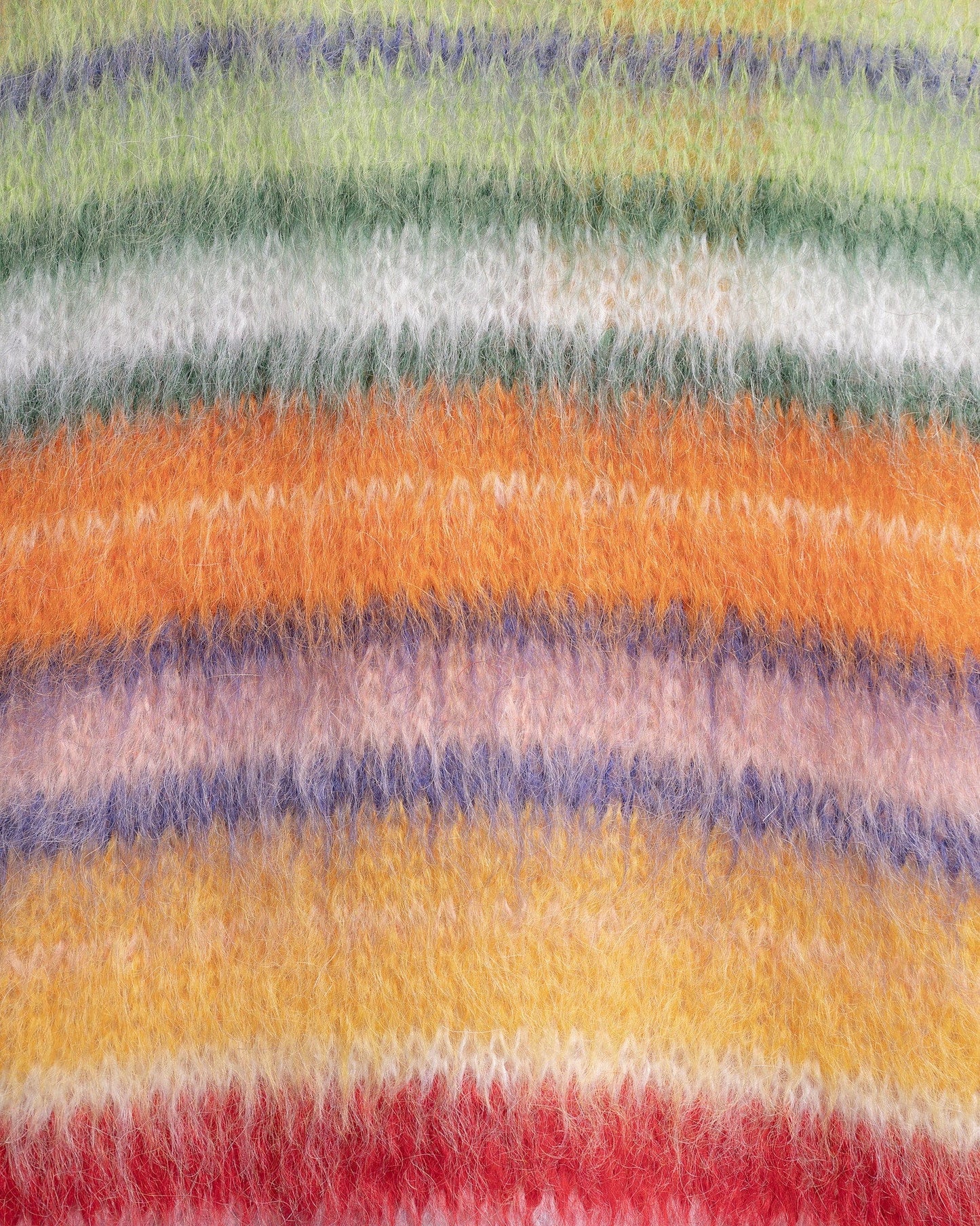 Marni men's long-sleeved v-neck cardigan in multicolor. This striped top is made of a fuzzy mohair blend and has a relaxed fit. It features front button closure and has a white trim along the closure, hem and cuffs.