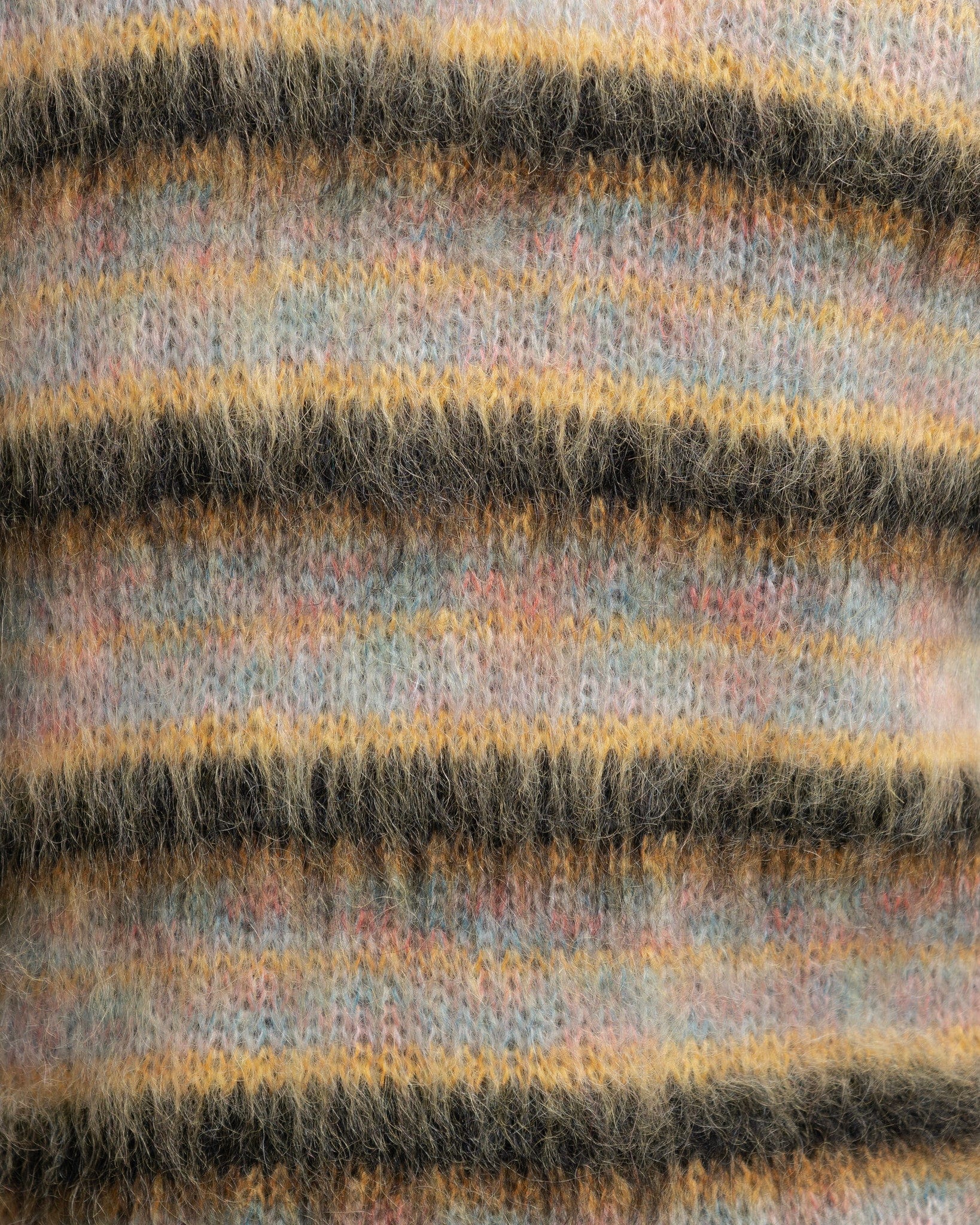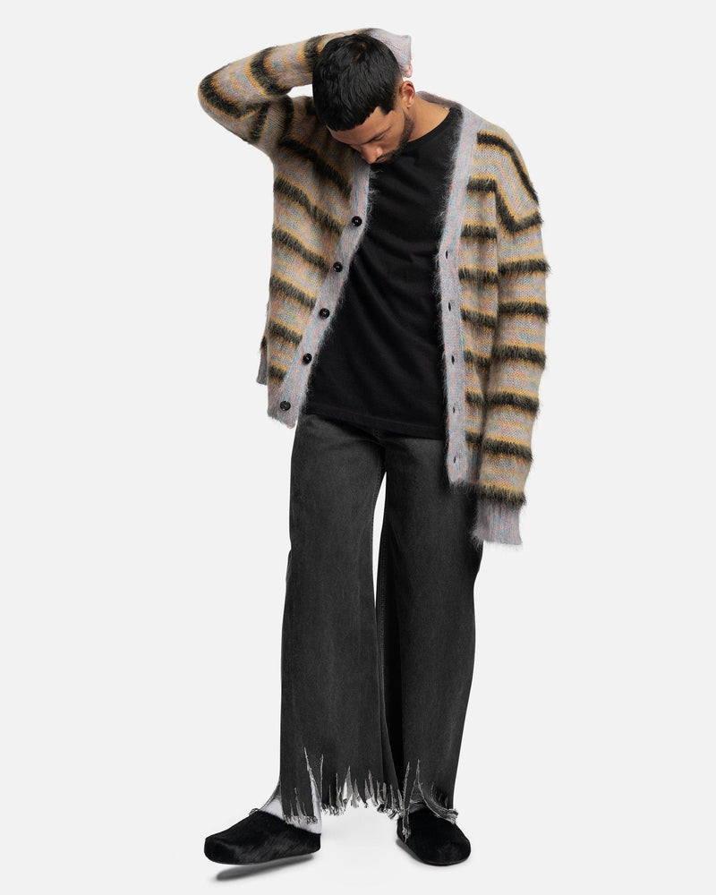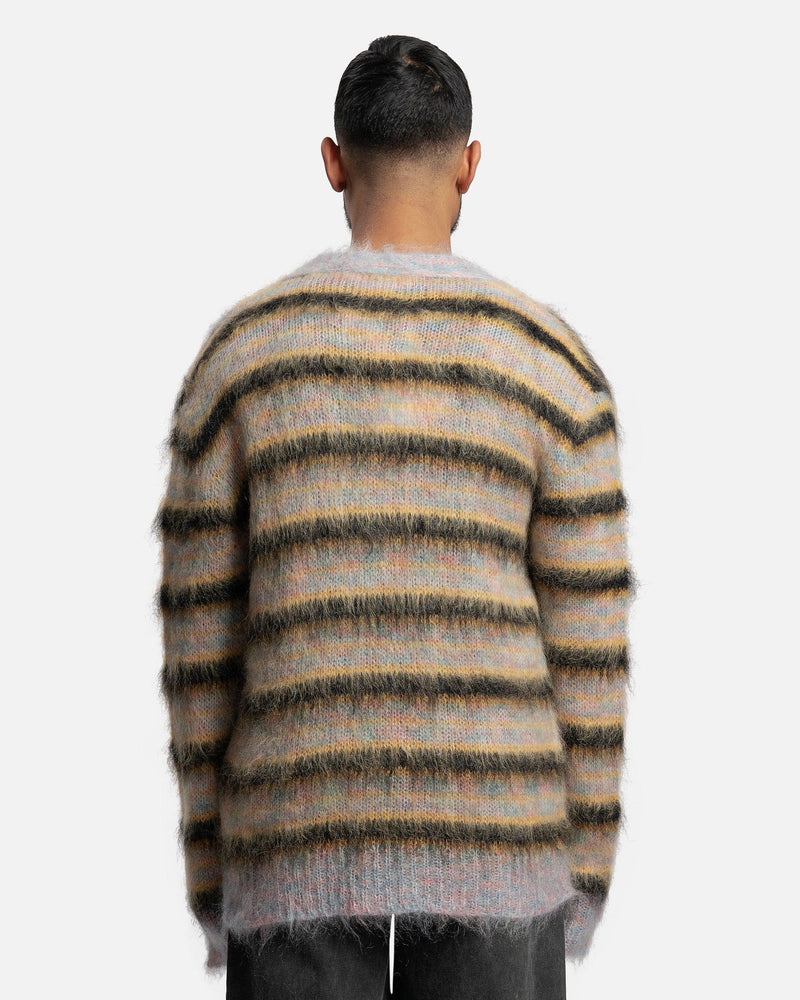 Marni men's long-sleeved v-neck cardigan in multicolor. This striped top is made of a fuzzy mohair blend and has a relaxed fit. It features front button closure and has a white trim along the closure, hem and cuffs. The interior features the 'fuzzy wuzzy mohair' satin label along the nape.
