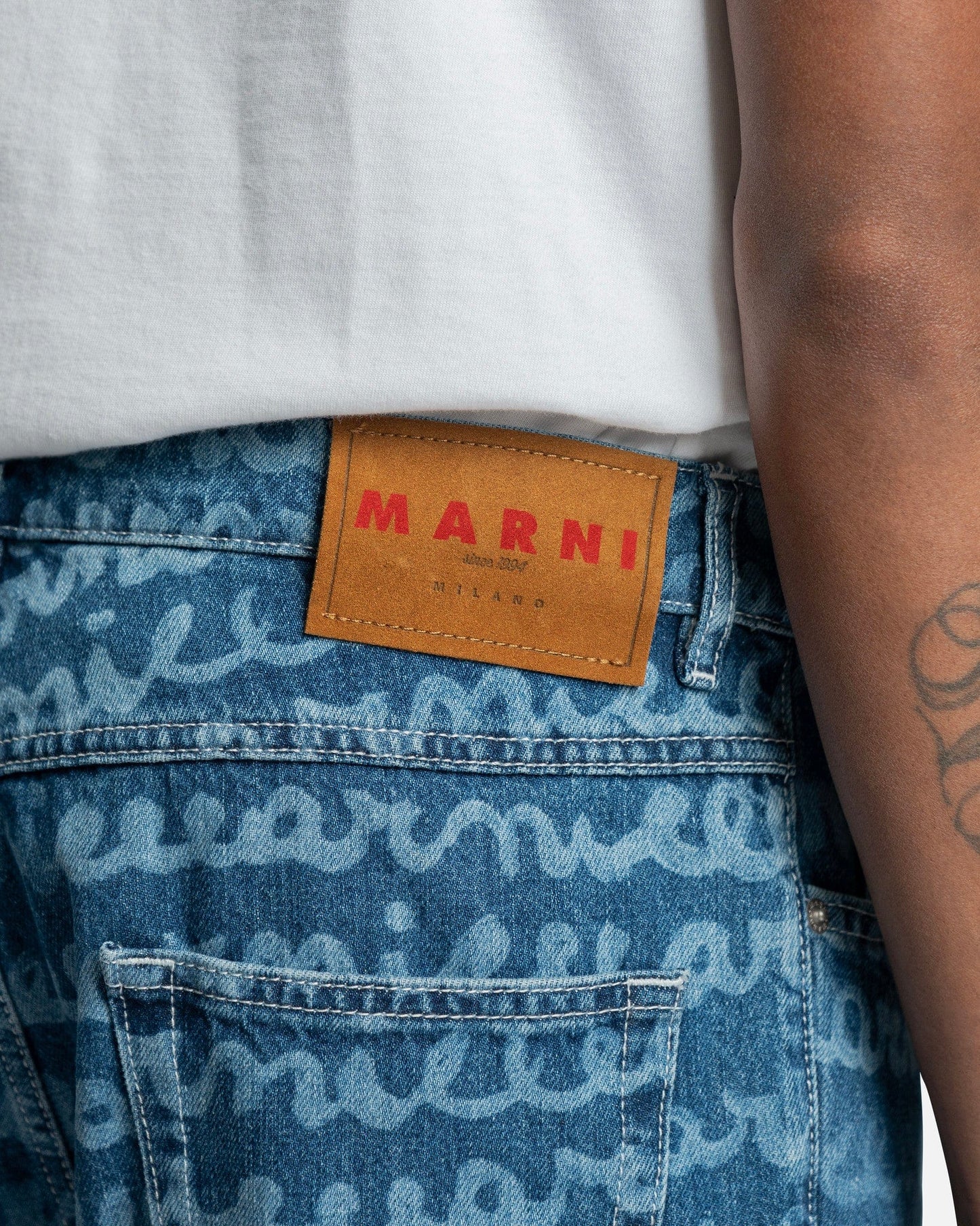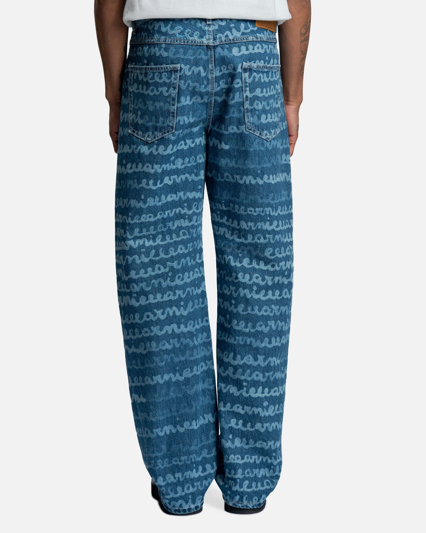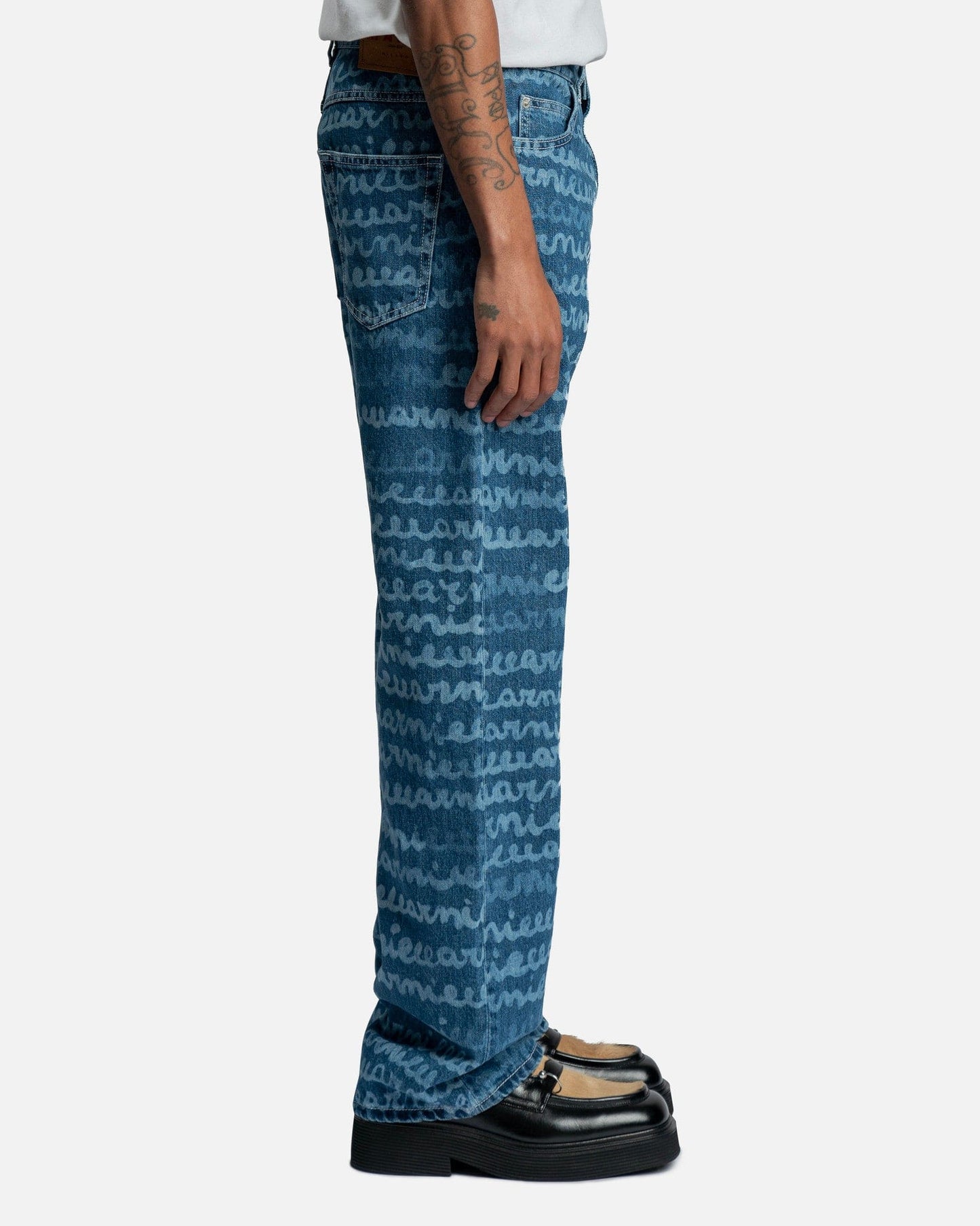 Marni men's jeans in blue. These jeans have a straight leg fit, a five-pocket, and an allover cursive logo print.