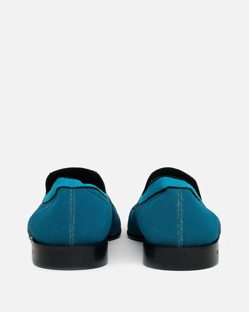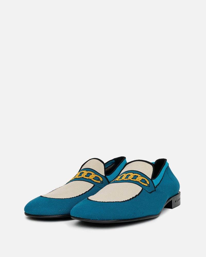 Marni men's jacquard knit moccasins in blue. These shoes have a stretch knit fabric upper with a Trompe L'oeil jacquard effect. The sole is rubber and the insole is leather.
