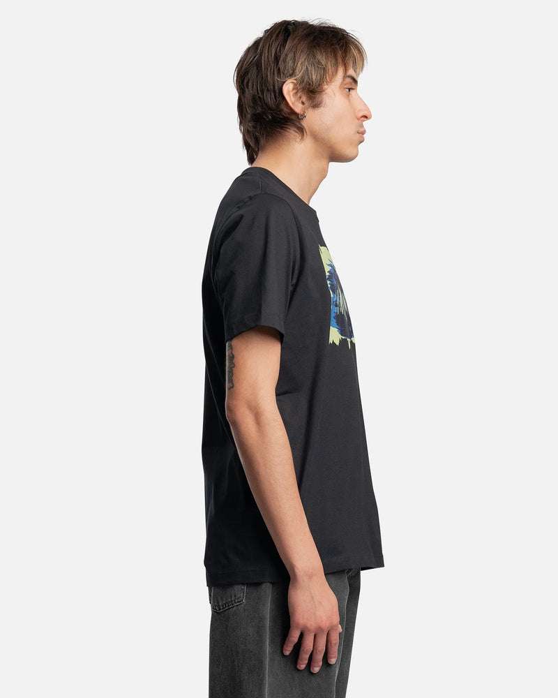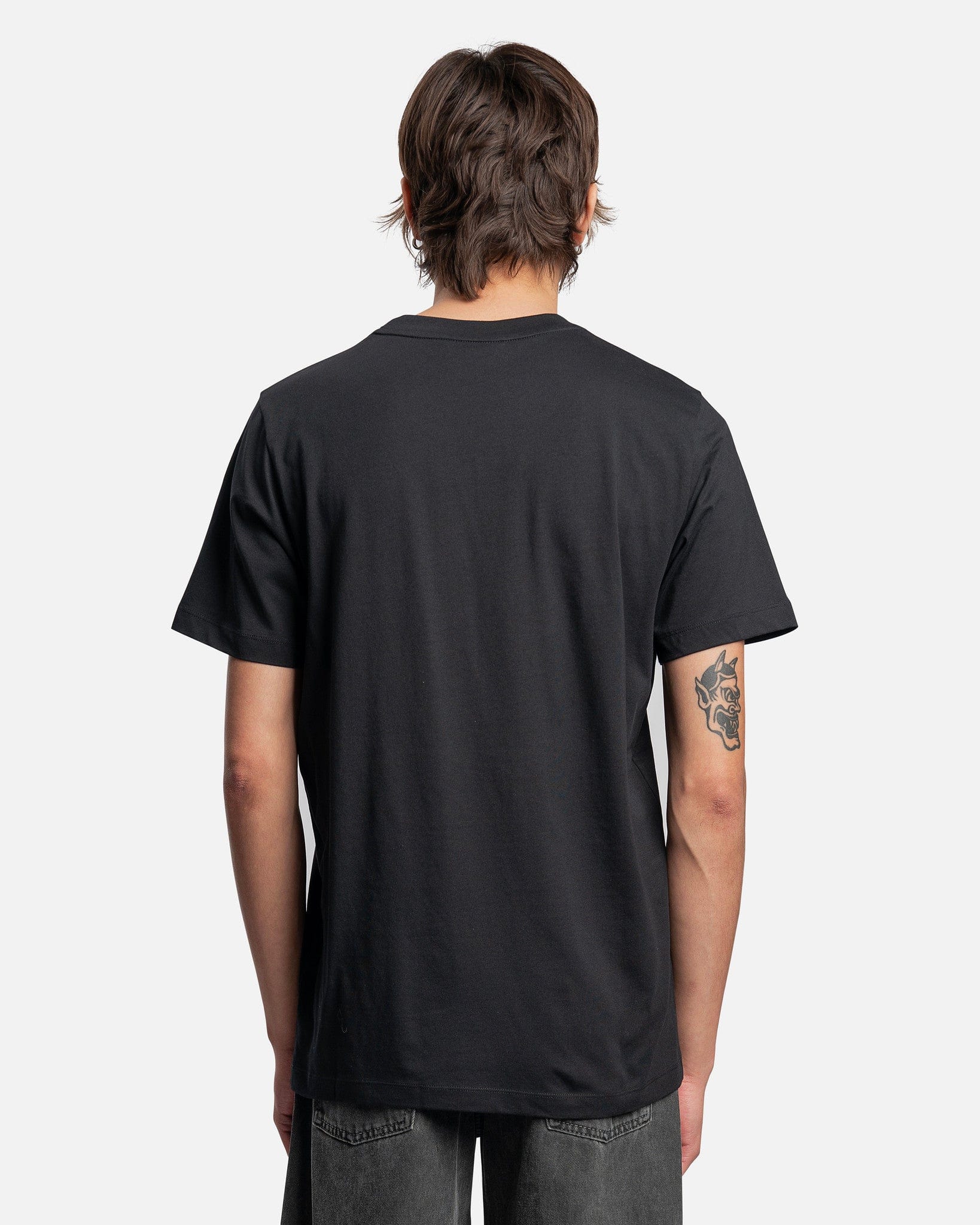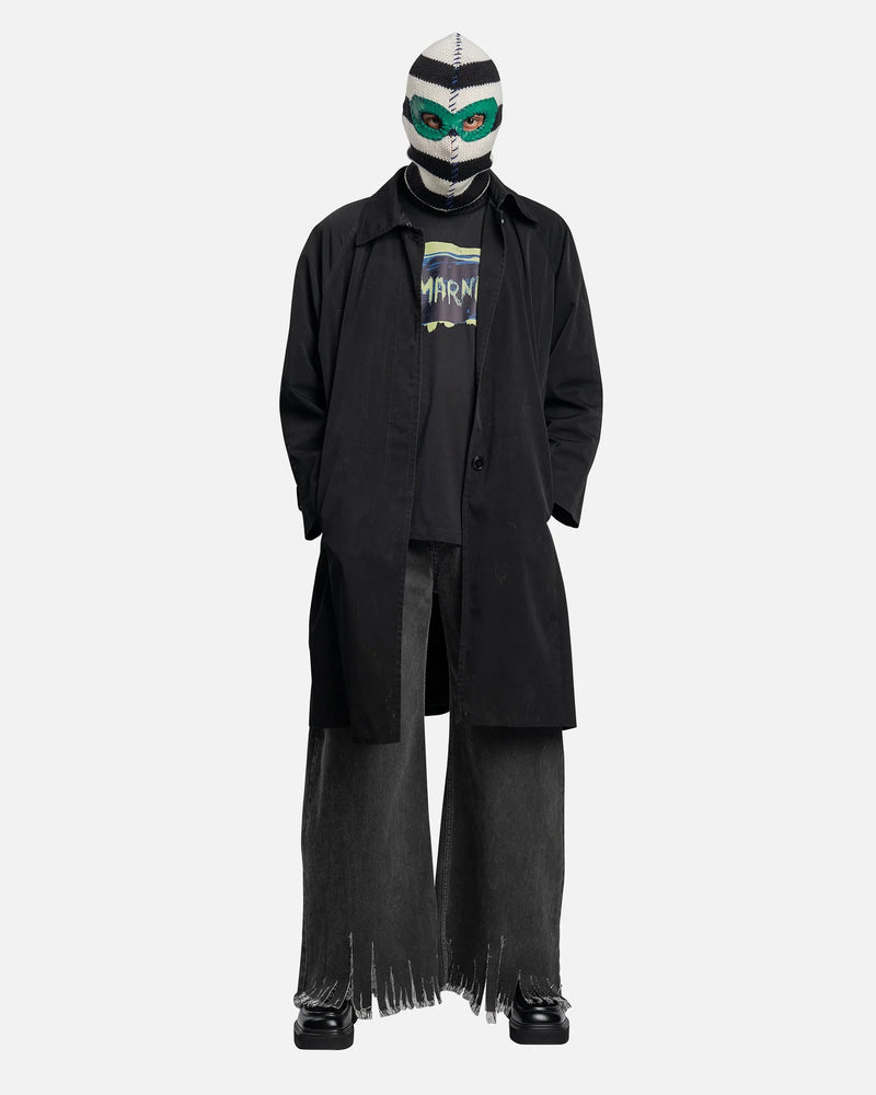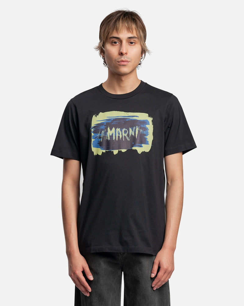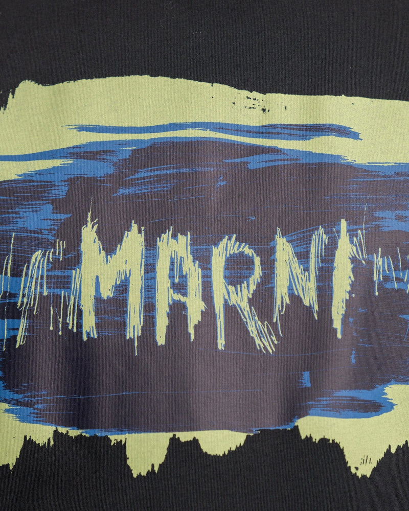 Marni men's graphic t-shirt in black. This top features a rib knit crewneck collar and painted logo graphic printed on the chest.