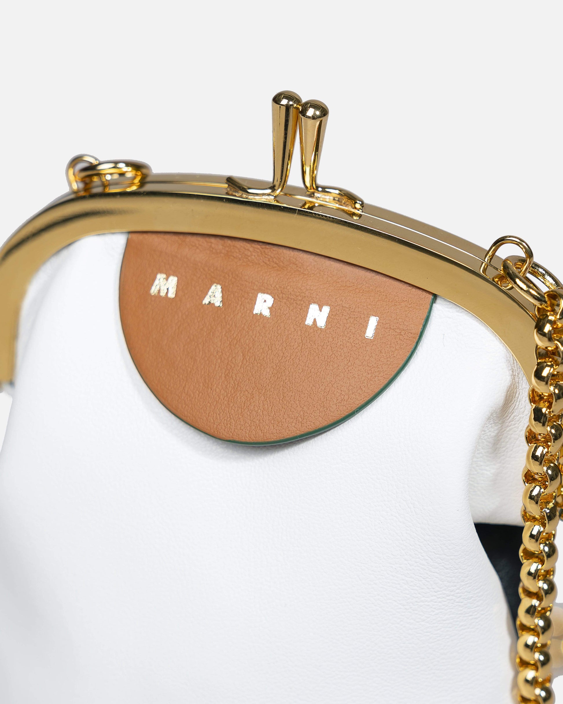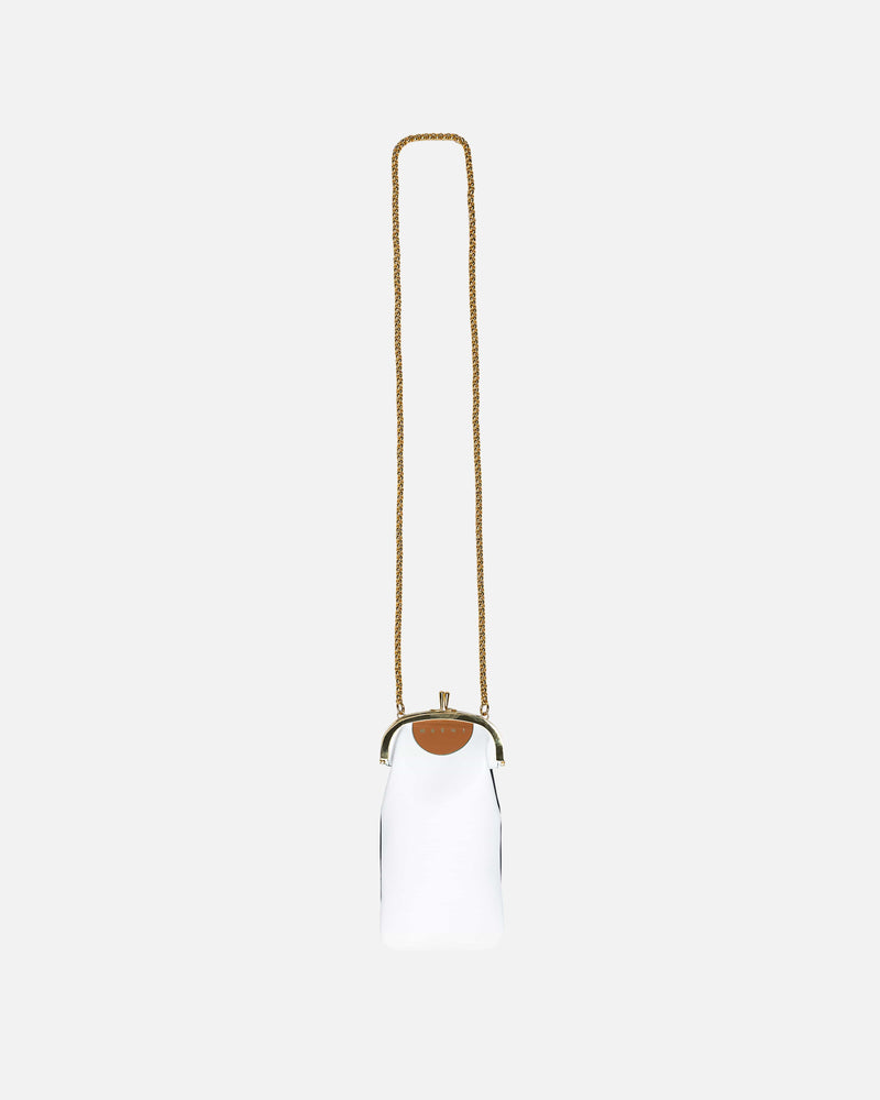 Bi-coloured phone case from Marni in a smooth calf leather, featuring a hinged structure, snap-lock, wrist chain and snap link in gold-tone metal, MARNI logo and cotton lining.