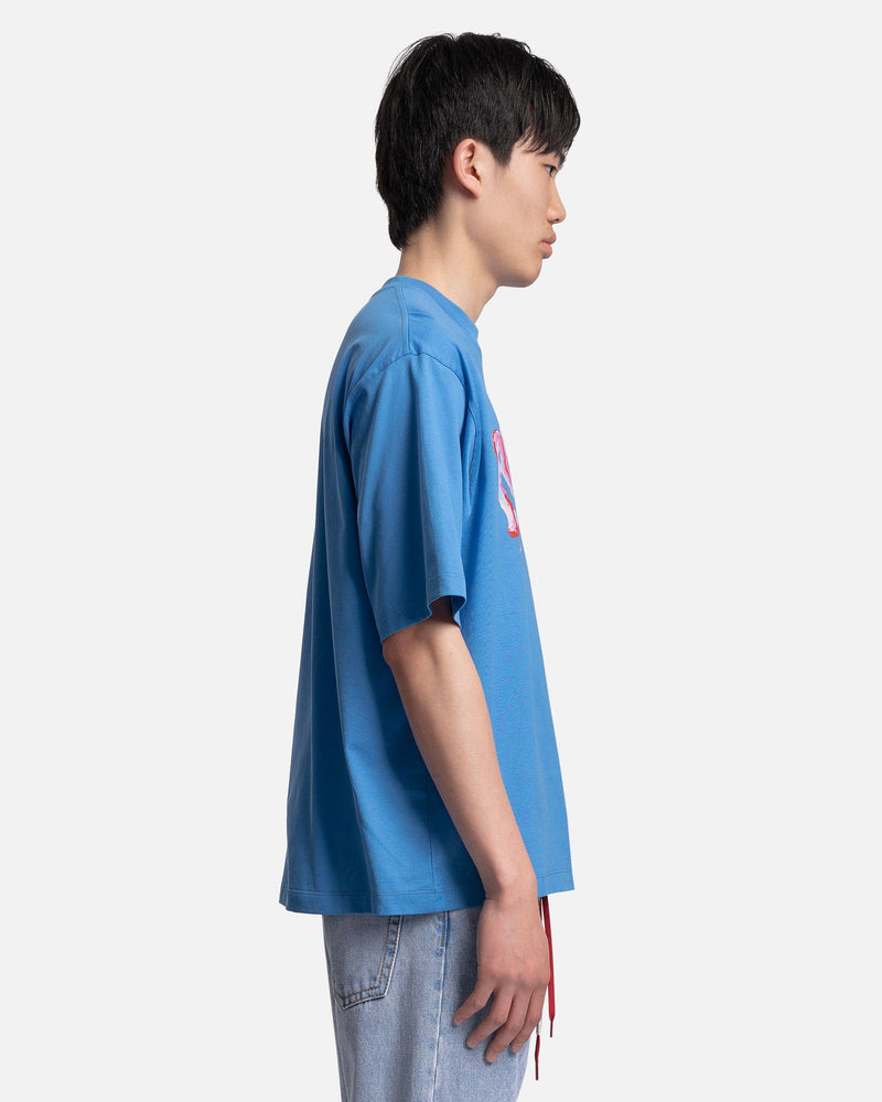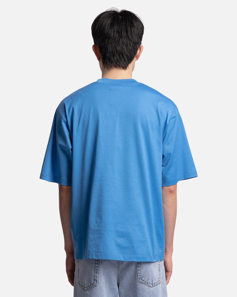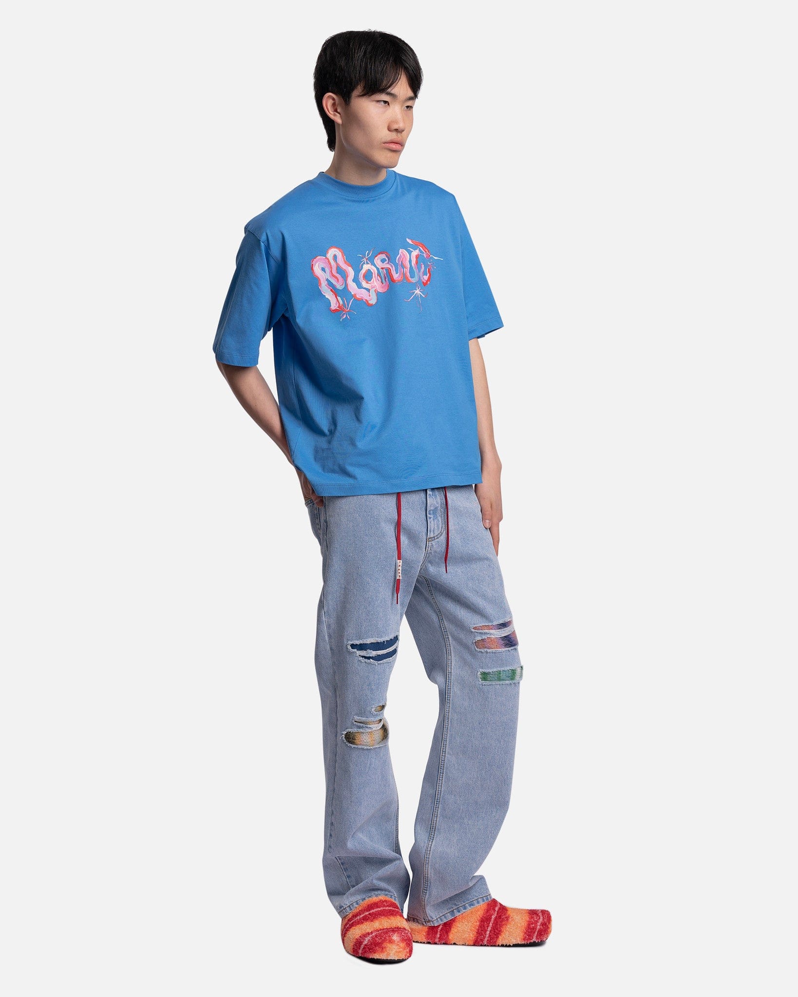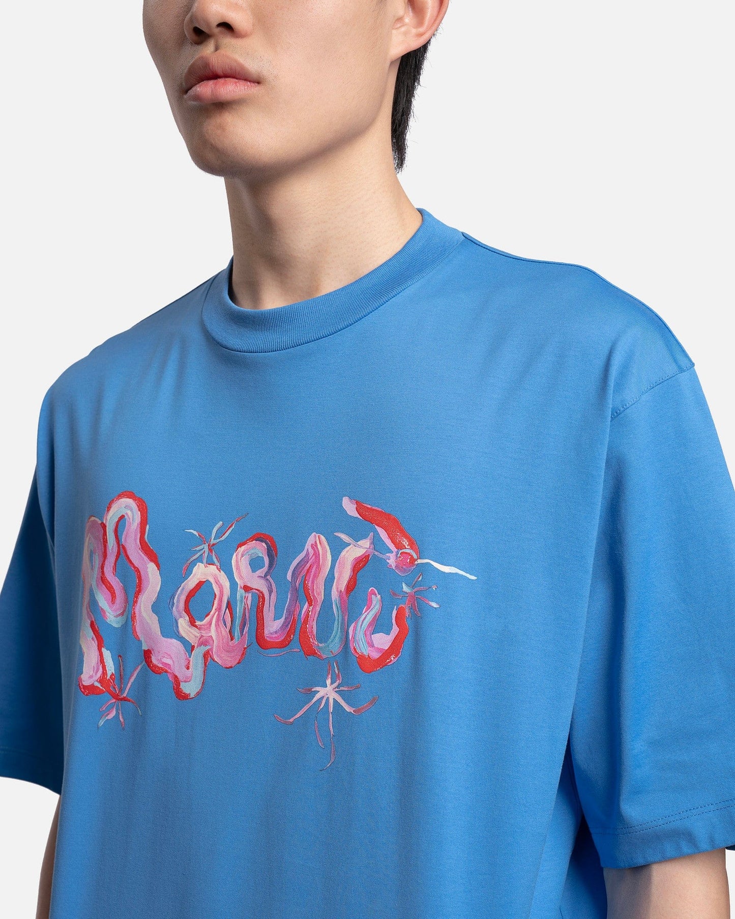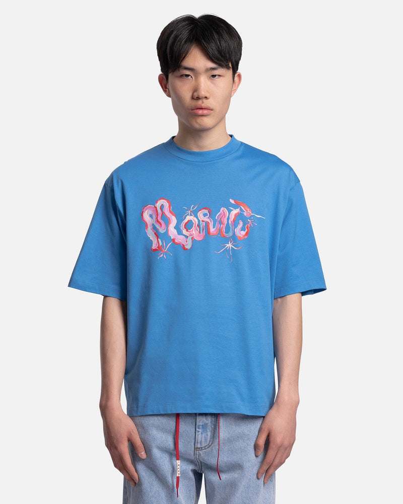 Marni men's graphic t-shirt in blue. This shirt features dropped shoulders and oversized short sleeves with a whimsical logo graphic on the chest.