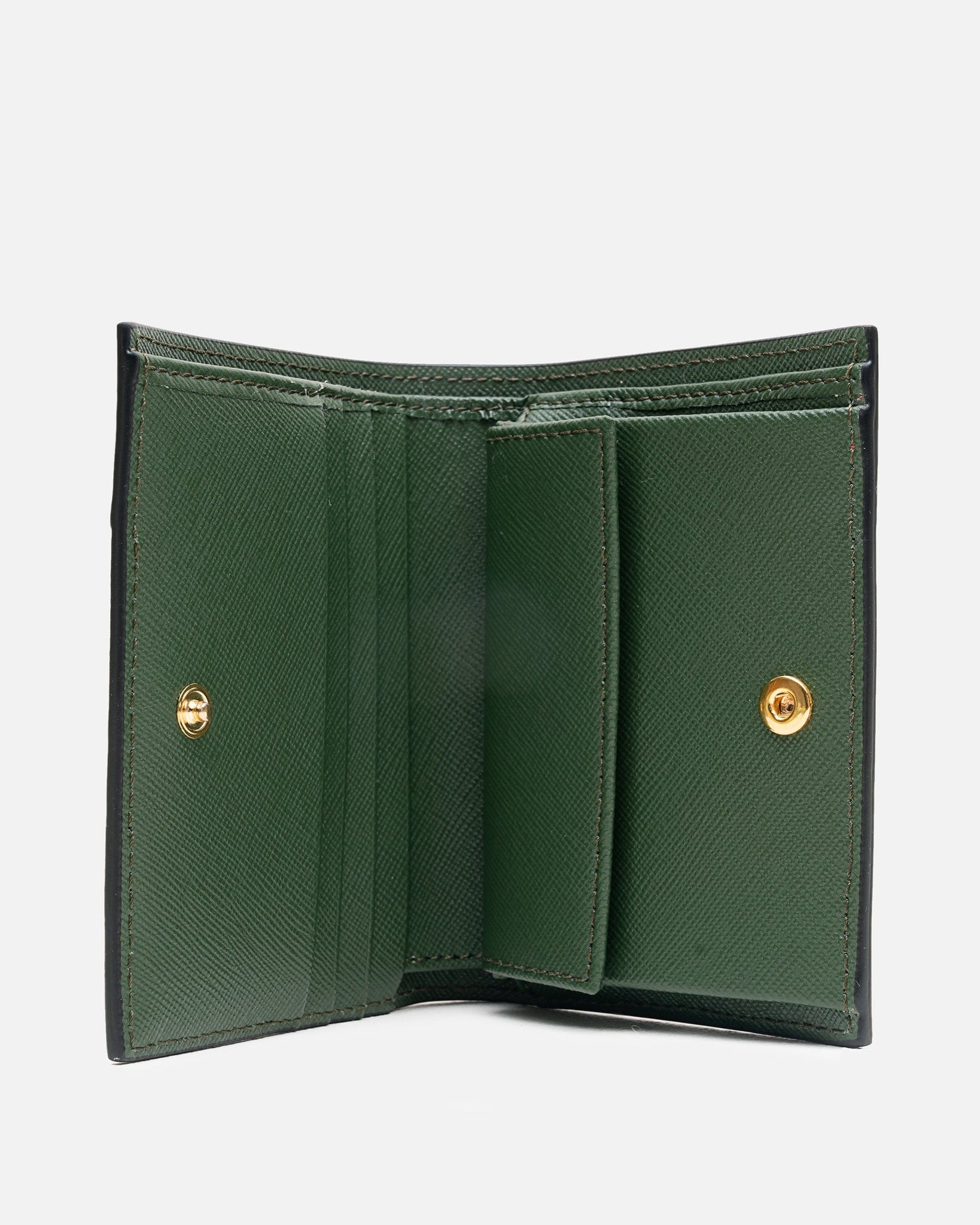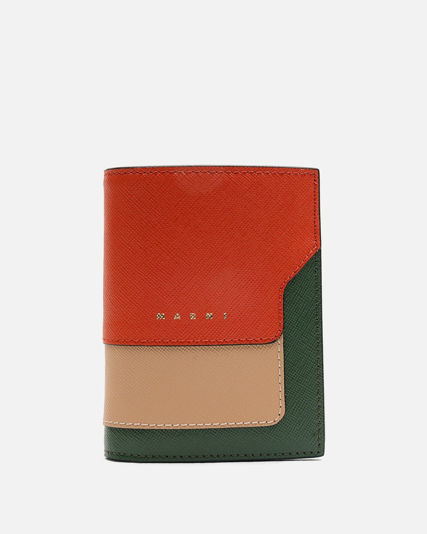 Marni colorblock bifold wallet in multicolor. This leather bifold uses snap closure and has one note compartment, four card slots and one coin pocket. The Marni logo is printed in gold across the front.