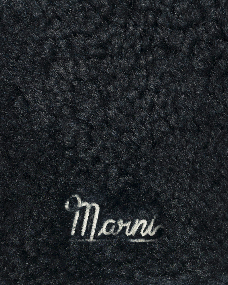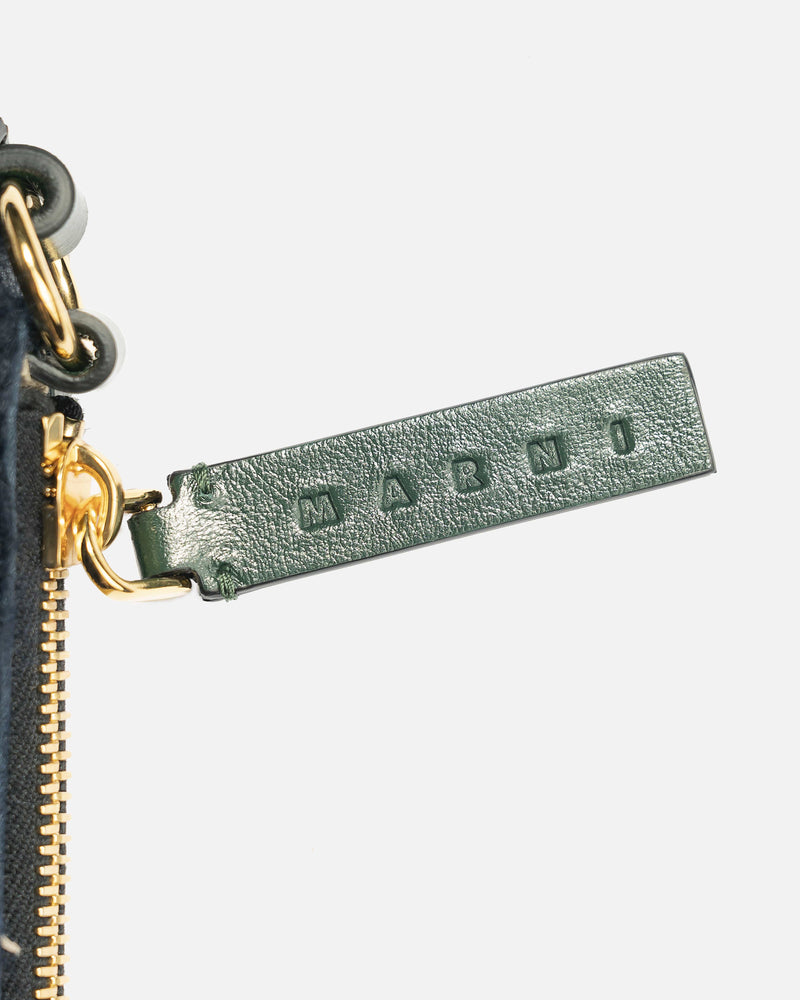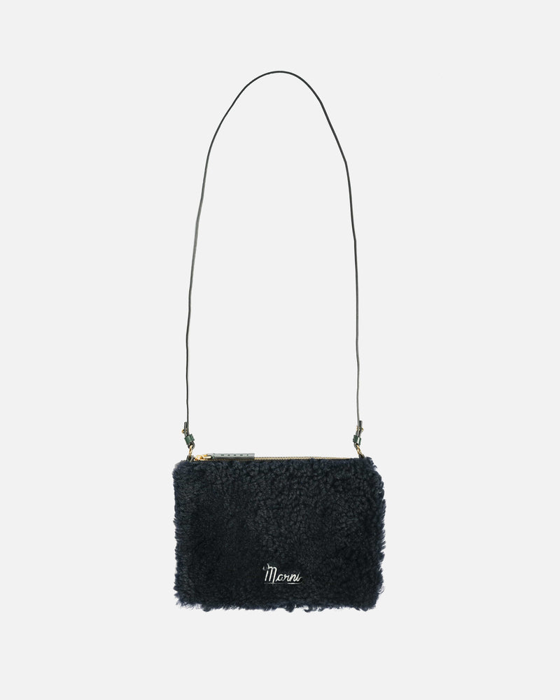 Crossbody bag with shearling front and leather at back. Embroidered Marni script logo on shearling side as well as debossed zipper pull. Canvas interior with green leather card organizer. Detachable strap with accompanying gold tone hardware.