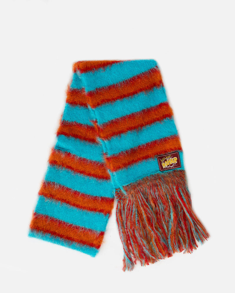 Marni striped scarf in turquoise and orange. This wool scarf has a Marni logo patch in maroon stitched onto the front bottom above the tassels.