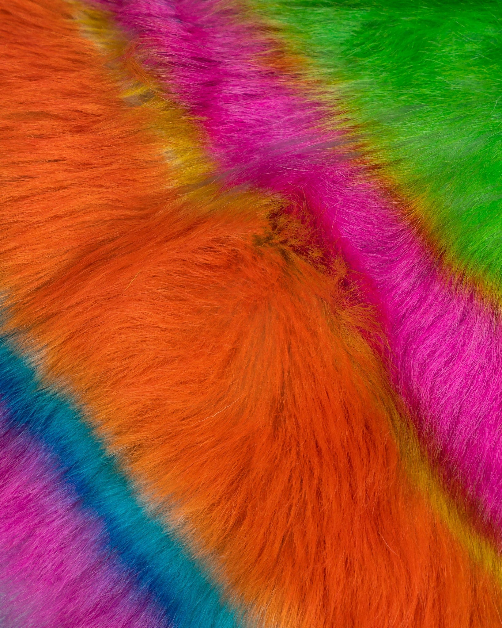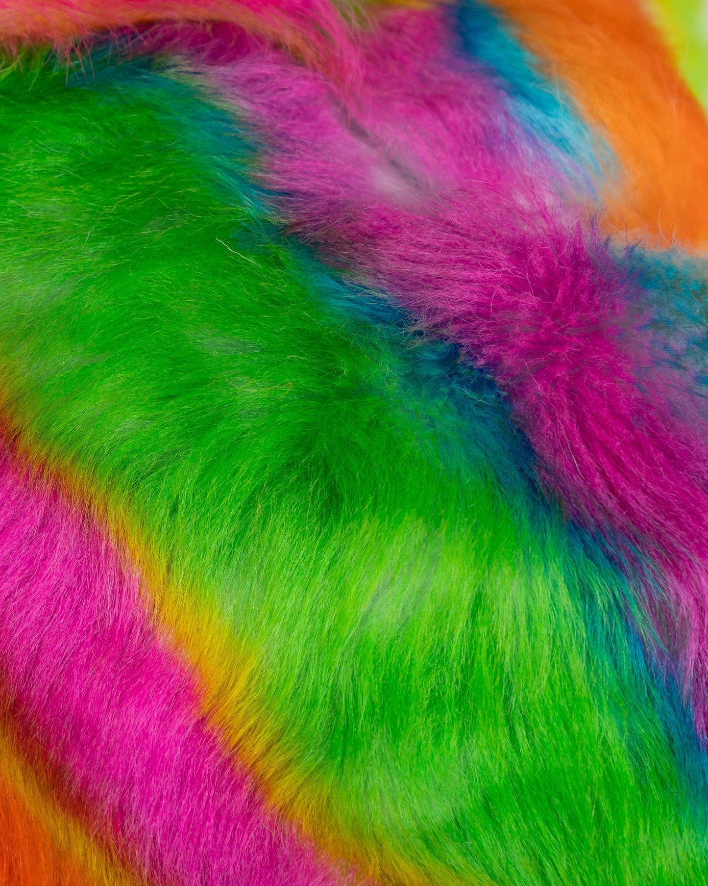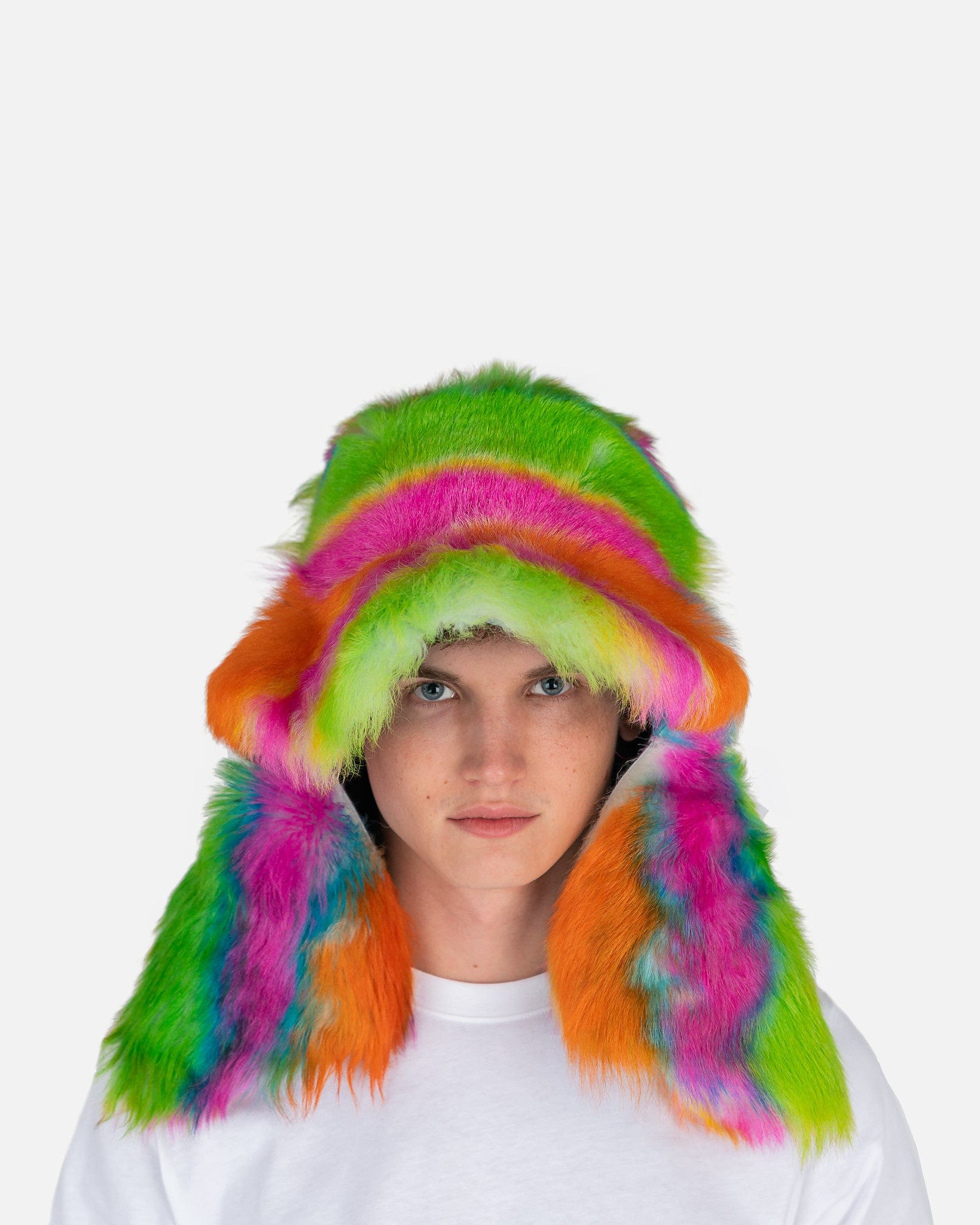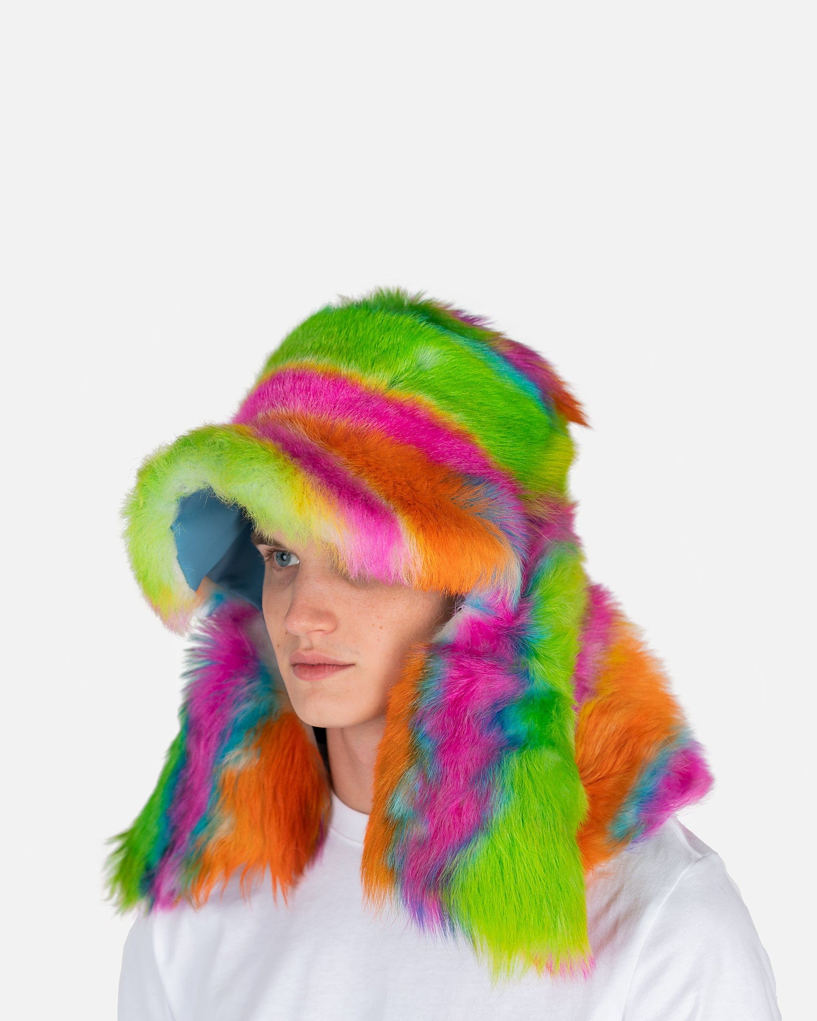Marni rainbow striped shearling hat. This oversized furry hat has a visor cap and ear flaps and back flaps.