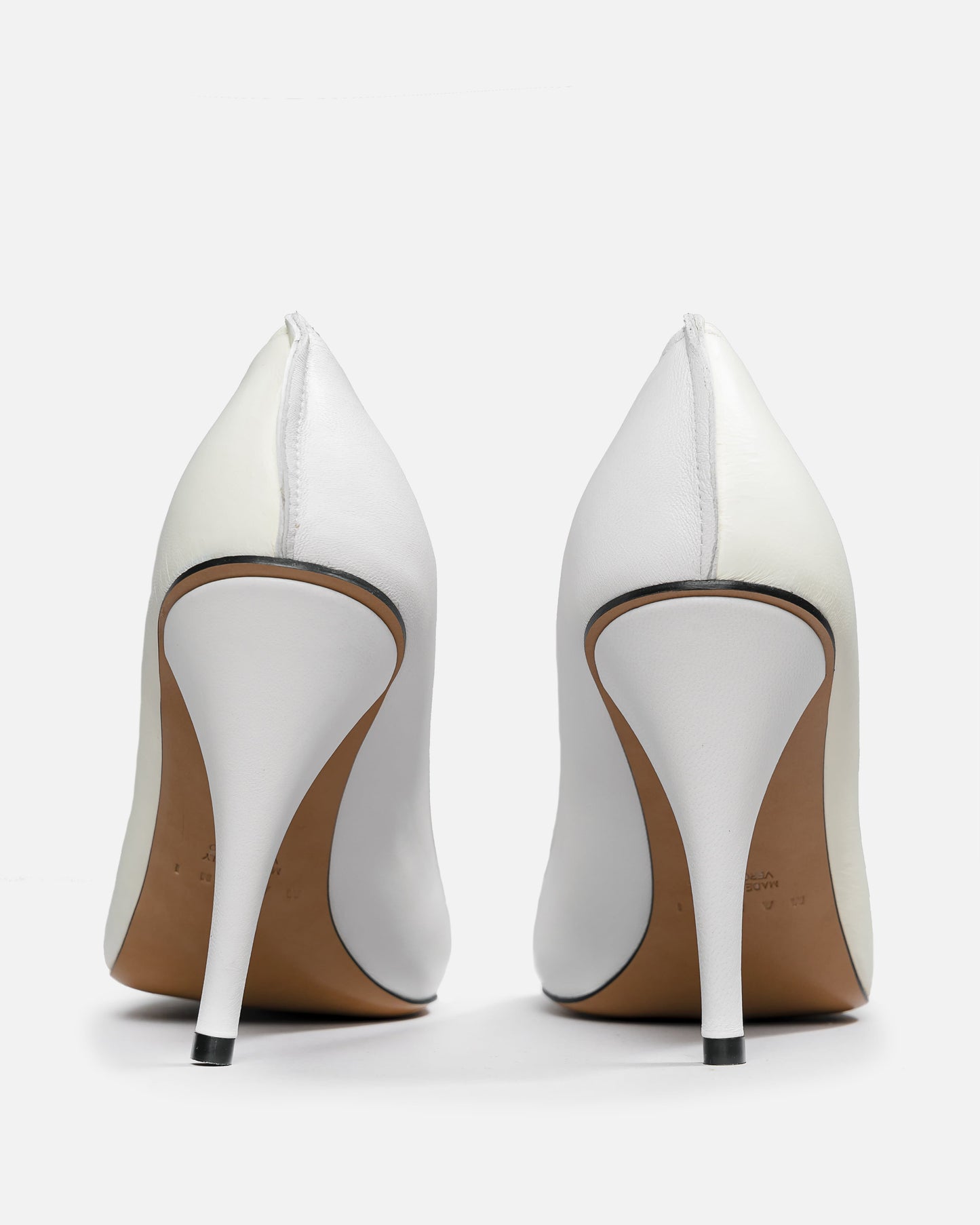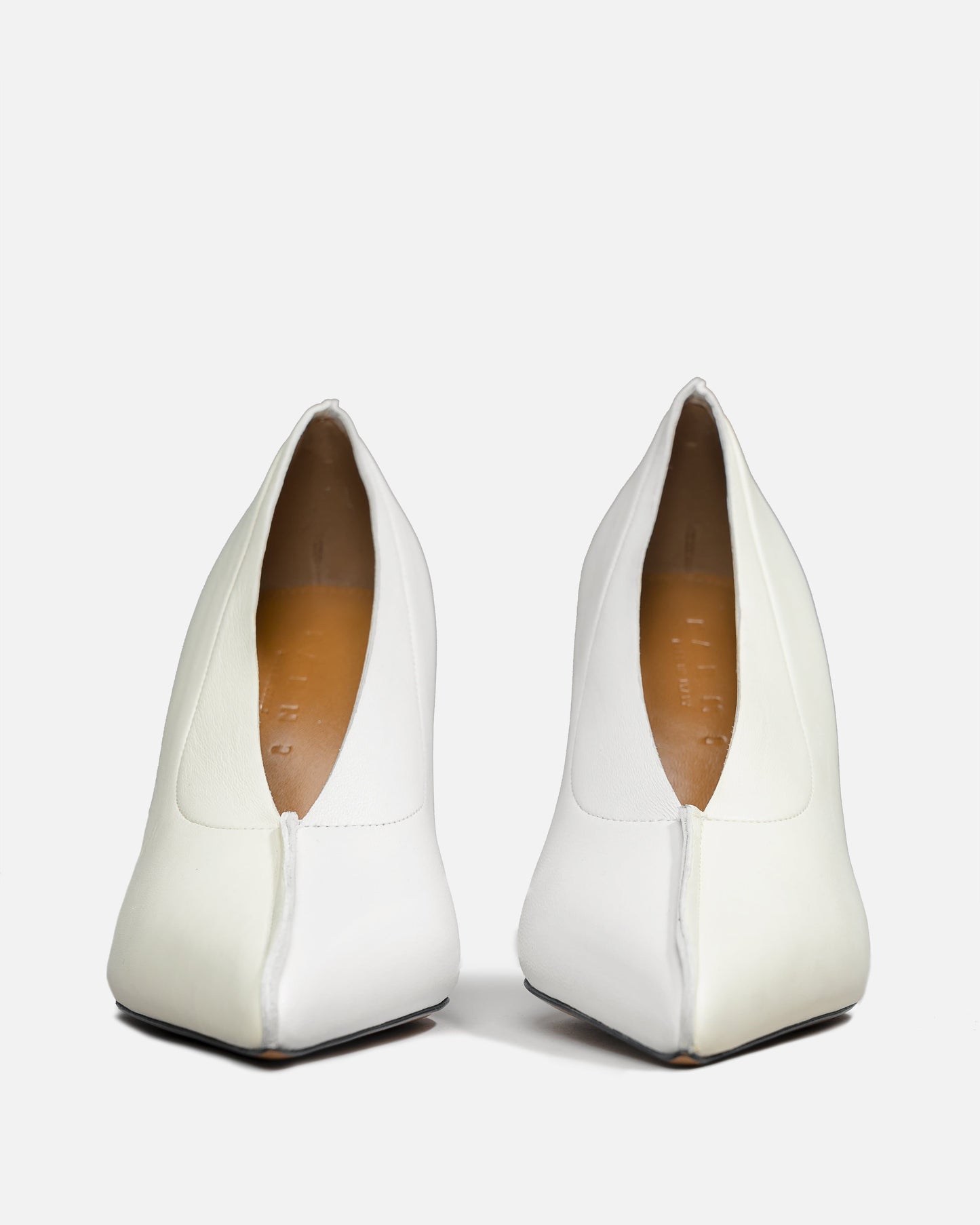 Two-tone style nappa leather pump. Pointed toe with relieved joint and raw-edges. Leather sole with nappa-covered heel.