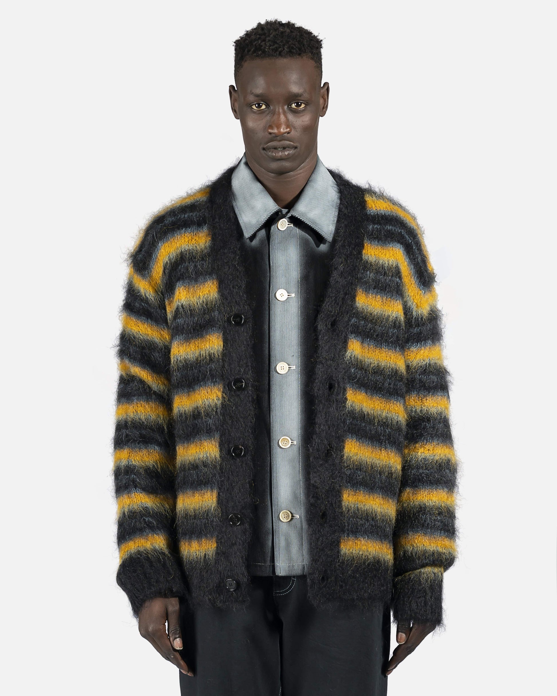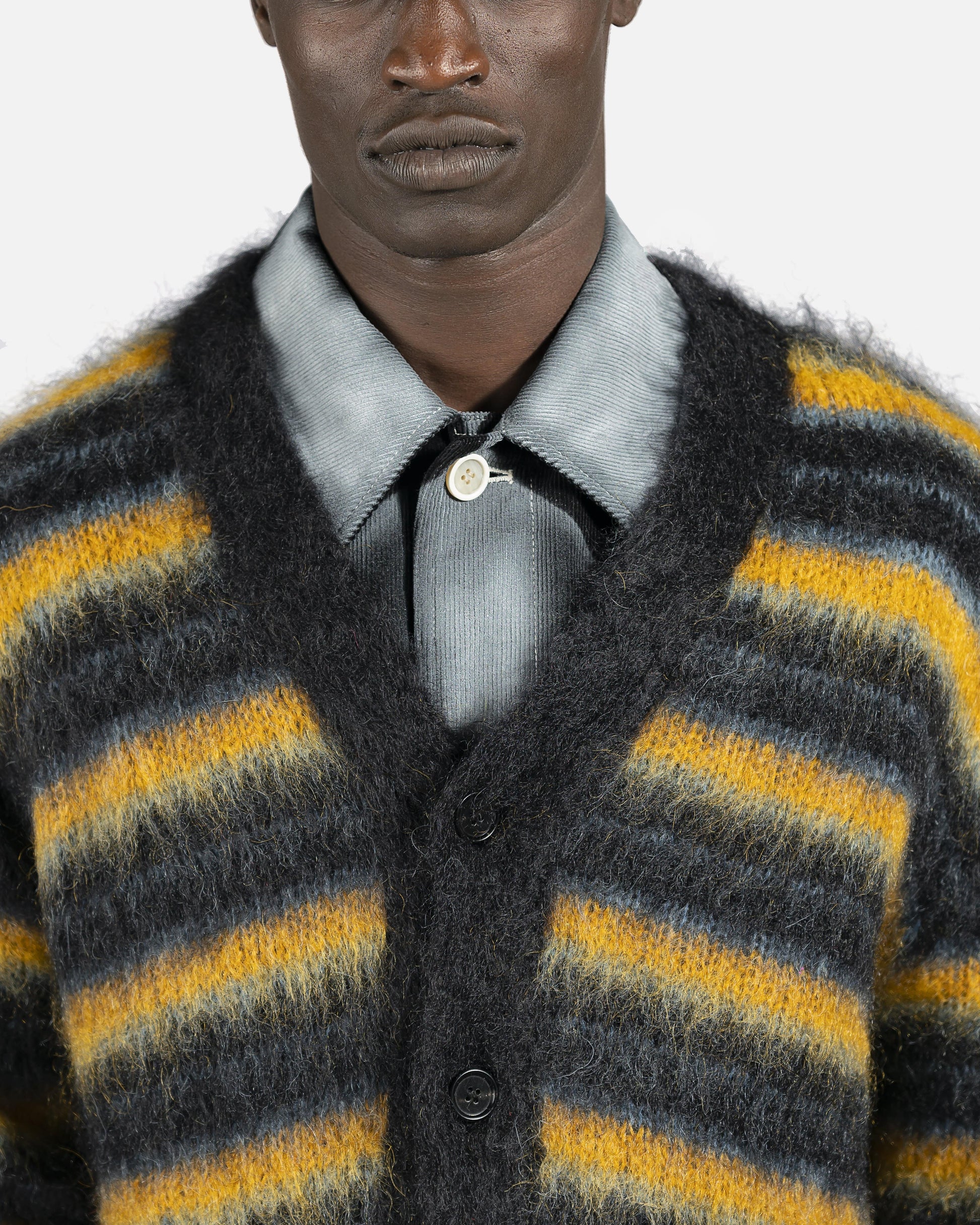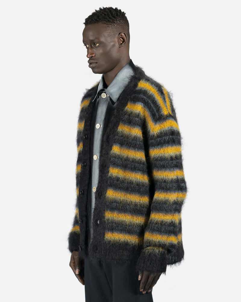 Long-sleeved v-neck cardigan in striped brushed wool blend, relaxed fit, ribbed cuffs and bottom, 'fuzzy wuzzy mohair' satin label inside.