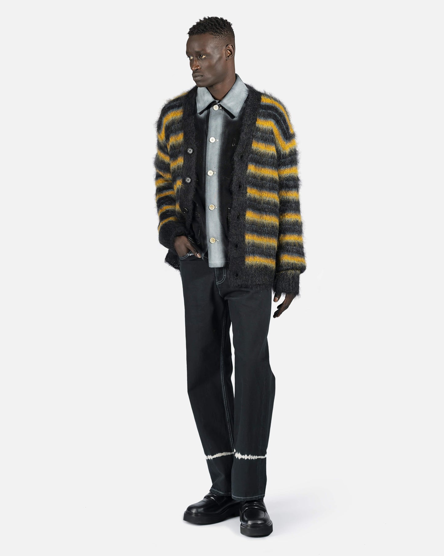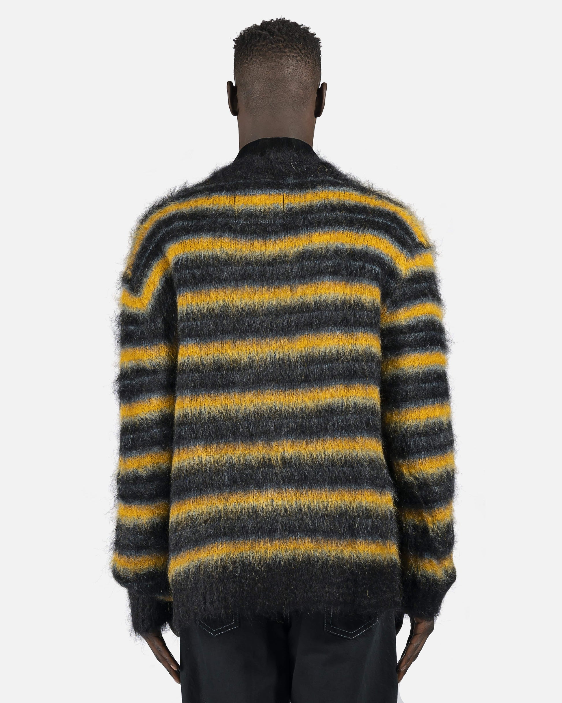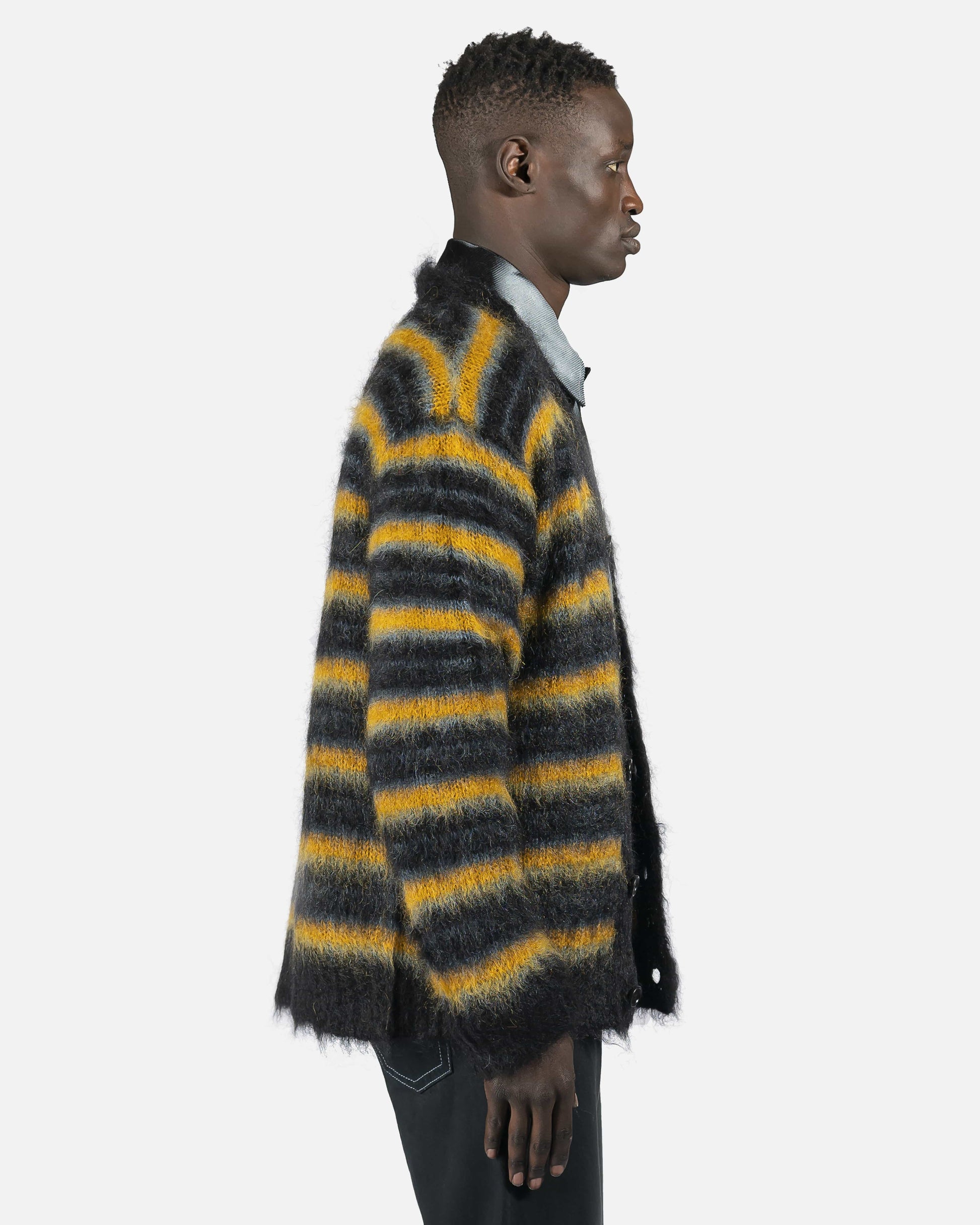 Long-sleeved v-neck cardigan in striped brushed wool blend, relaxed fit, ribbed cuffs and bottom, 'fuzzy wuzzy mohair' satin label inside.